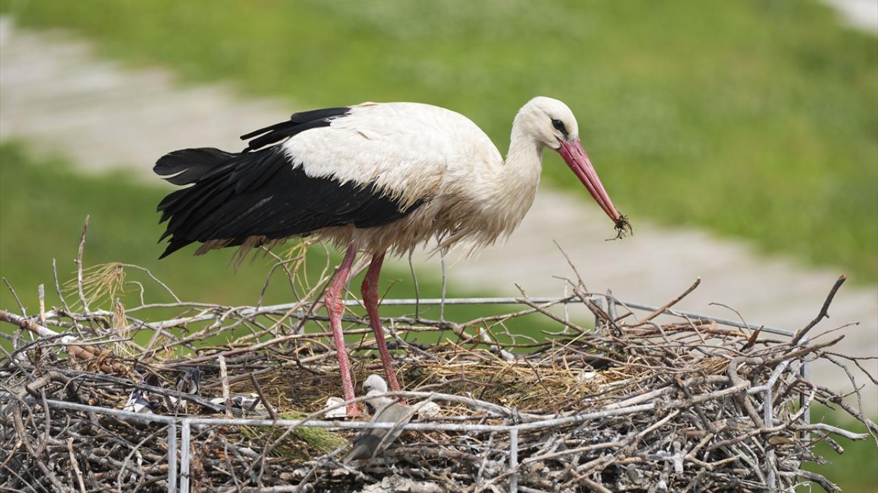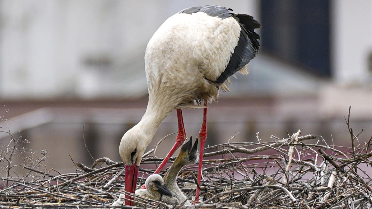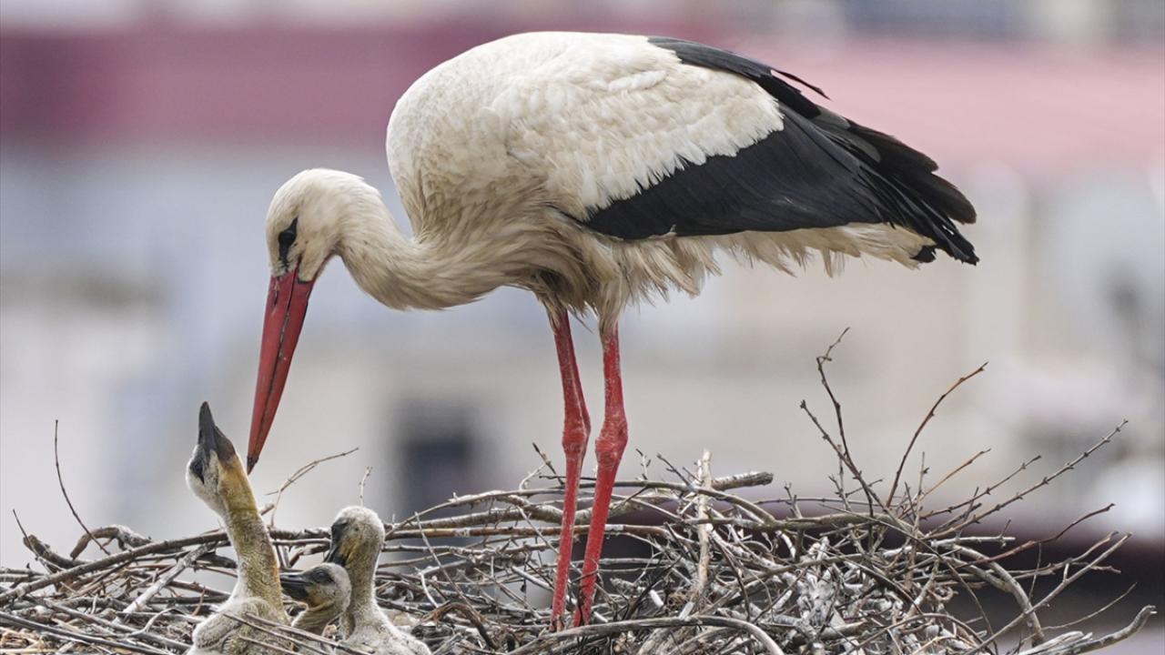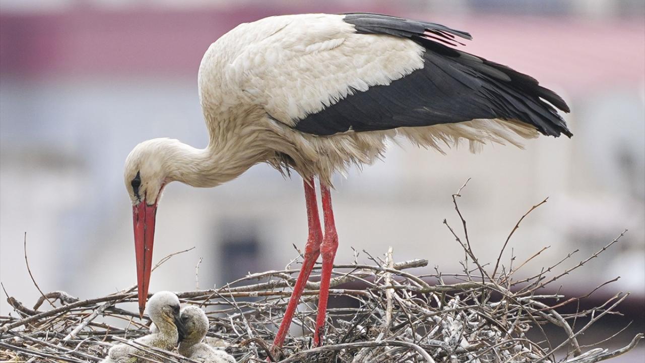 Selçuk ilçe merkezinde 14. yüzyılda yapılan Akıncılar Mescidi`nin minaresine yuva yapan leylek, yavrularını beslerken görüntülendi.