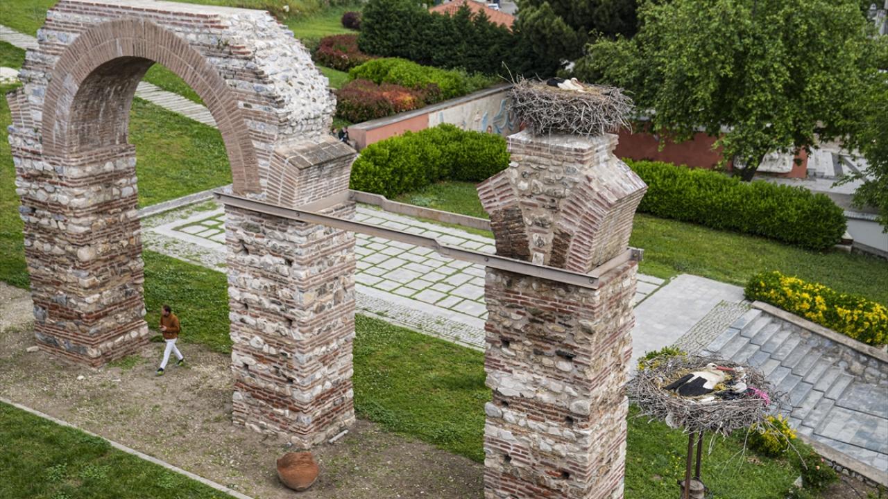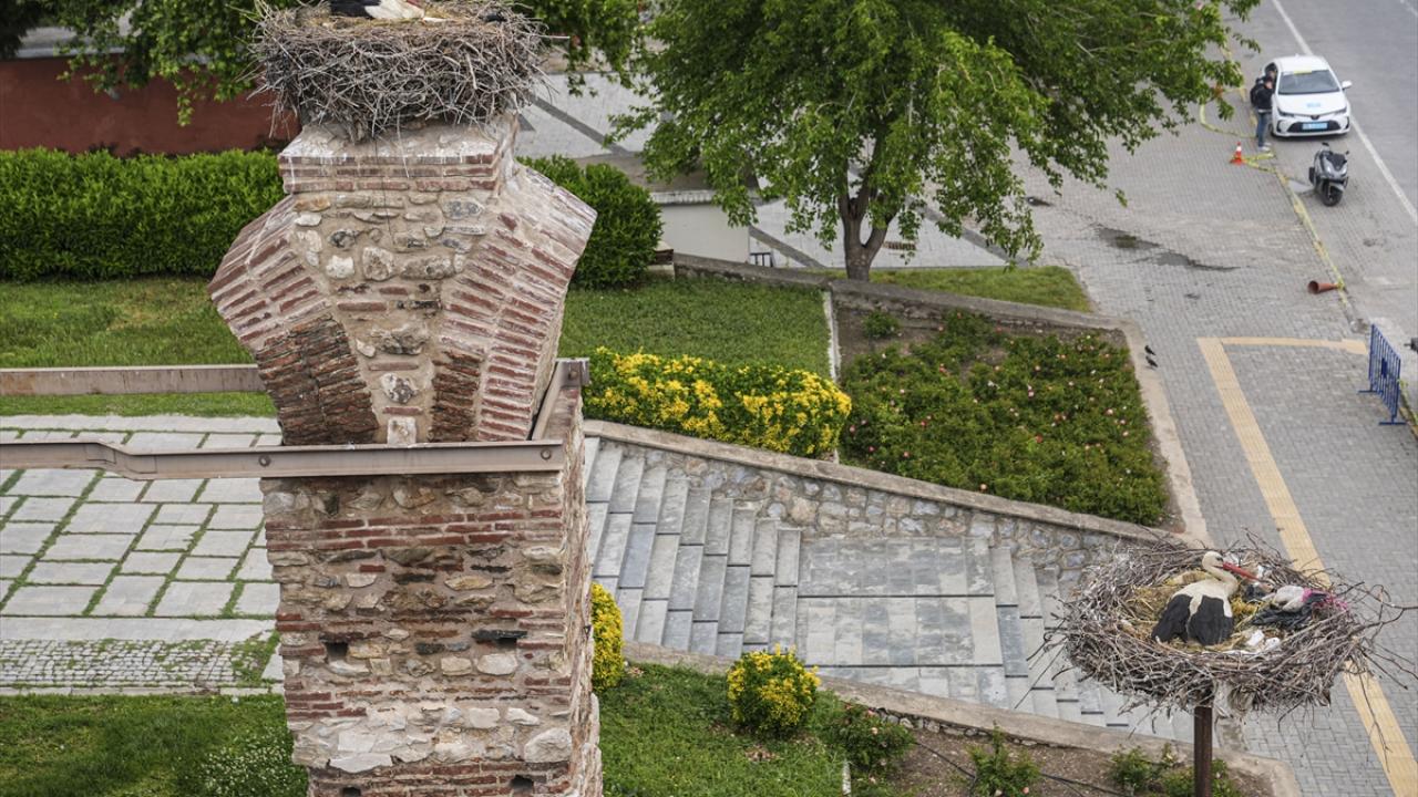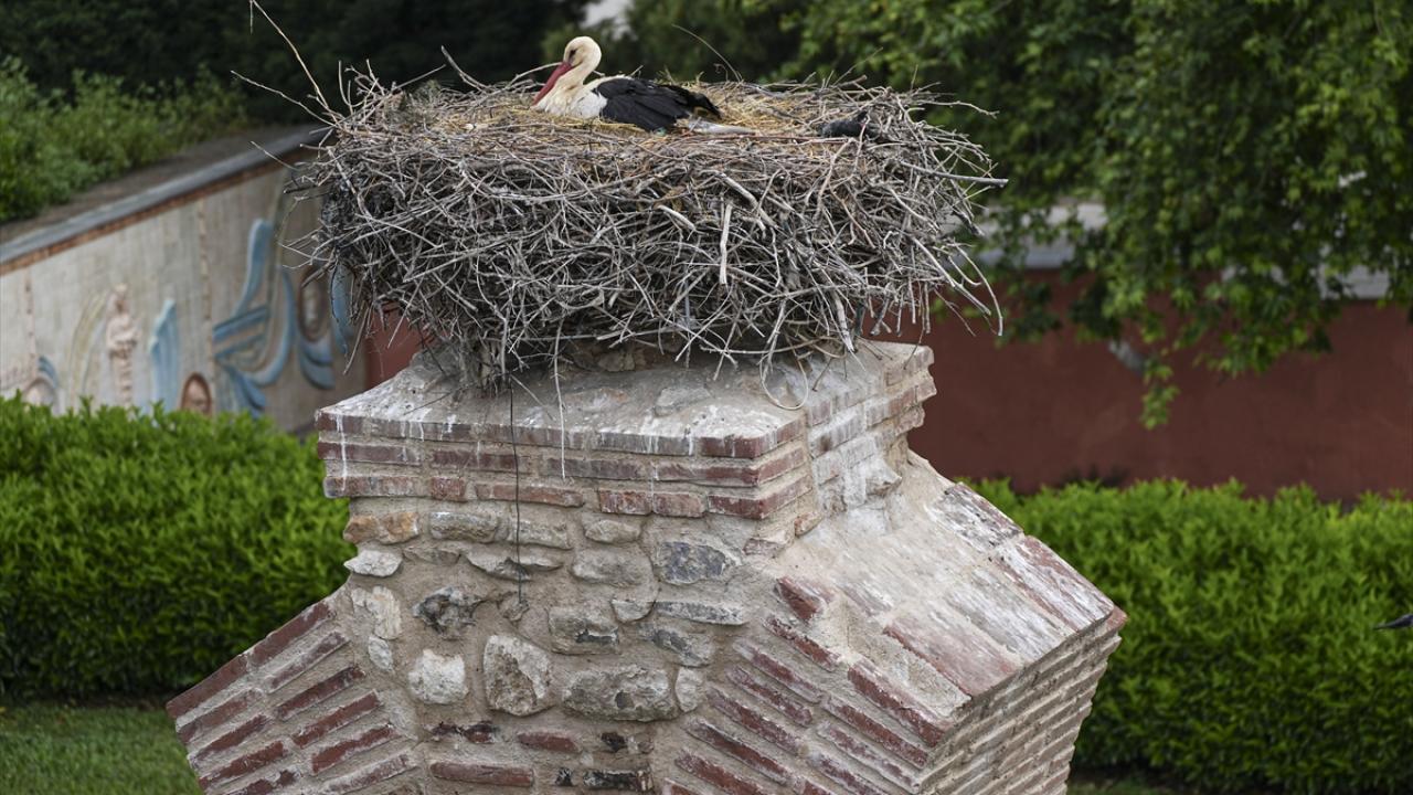 Bahar aylarının gelmesiyle birlikte ülkemize de göç eden leylekler, ilçenin tarihi yapıları ile iç içe yaptıkları yuvalarında yaşamlarını sürdürüyor.