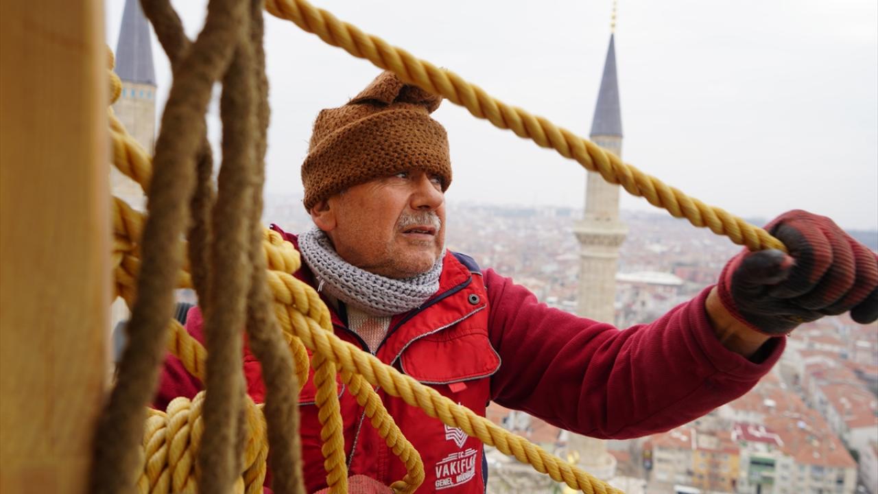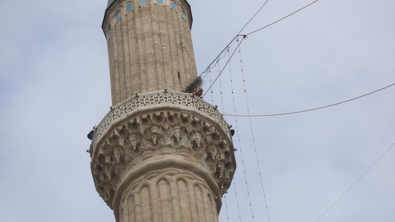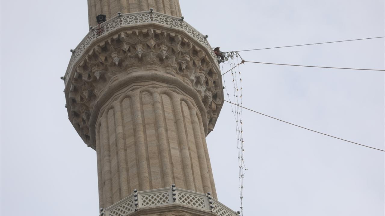 Çalışmada önce mahya asılacak minareler arasına halatlar çekildi.