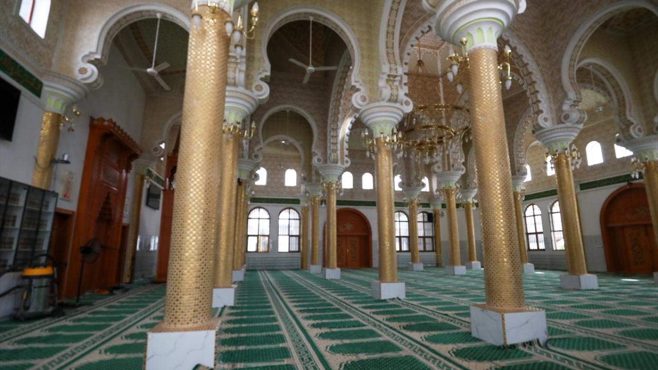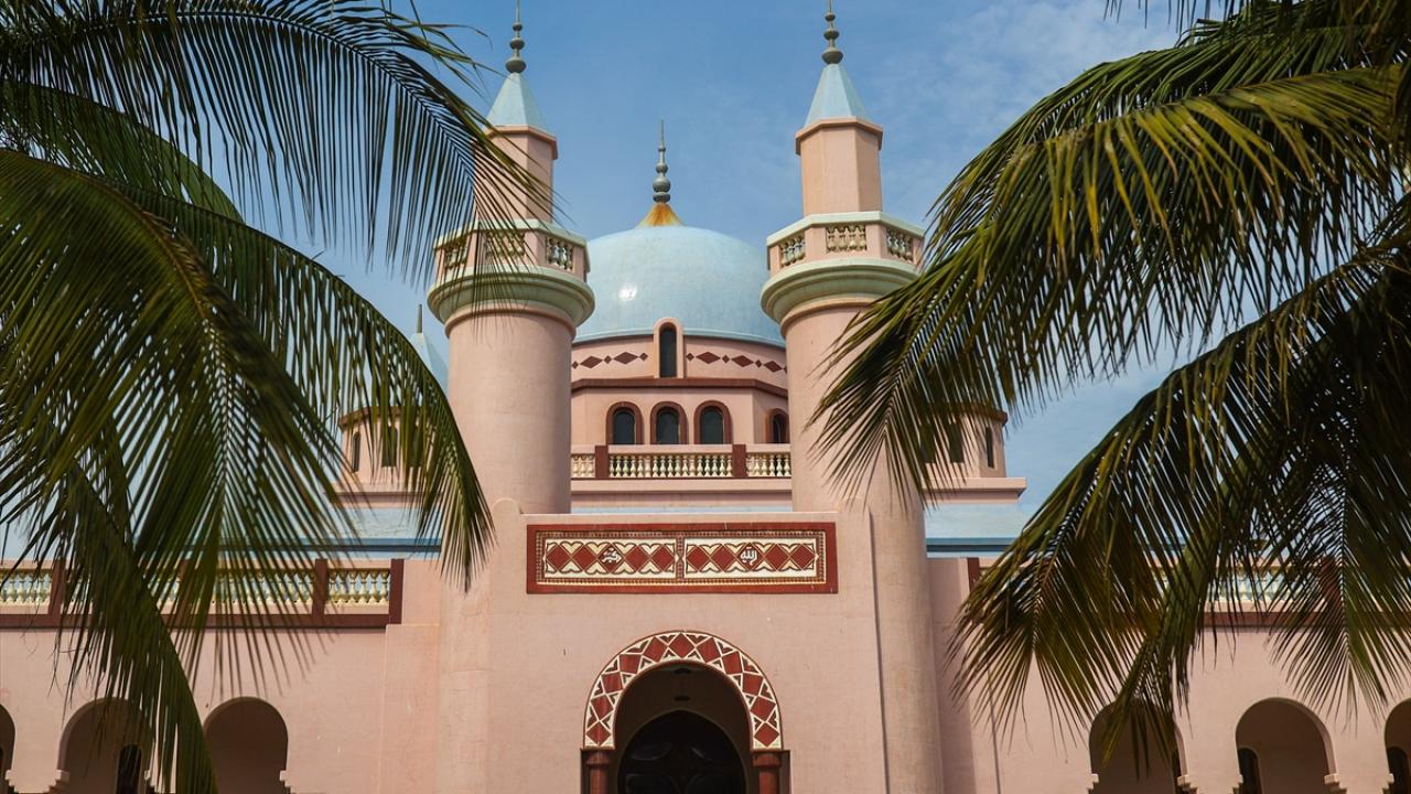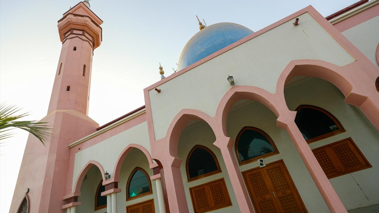 2015 yılında açılan camide açık pembe ve mavi tonlarının hakim olduğu dış cephe, avlusunu çevreleyen palmiye ağaçlarıyla muazzam bir kontrast oluşturuyor.