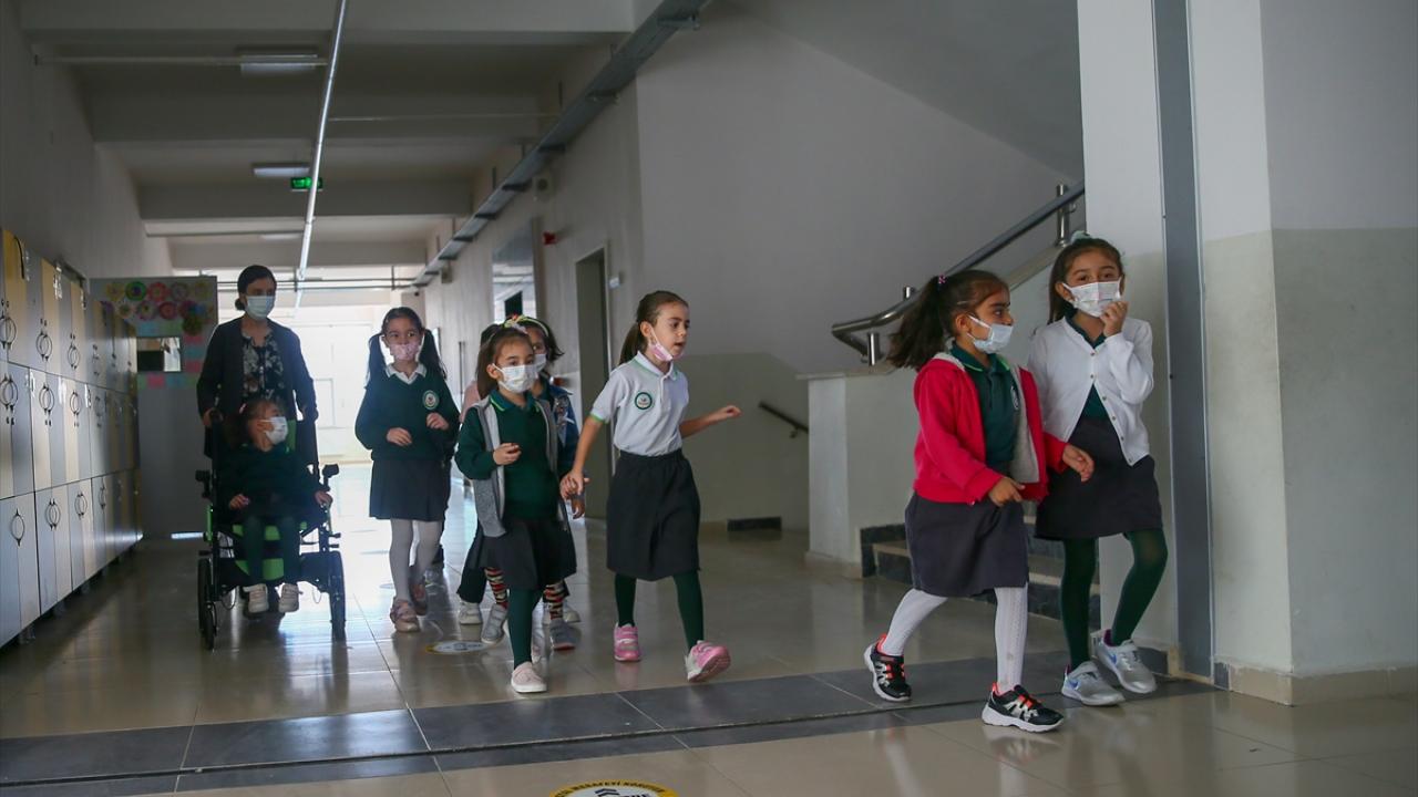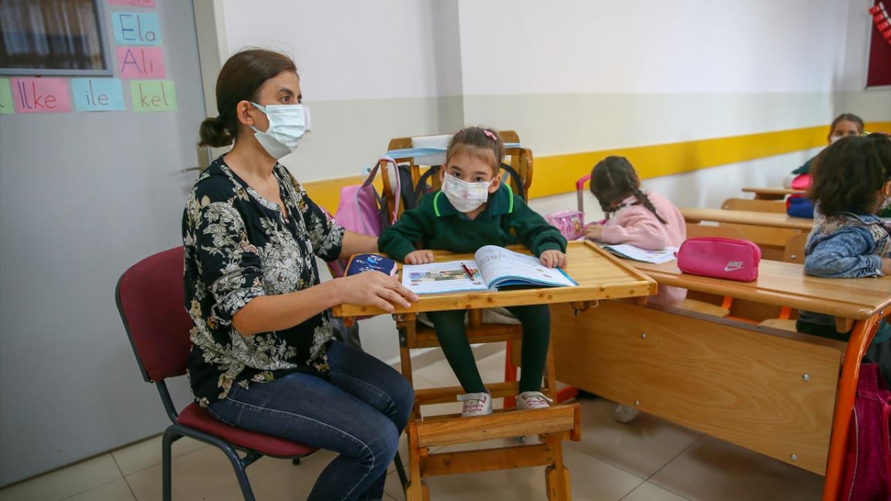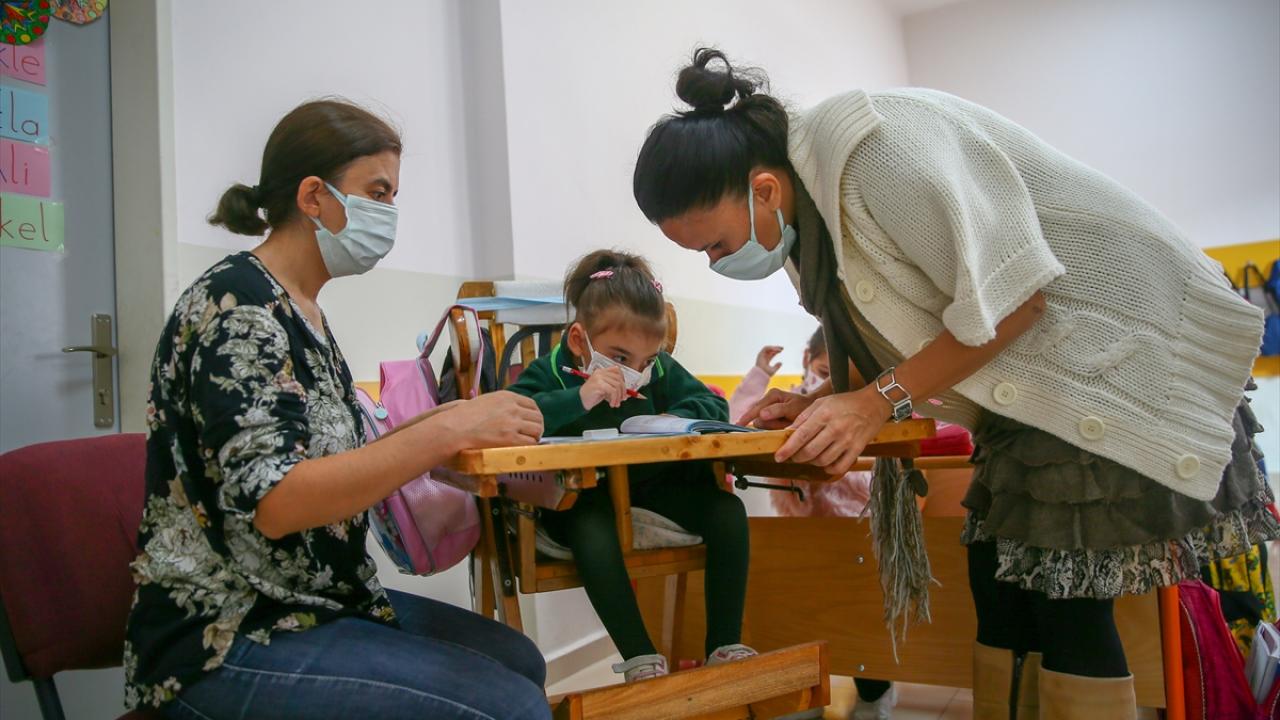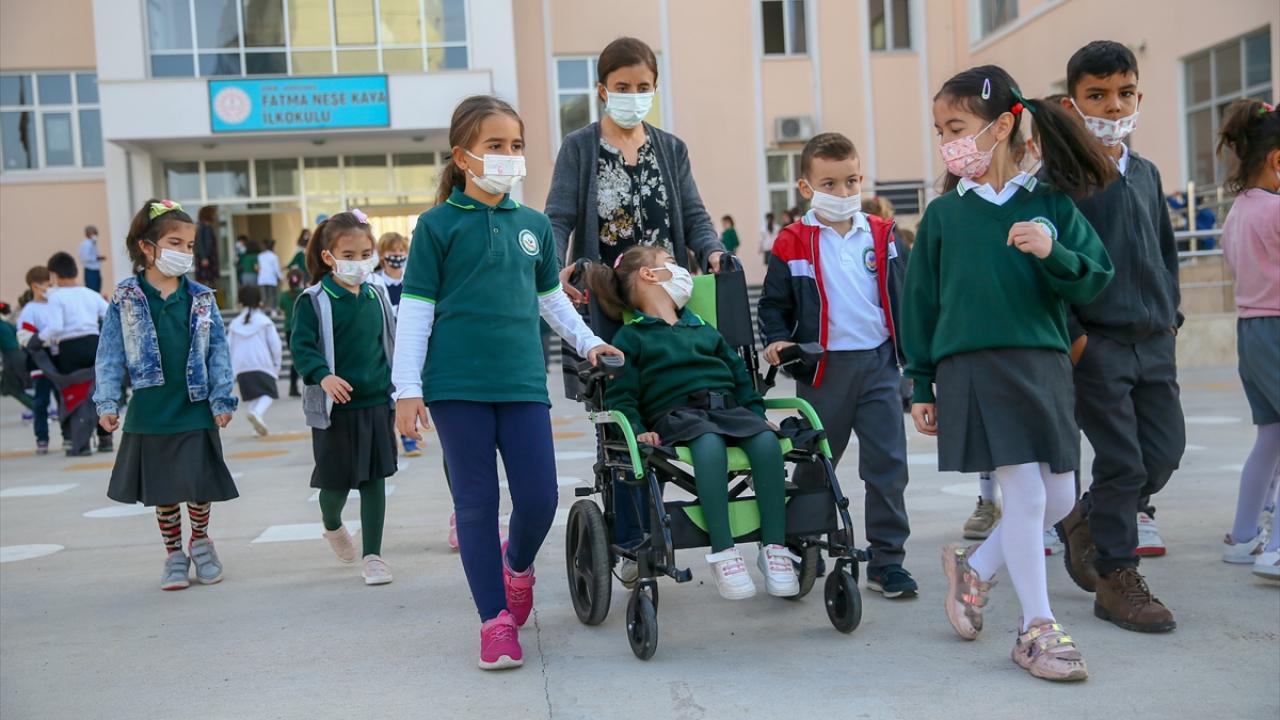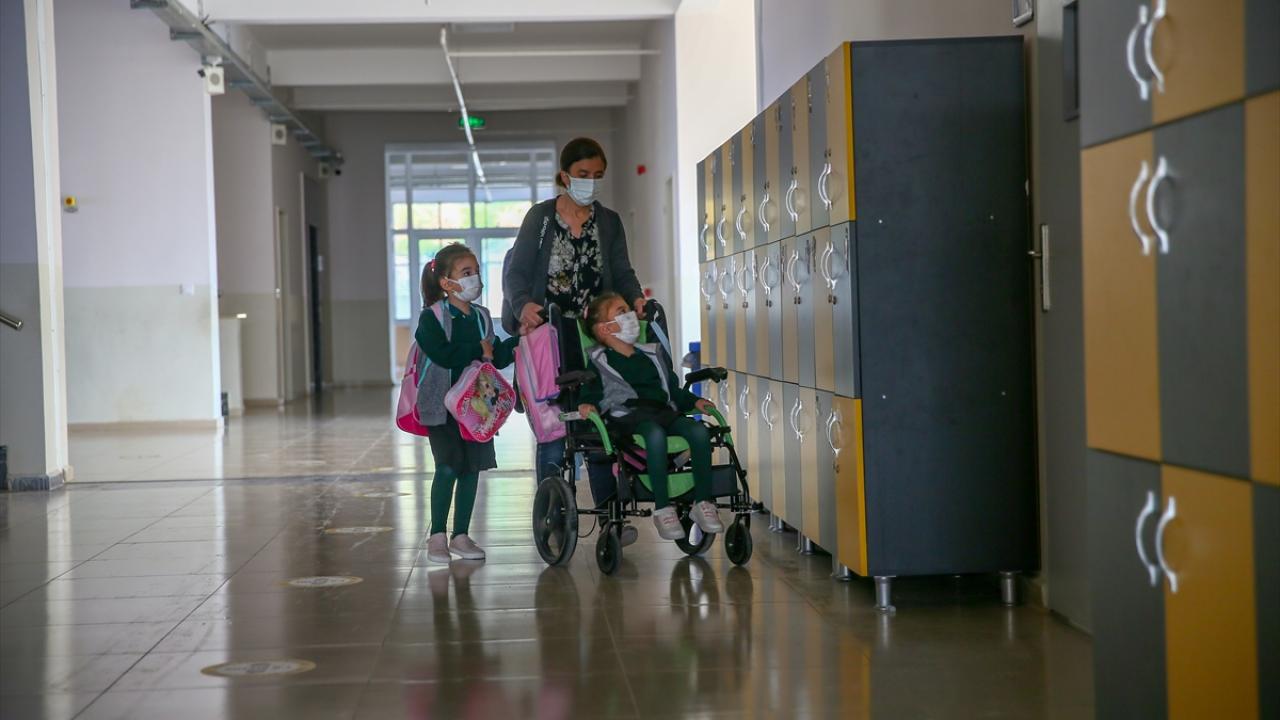 Ders sırasında sınıfta kızı için özel olarak yaptırdıkları masa ve sandalyede yardımcı olmaya çalışan Hülya Yüksel, teneffüslerde Ayşe`yi yine tekerlekli sandalyesine bindirerek dışarı çıkarıyor.