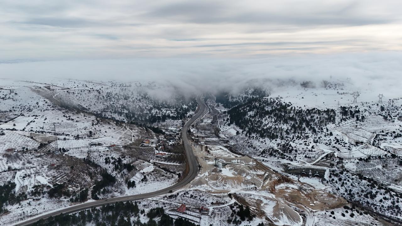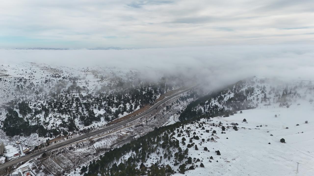 İç Anadolu ile Akdeniz bölgelerini birbirine bağlayan Sertavul Geçidi'nde etkili olan kar ve sis, havadan görüntülendi.
