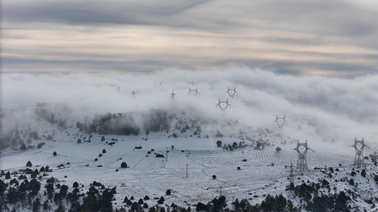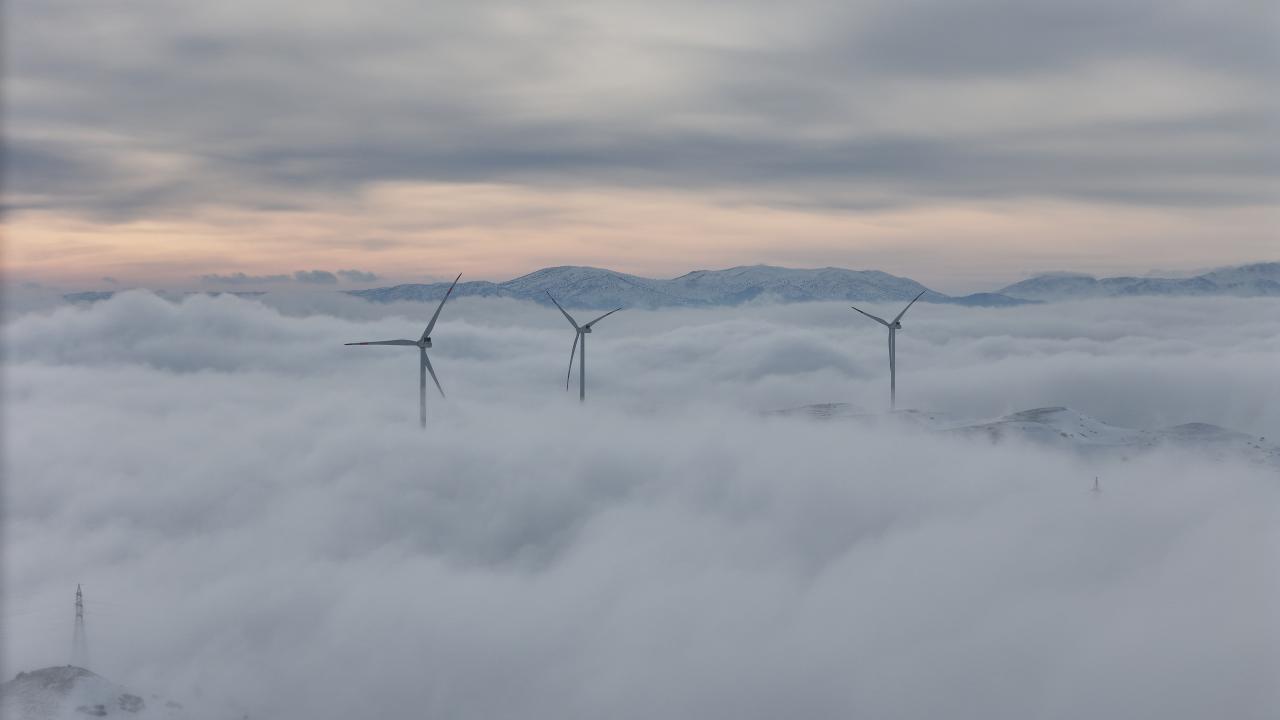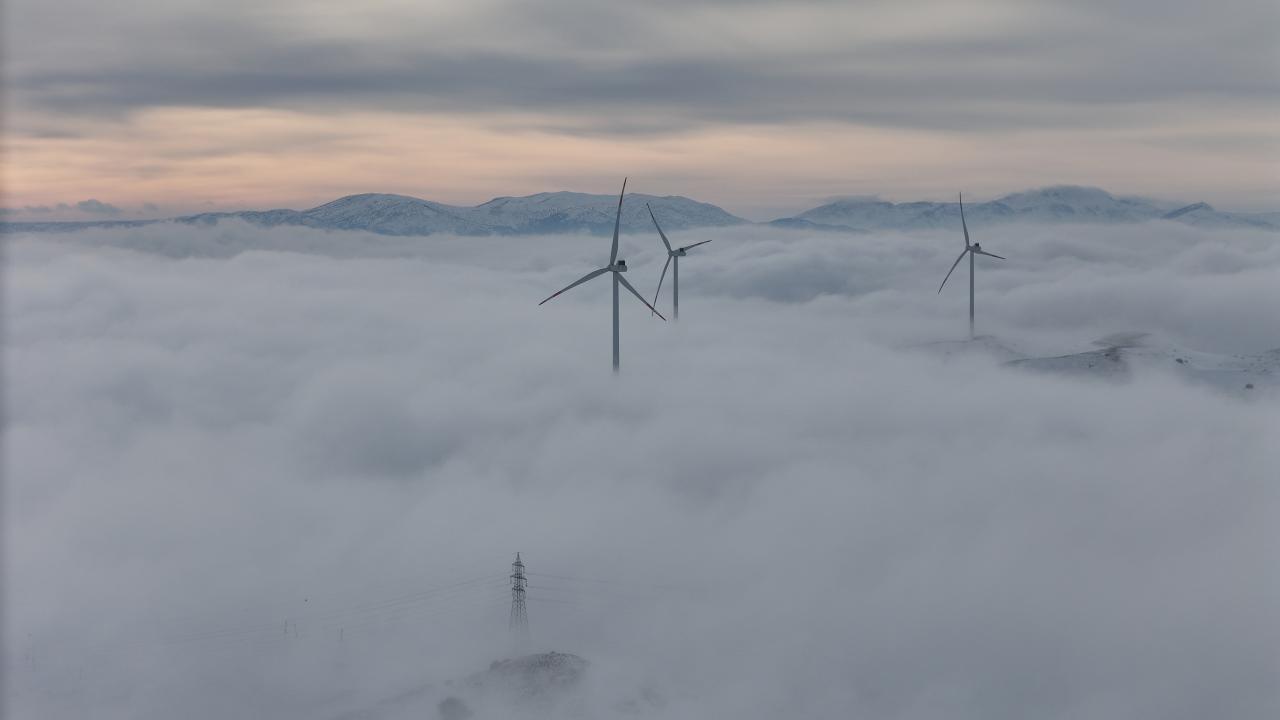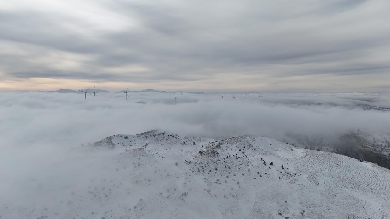 Geçitte, kar yağışının ardından beyaz örtüyle kaplanan çam ağaçları ve sis tabakasının arasında kalan rüzgar türbinleri, güzel görüntü oluşturdu.