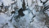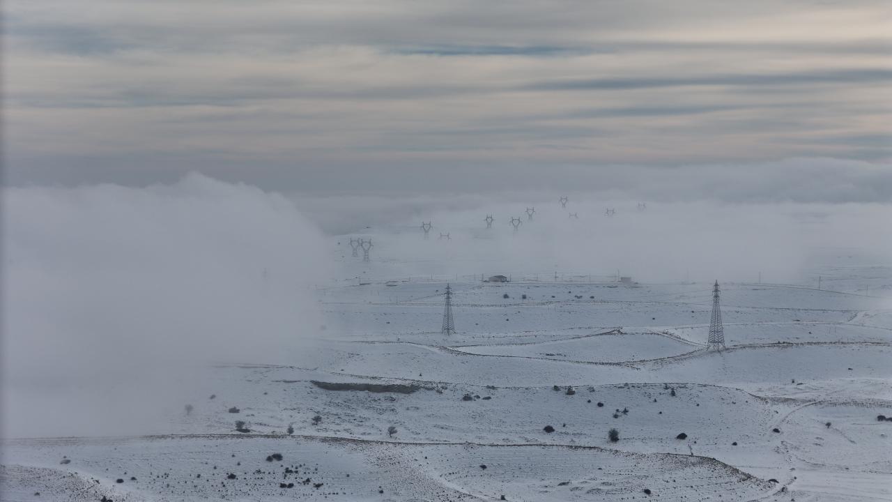 Kar ve sisin uyumunun oluşturduğu manzara dronla kaydedildi.