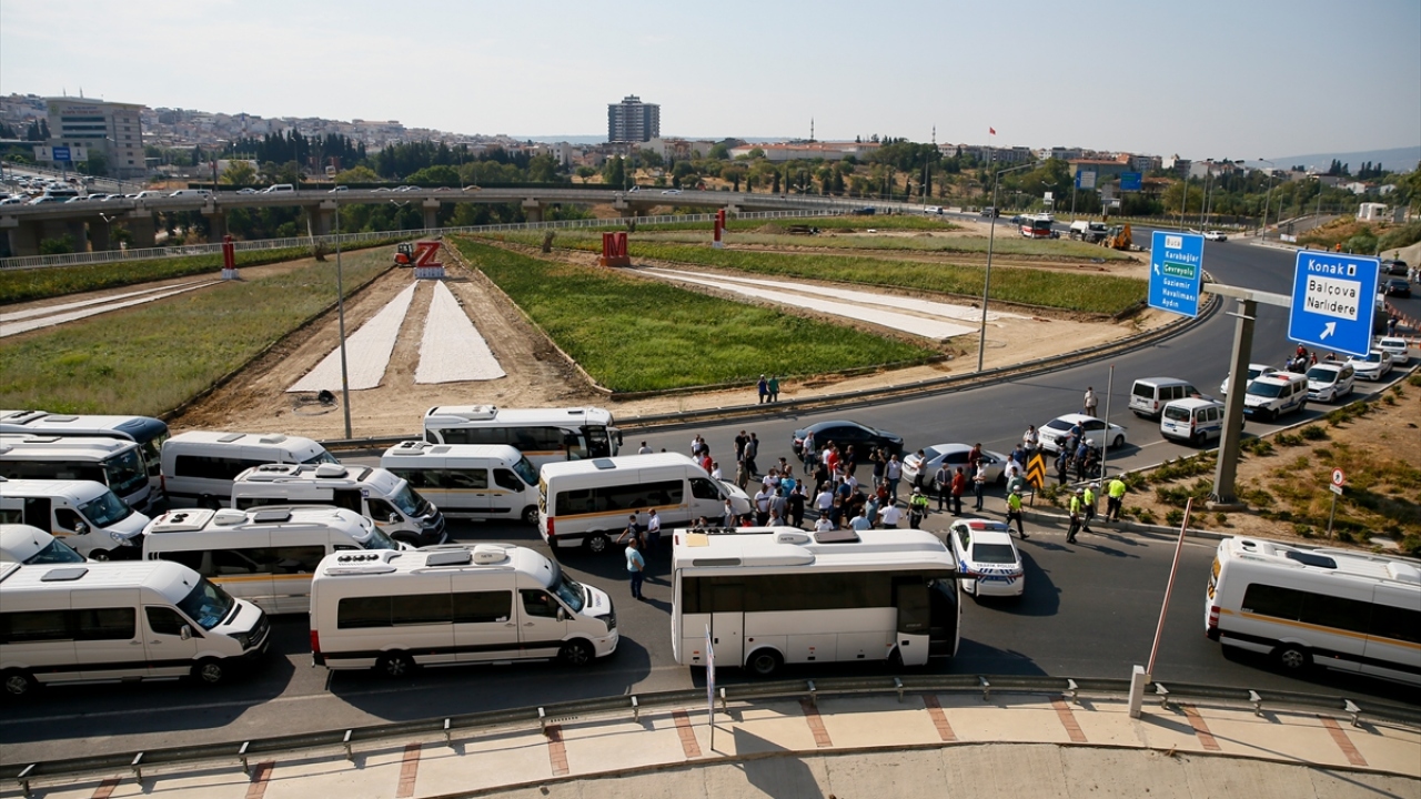 İzmir'de servisçiler belediyenin "S Plaka için ihaleye çıkacağını" iddia ederek araçlarıyla eylem yaptı.