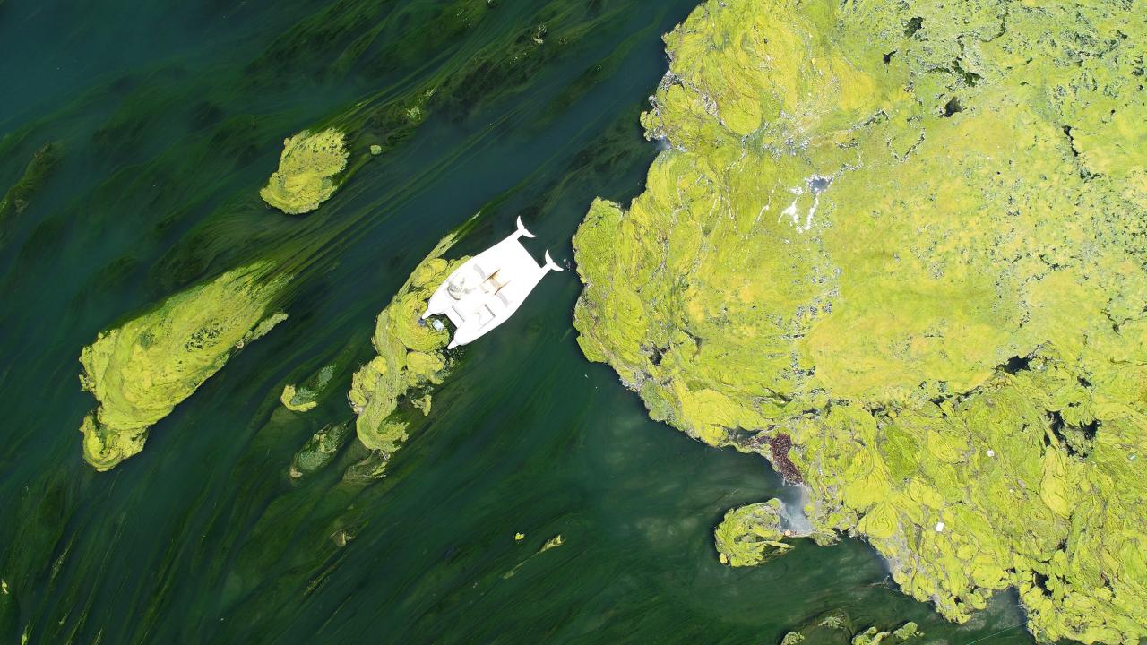 2 metrenin üzerindeki yosunlar nedeniyle nehir tamamen yeşile büründü.