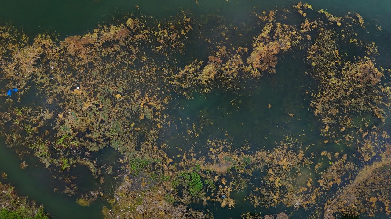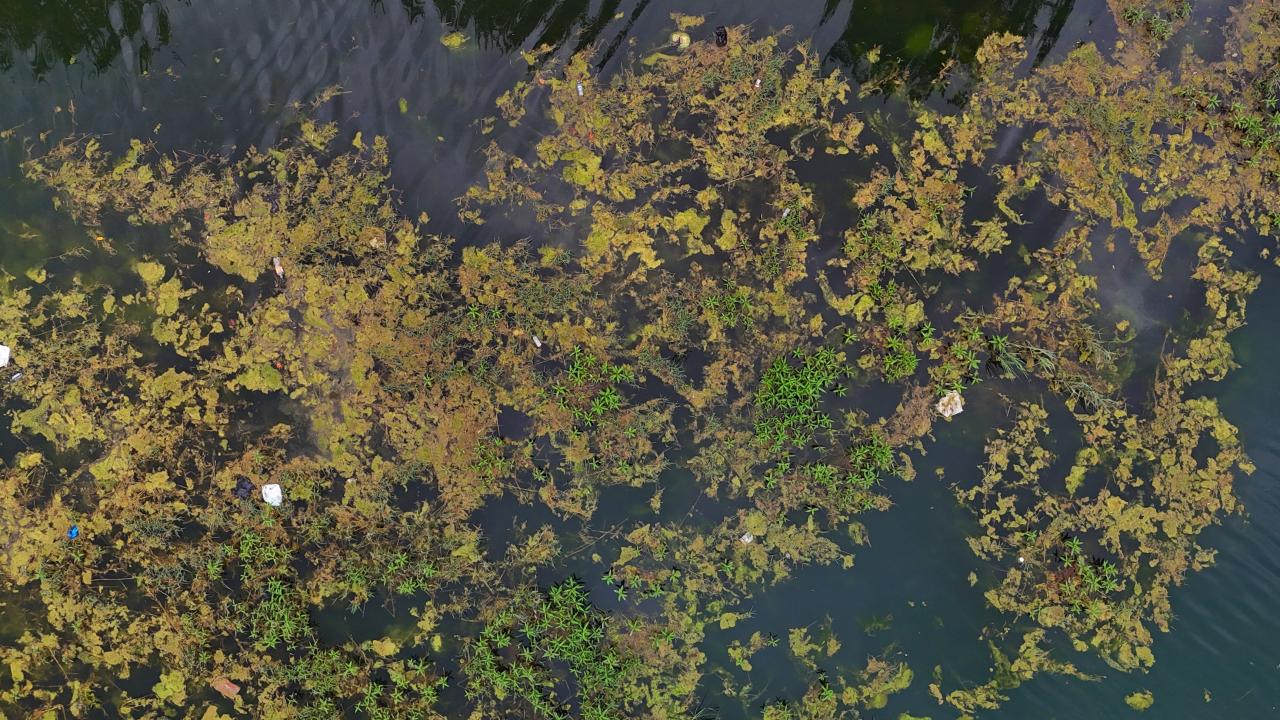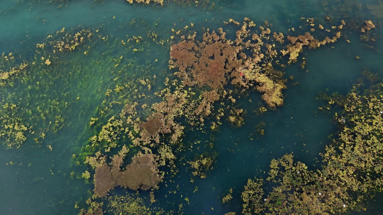 Yosunlar nedeniyle nehrin büyük bir bölümü yeşile büründü.