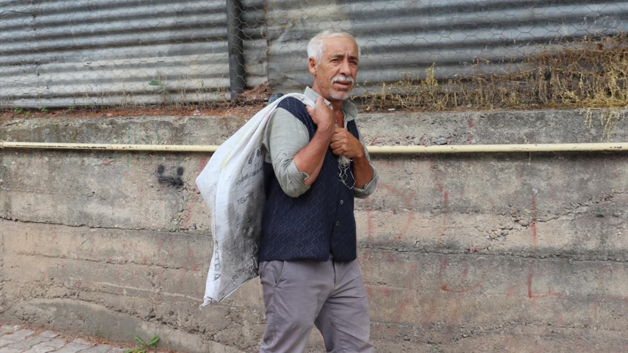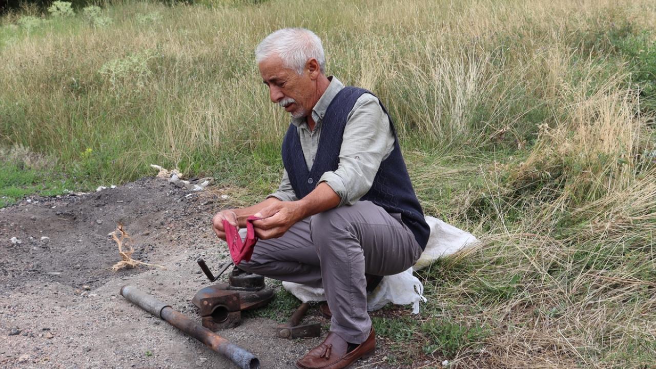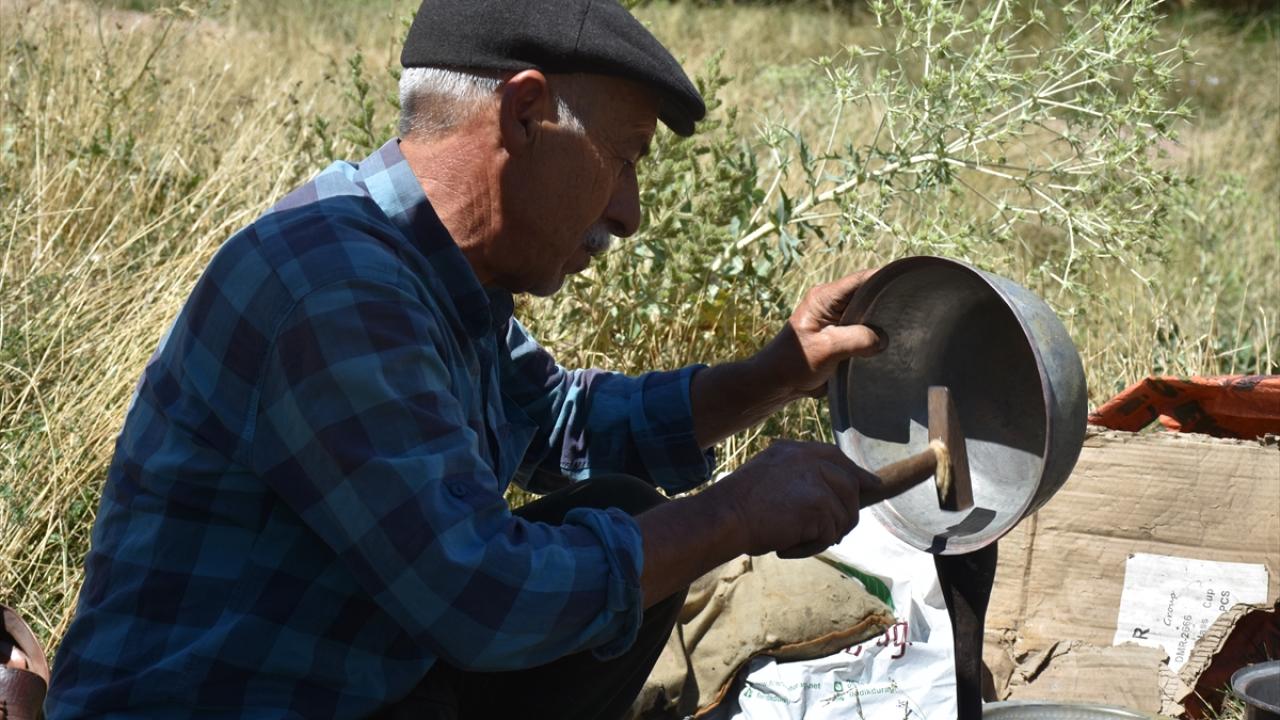 Gümüşhane'de 62 yaşındaki kalaycı ustası Yaşar Okan, hem geçimini sağlamak hem de kaybolmaya yüz tutan meslekler arasındaki kalaycılığı yaşatmak için körük ve gerekli diğer malzemeleri çuvalında taşıyarak tezgah açıyor.