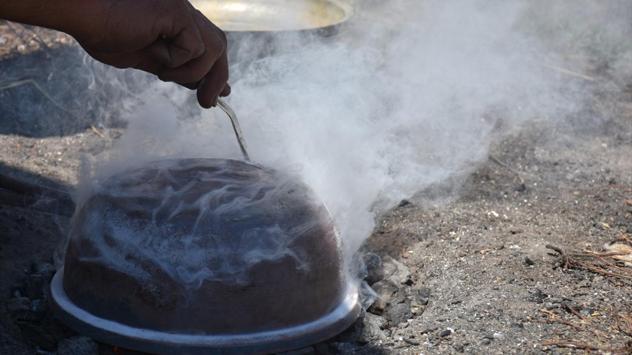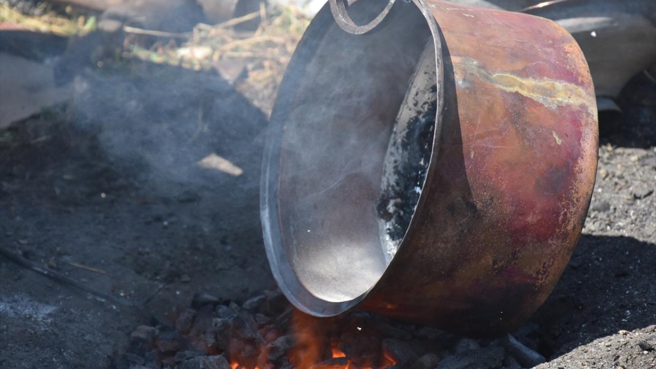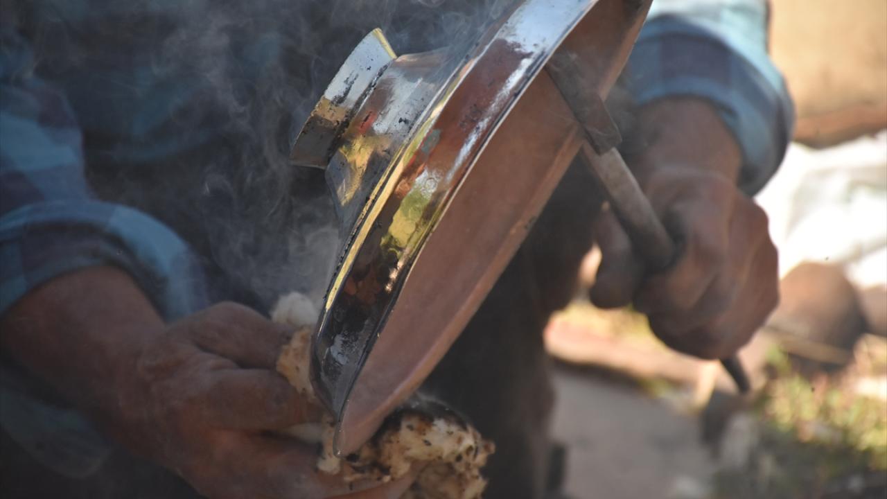 Yaktığı ateşi körükle canlandıran Okan, çoğunluğu mutfakta kullanılan bakır eşyaları kalaylayarak yeniden hayata döndürüyor.