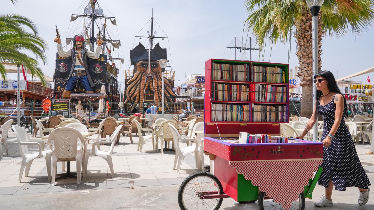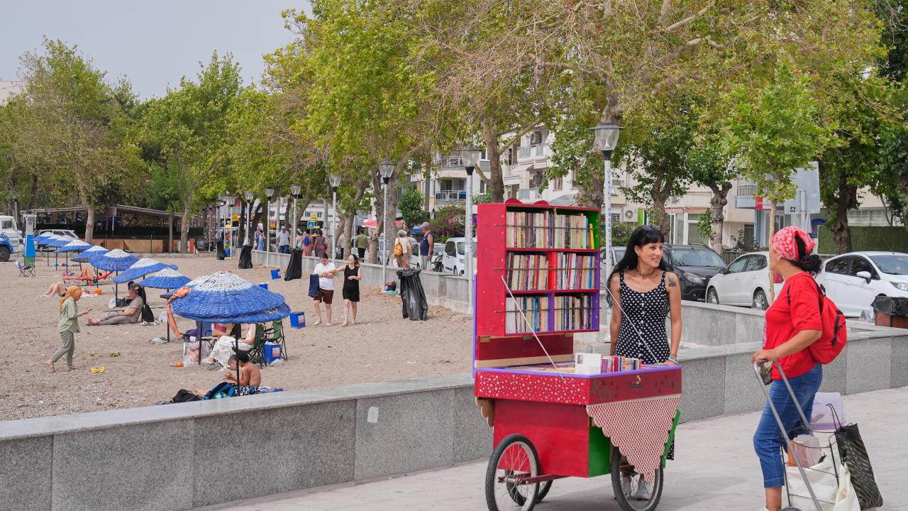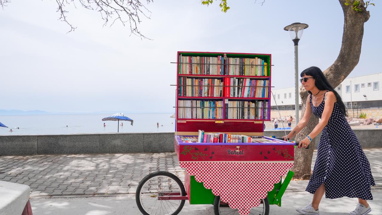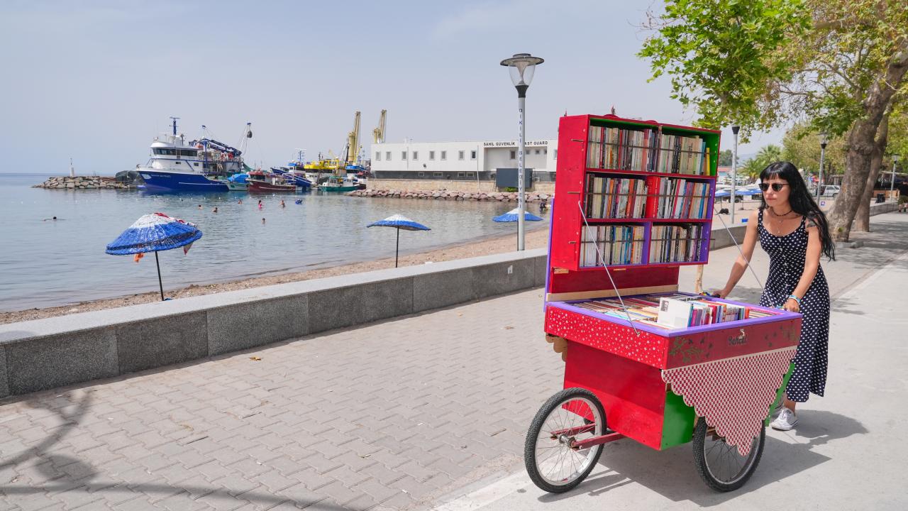 Okuma tutkusunu yaşam biçimine dönüştüren İçten Gürcan, üç tekerlekli seyyar tezgahına sıraladığı kitaplarla edebiyat sevgisini İzmir'in Dikili ilçesinde sokak sokak gezerek aşılamaya çalışıyor.