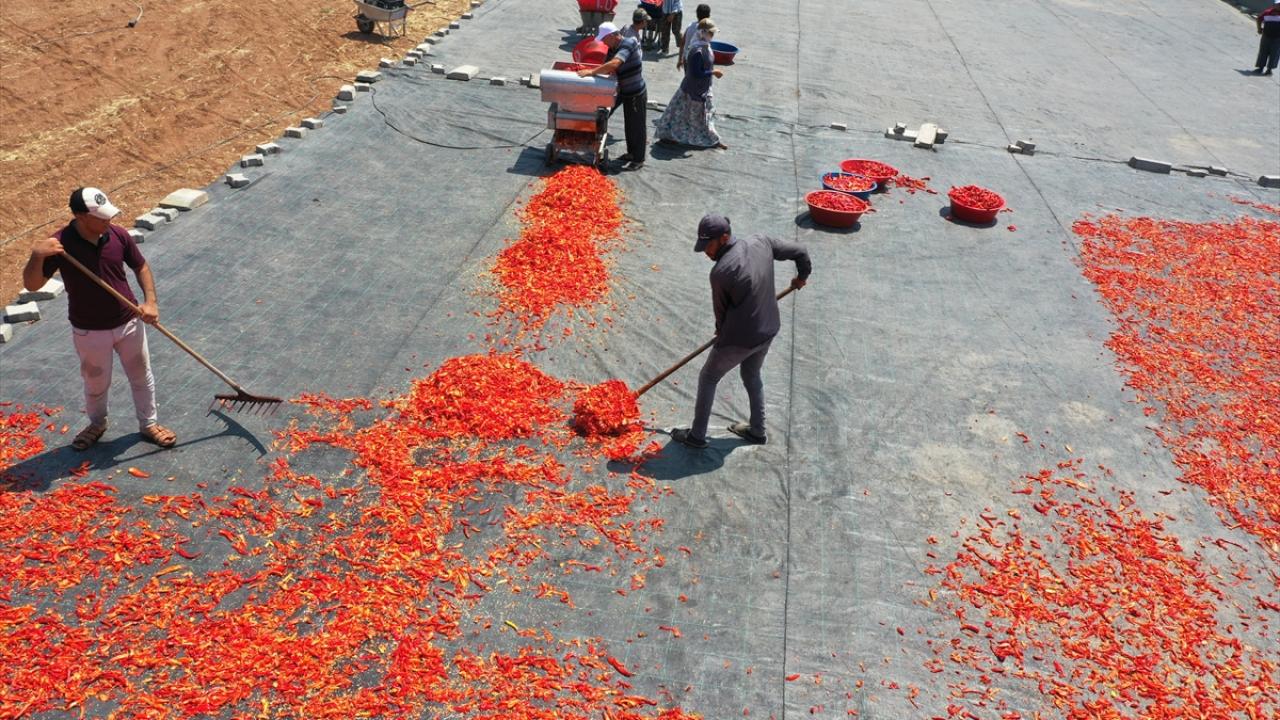 Kavurucu sıcağın biberin acısıyla birleşmesiyle çalışanlar için daha da zorlu hale gelen işlemlerde, biberler elle parçalanıp makineden geçiriliyor, kuruması için naylonların üzerinde bir süre bekletiliyor.