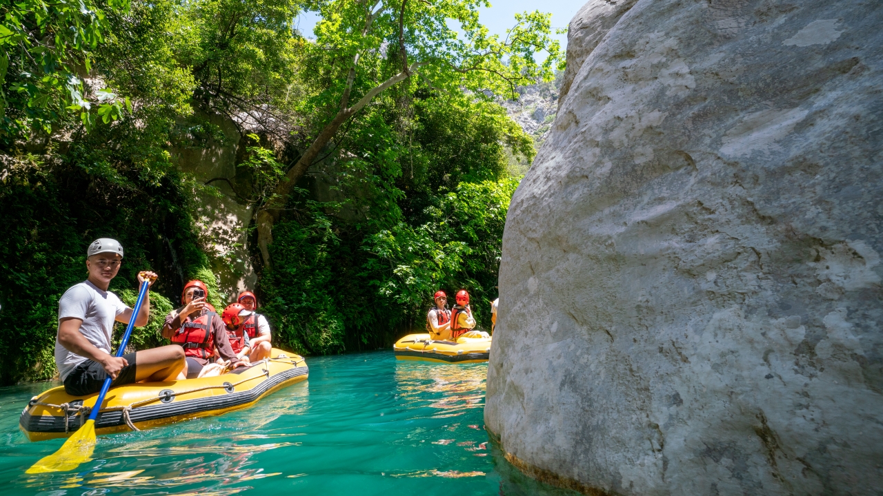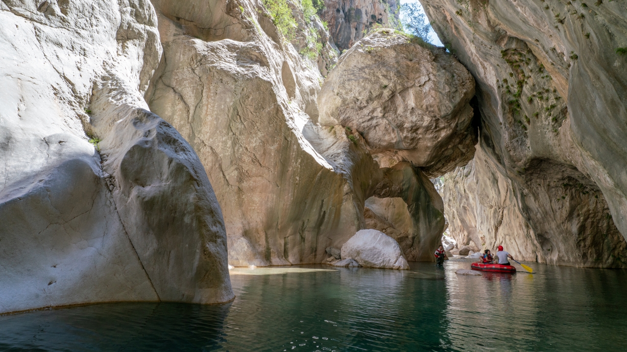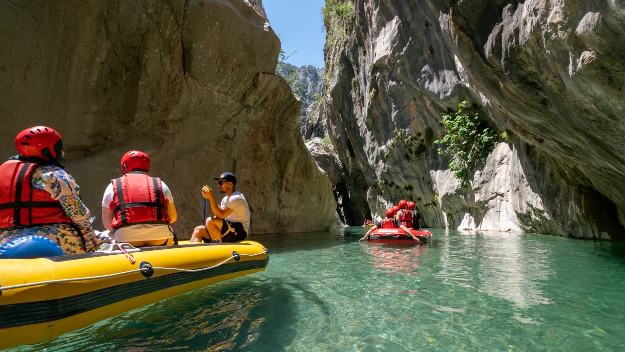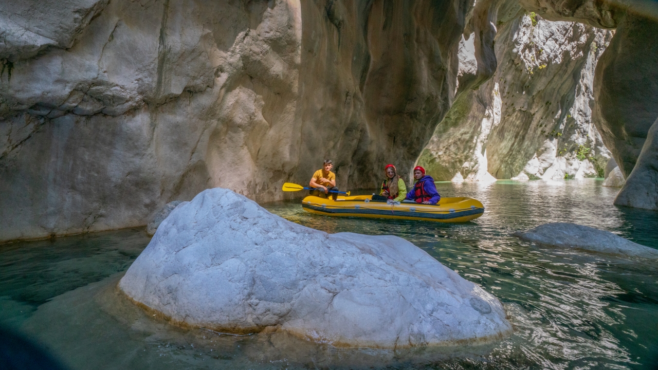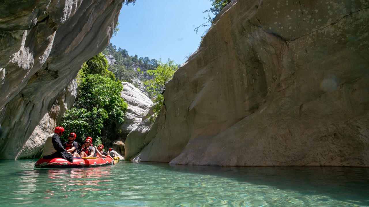 Kendine özgü kaya oluşumları arasında botla gezinti yapan Kanyon misafirleri Göynük Çayı`nın serin sularında yüzmeyi de ihmal etmiyor.