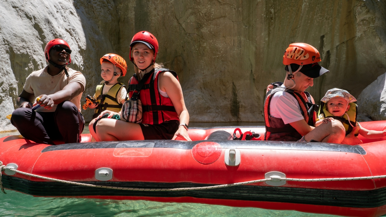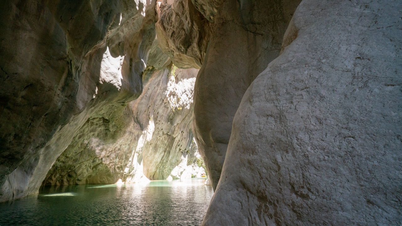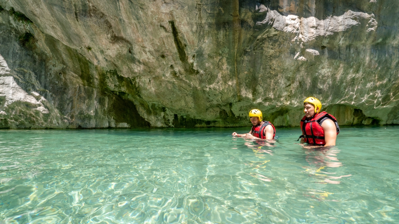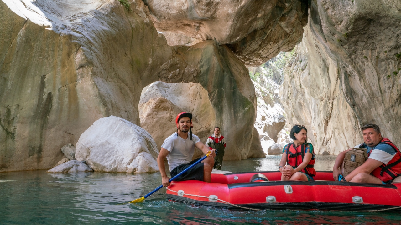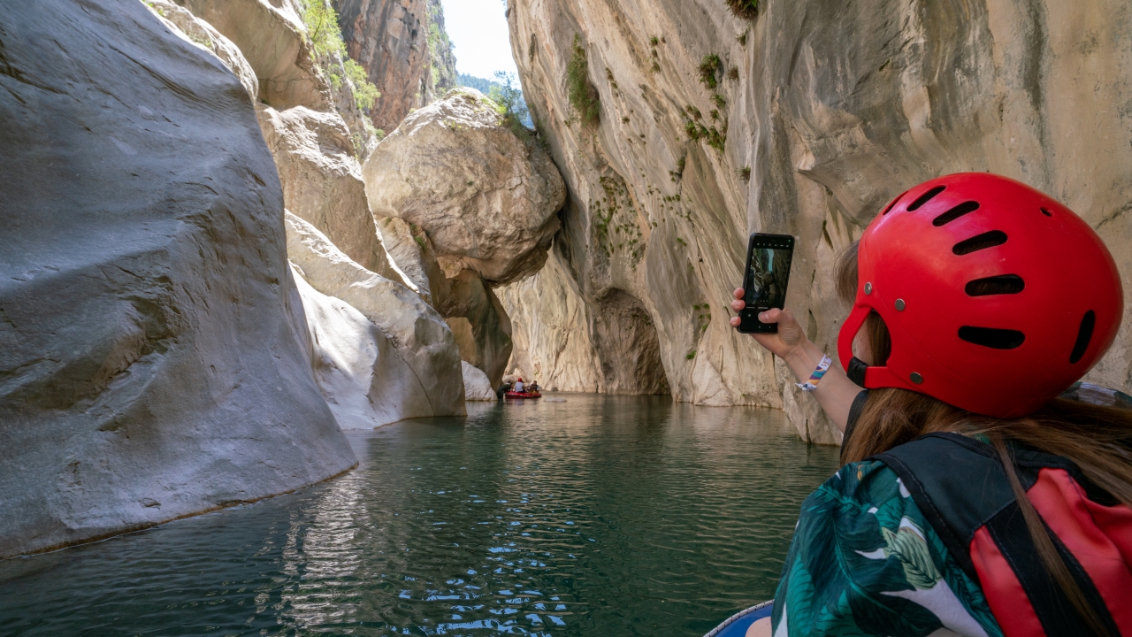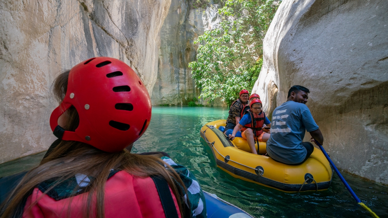 Kendine özgü kaya oluşumları arasında botla gezinti yapan Kanyon misafirleri Göynük Çayı`nın serin sularında yüzmeyi de ihmal etmiyor.