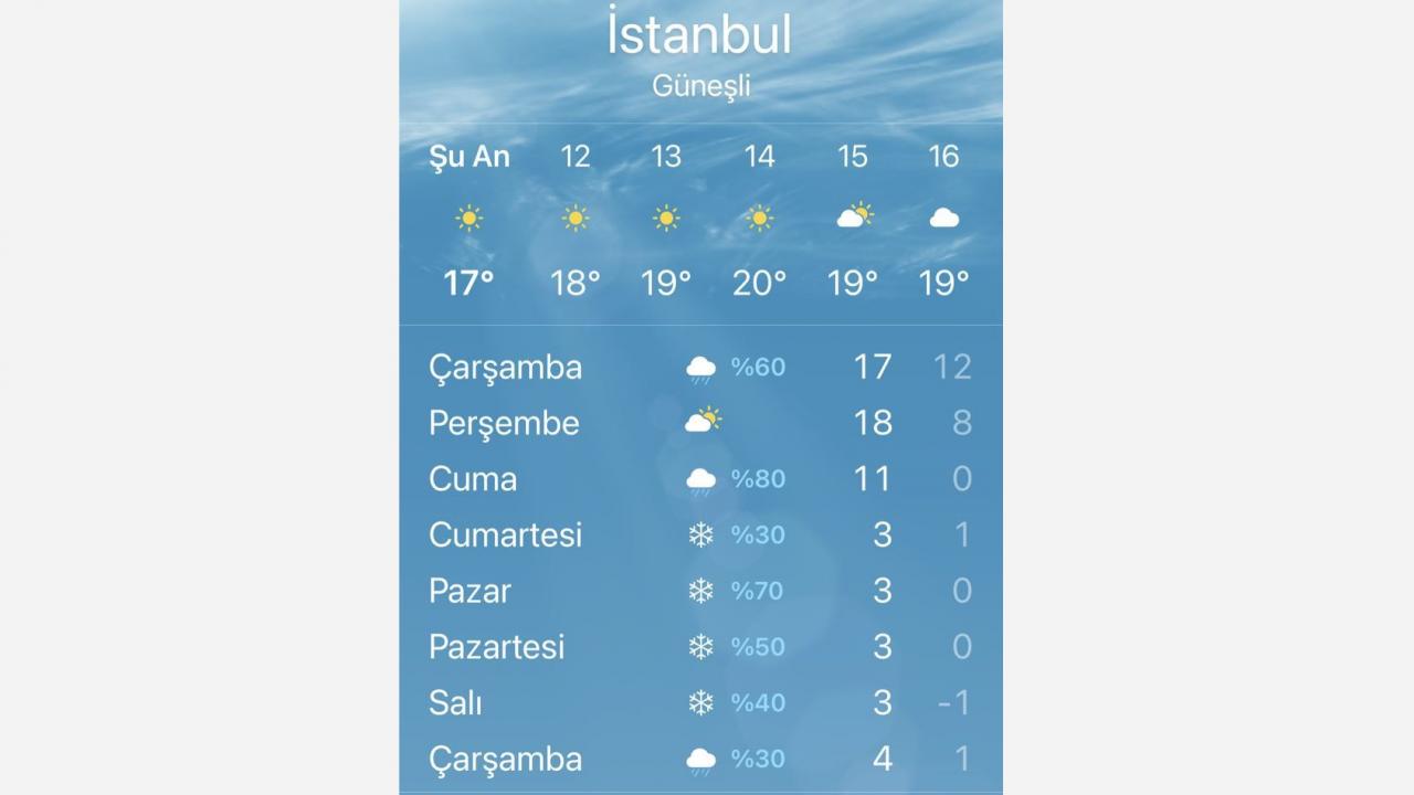 İstanbul'da, mevsim normallerinin üzerinde seyreden sıcaklık, cumartesi günü mevsim normallerinin altına düşecek. Kentte, pazar günü itibarıyla kar yağışının başlaması bekleniyor.
