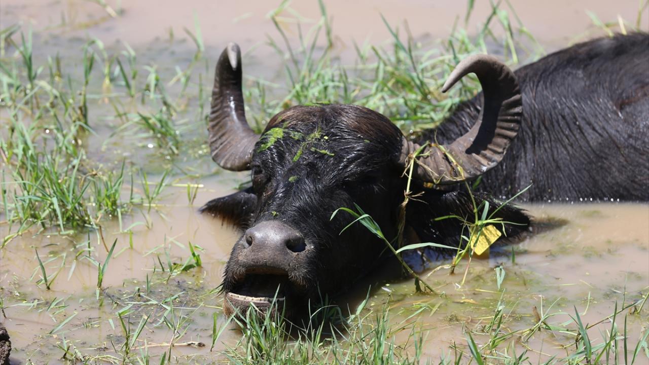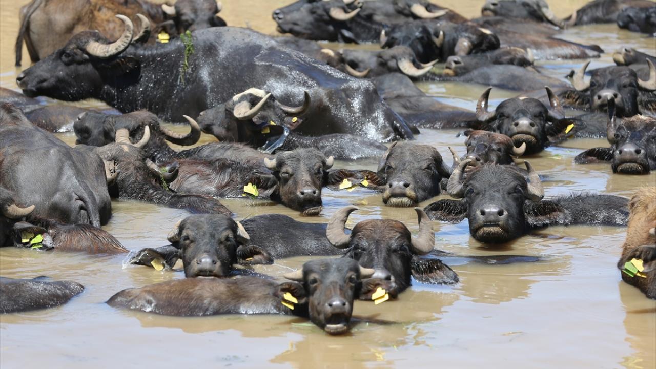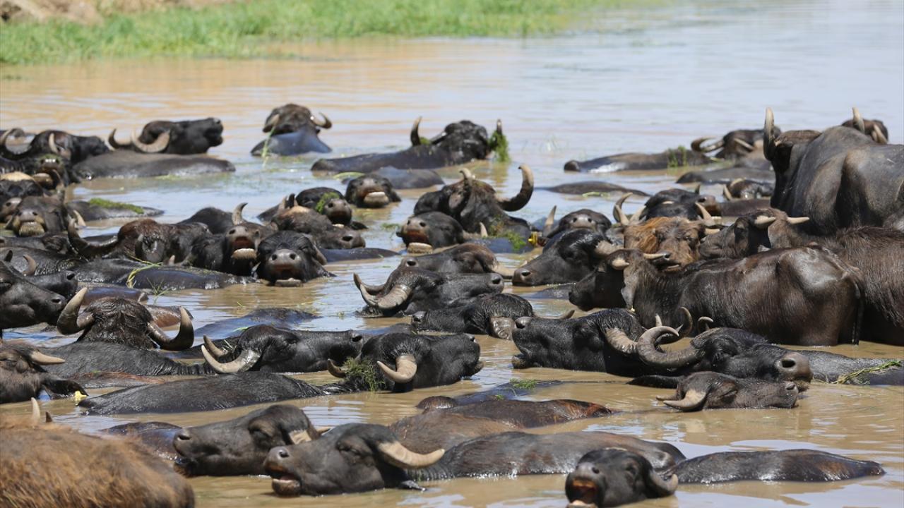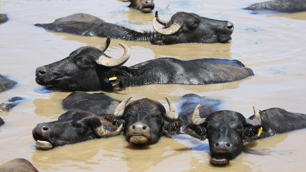 Sıcaklığın zaman zaman 40 dereceyi aştığı, hissedilen sıcaklığın ise 45 dereceye ulaştığı kentte, mandalar oluşturulan göletlerde serinledi.