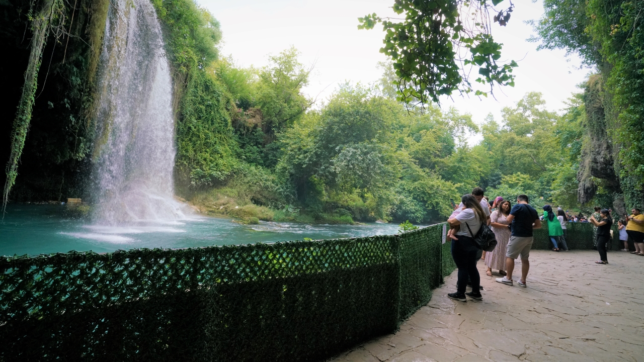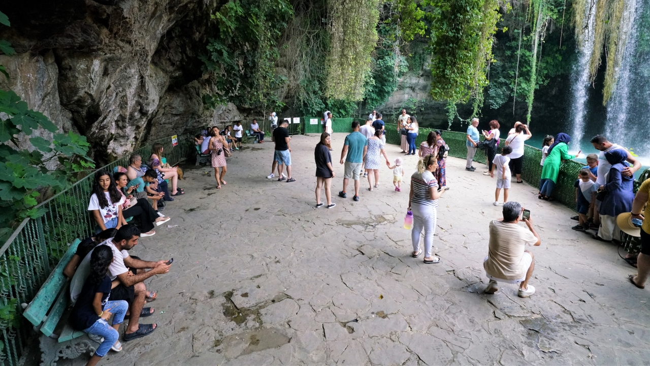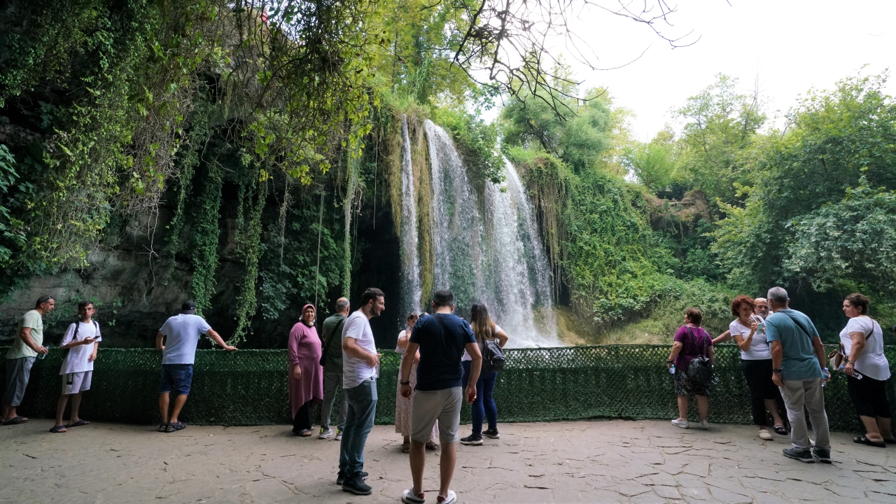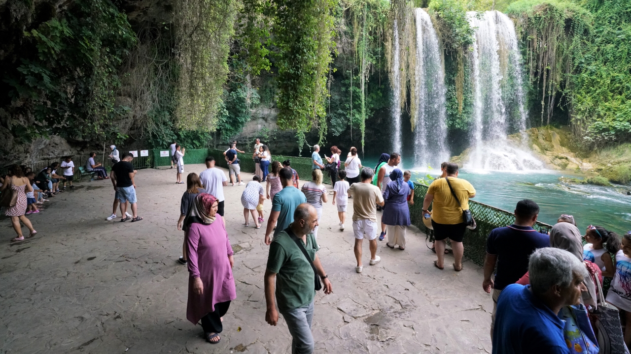 Mavi ve yeşilin buluştuğu doğa harikası Düden Şelalesi`ni ziyaret edenler, fotoğraf çektiriyor, yürüyüş yapıyor, eşsiz güzellikleri seyretmenin keyfini çıkarıyor.