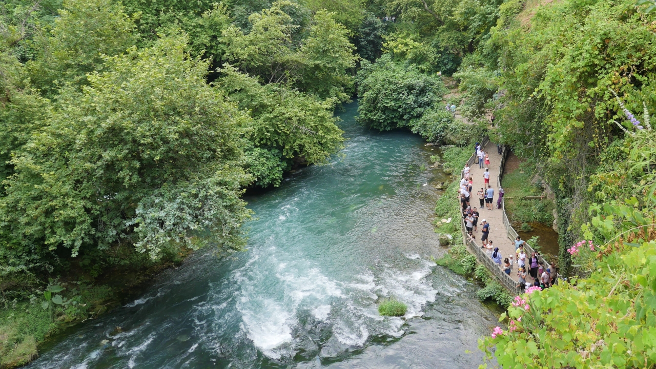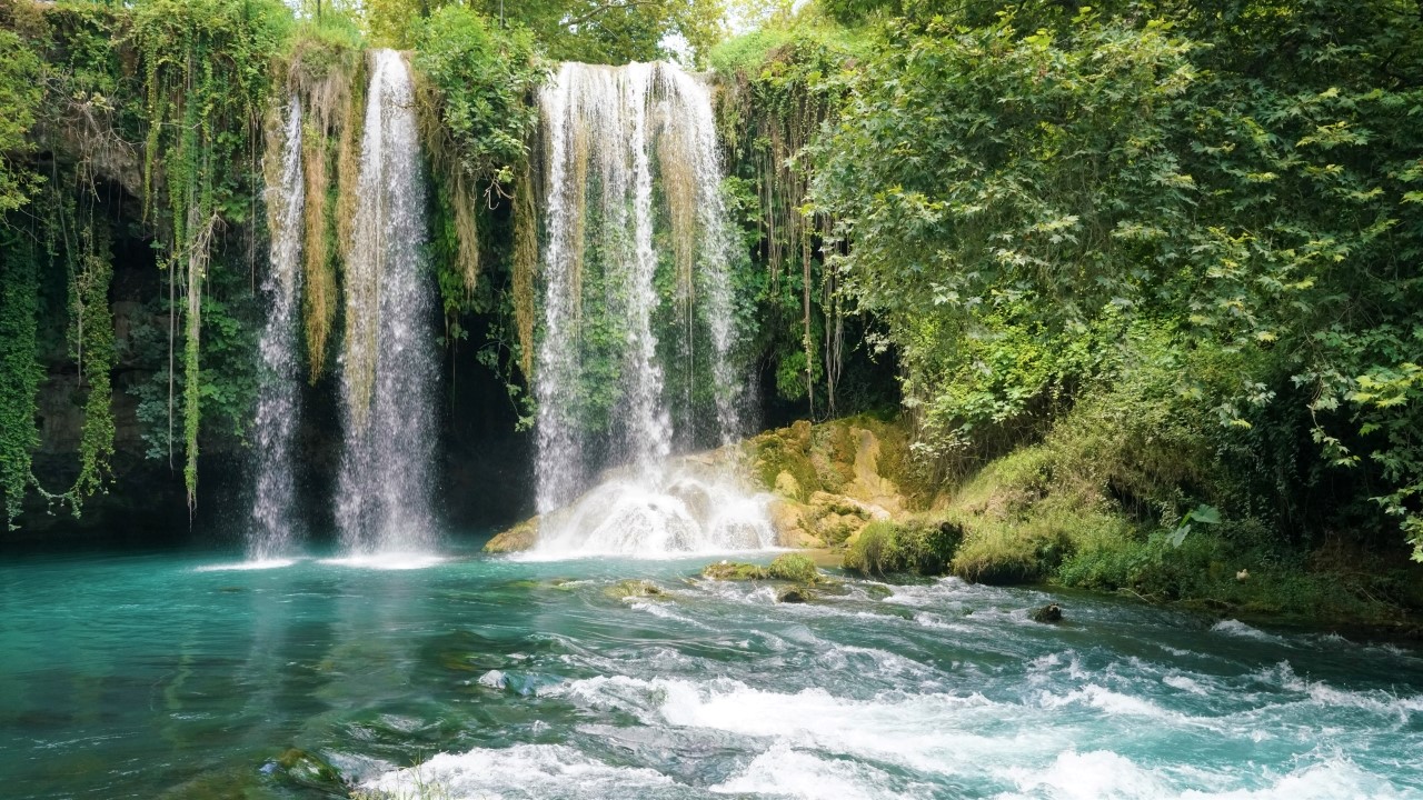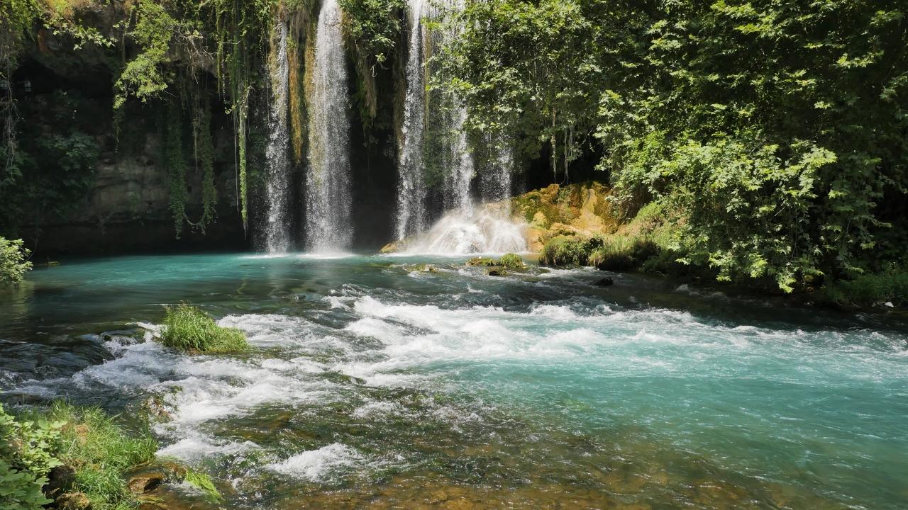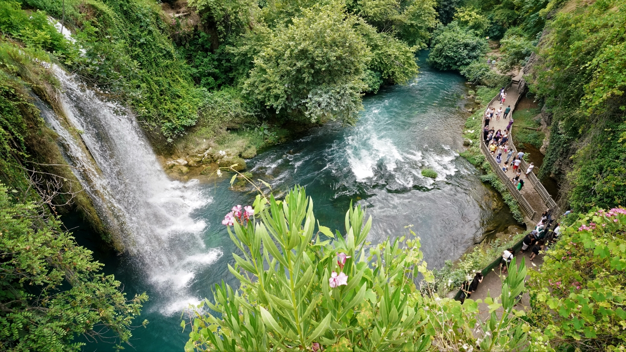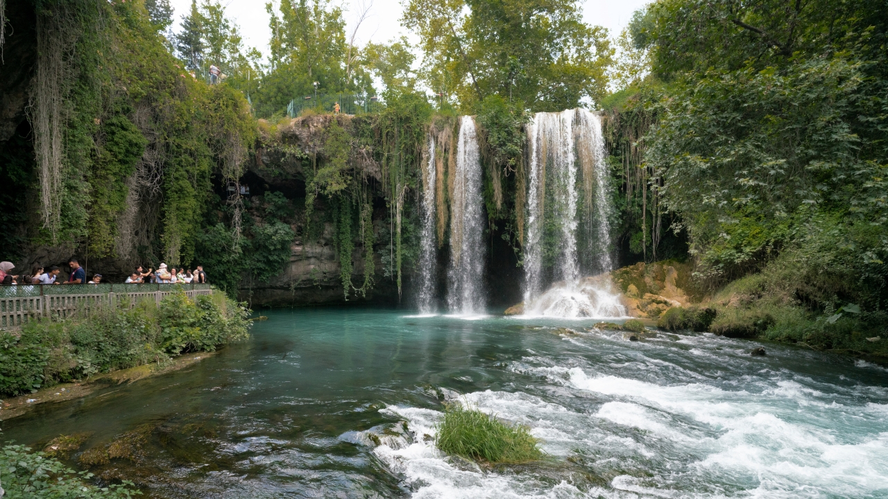 Mavi ve yeşilin buluştuğu doğa harikası Düden Şelalesi`ni ziyaret edenler, fotoğraf çektiriyor, yürüyüş yapıyor, eşsiz güzellikleri seyretmenin keyfini çıkarıyor.