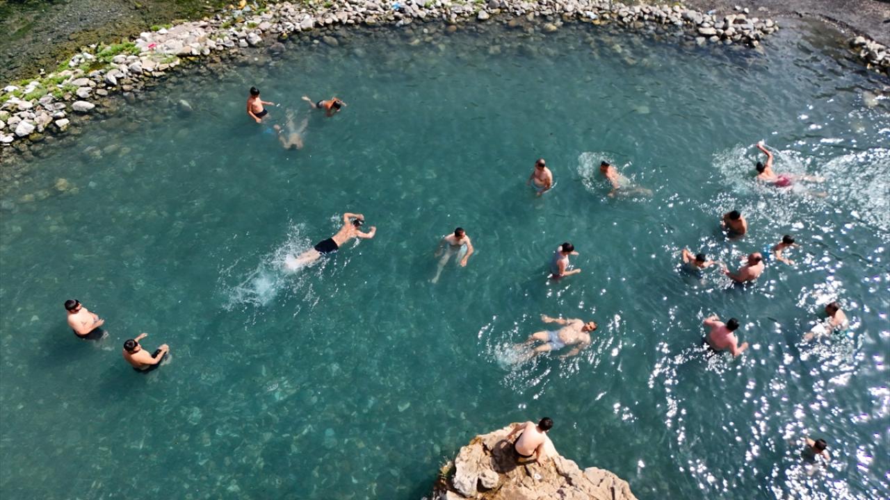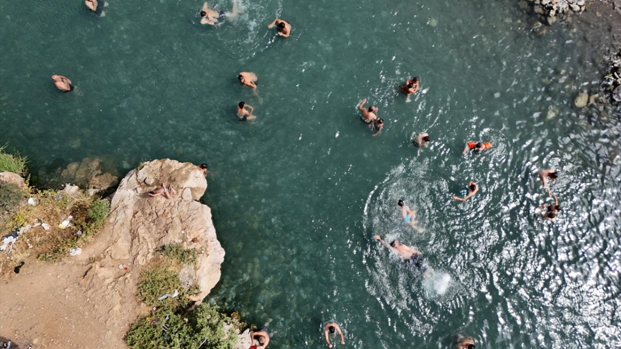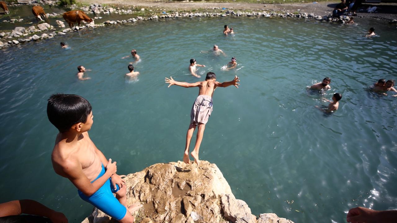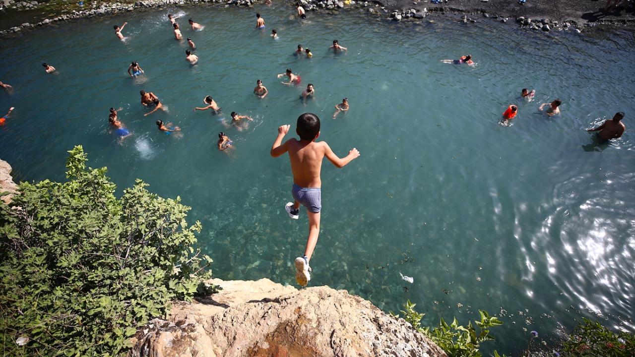 Bazı kişilerin tehlikeli olmasına rağmen yüksek kayalıktan suya atladığı görülürken, göletten çıkanlar çevrede güneşleniyor.