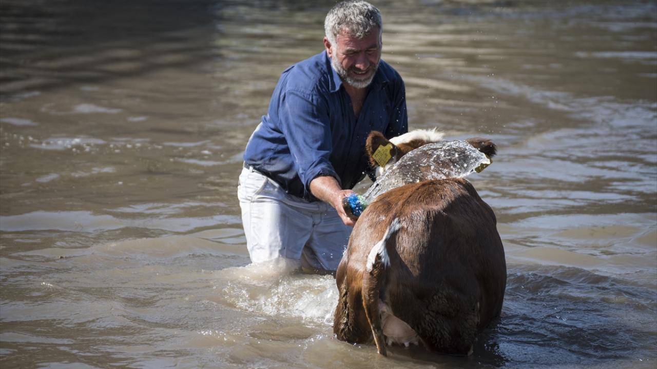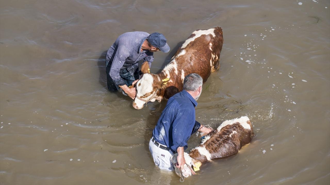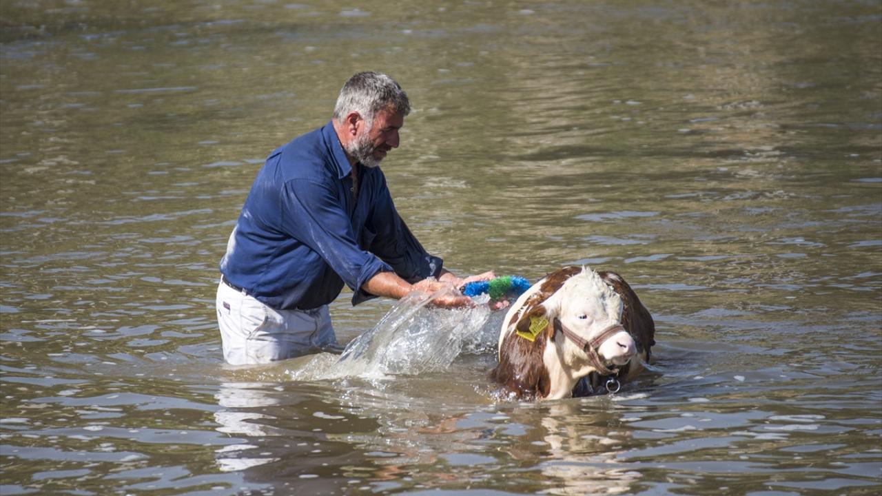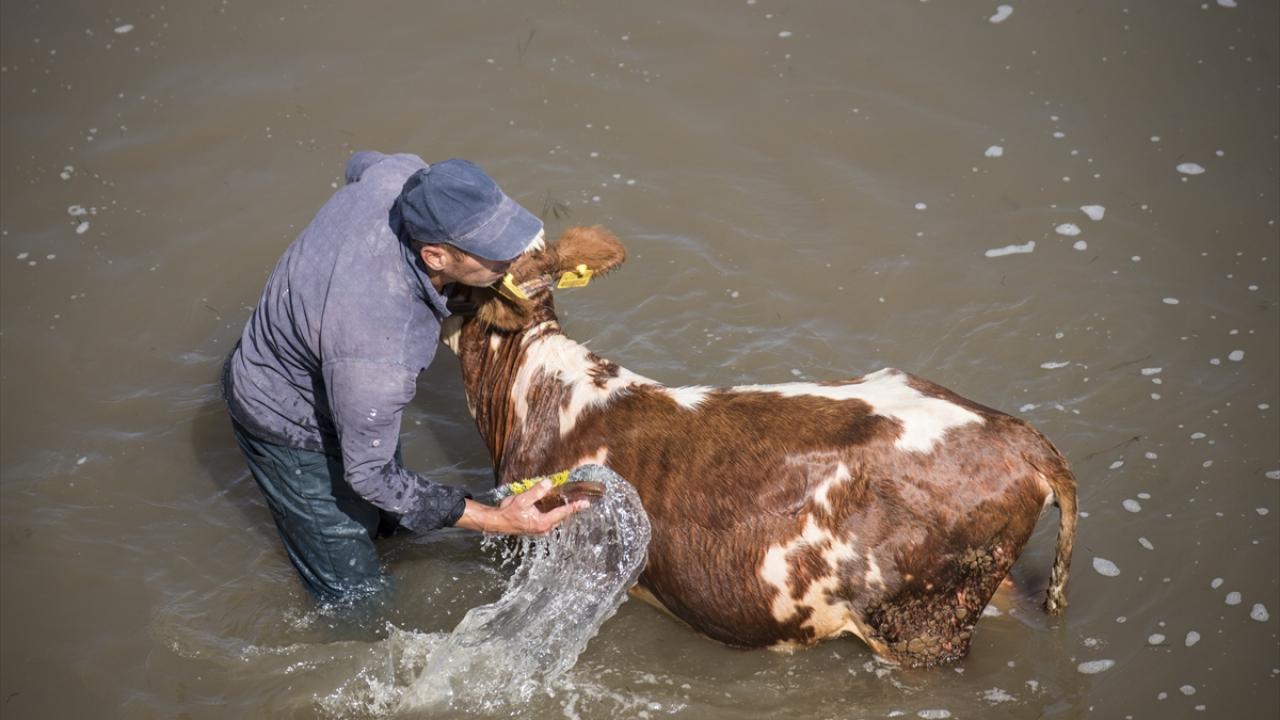 Hayvanlarıyla suya girerek yüzme keyfi yaşayan besicilerin bu anları, renkli görüntüler oluşturuyor.