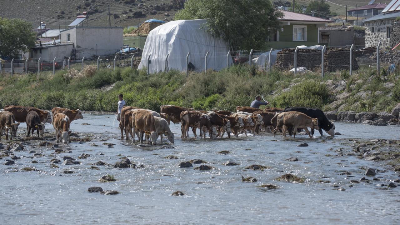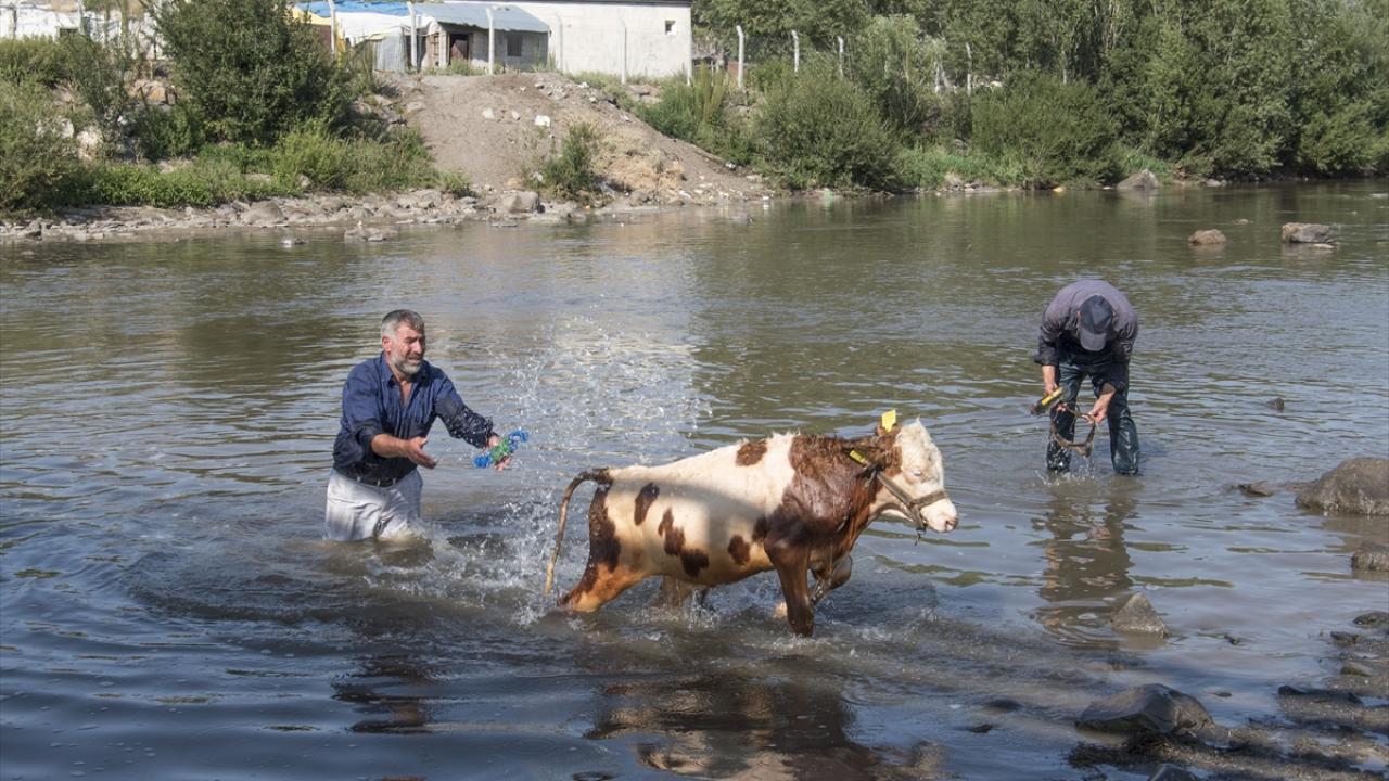 Arpaçay ilçesine bağlı Küçükçatma köyündeki bazı besiciler, büyükbaş hayvanlarını çayda yıkayarak serinlemelerini sağlıyor.