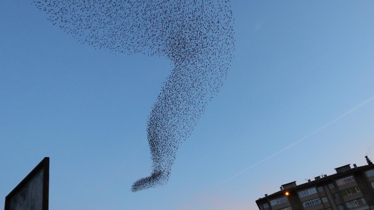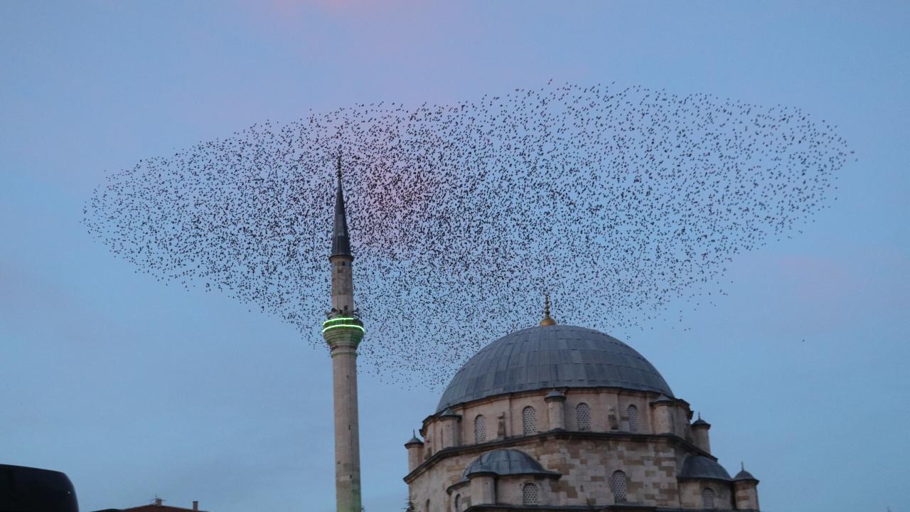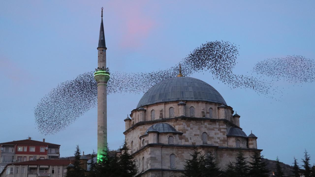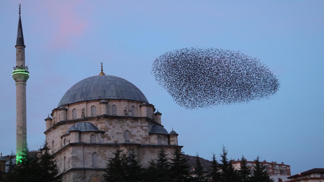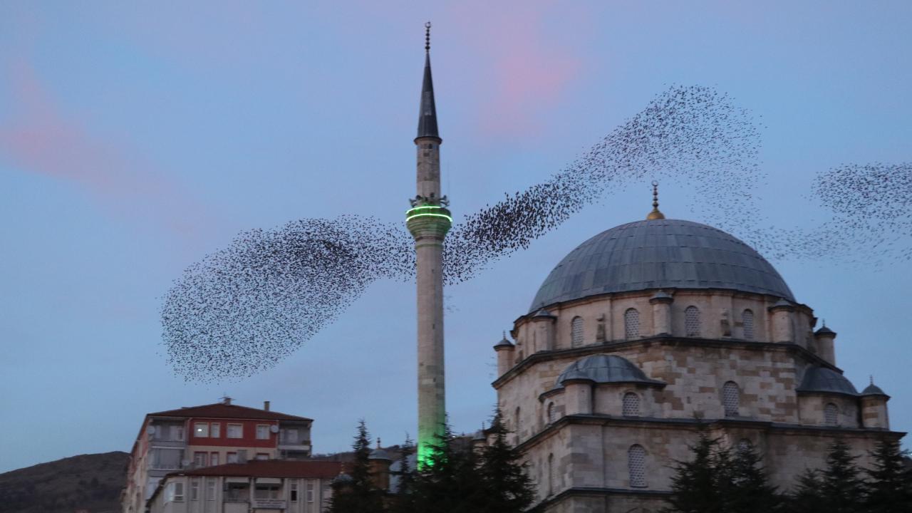 Yozgat'ta sığırcık kuşlarının akşam üzeri havada sergiledikleri toplu hareketler güzel görüntüler oluşturdu.