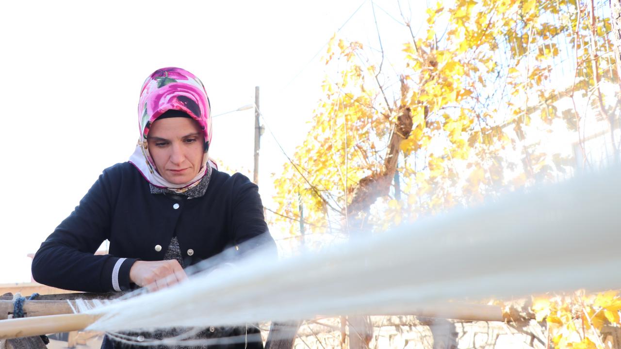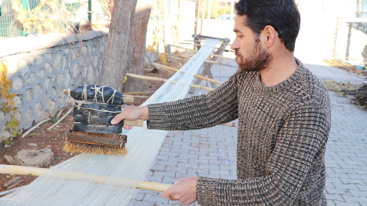 Tiftiğin birçok aşamadan geçerek dokumaya hazır hale geldiğini anlatan Çekin, "Bu basit bir kumaş değil. Çok büyük ve her aşaması emek isteyen bir kumaş. Tiftik yıkanıp eğrildikten sonra masuralara sarıyoruz. Sonra çözgü haline getiriyoruz. Daha sonra tezgahı hazırlıyoruz. Tarak ve dokuma haline gelin kumaşı el tezgahlarında dokuduktan sonra yıkamaya alıyoruz. Kök boyayla renklendiriyoruz. Bazı işlemlerden kalıplara sarıyoruz. Bir saat suda kaynatıyoruz ve sonra presleyerek bir gün bekletip, hazır hale getiriyoruz." ifadelerini kullandı.