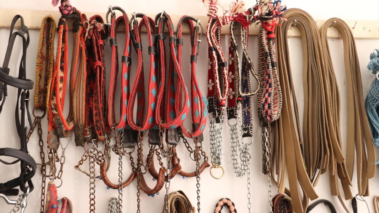 Tınaztepe Mahallesi`ndeki iş yerlerinde deriye şekil veren Tokgöz kardeşler, koşum takımı, hamut (koşum sırasında atların boynuna geçirilen çember), kayış, kemer, eyer ve at yuları yapıyor.