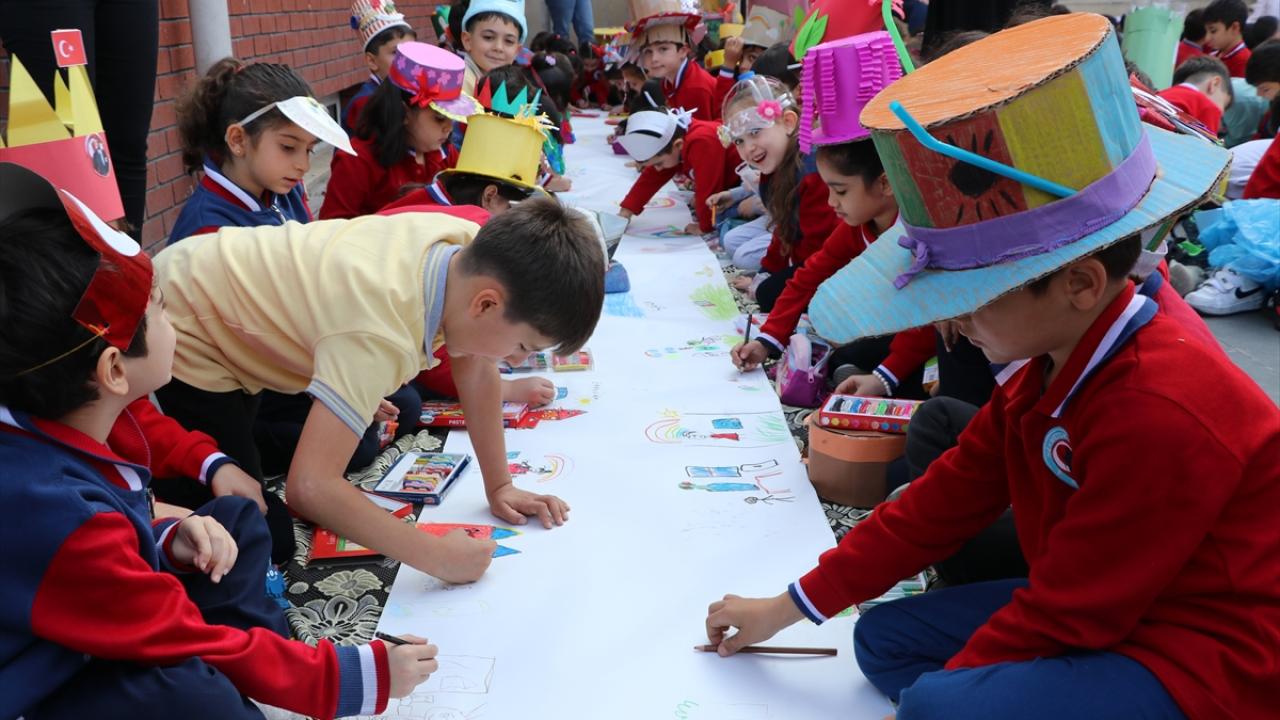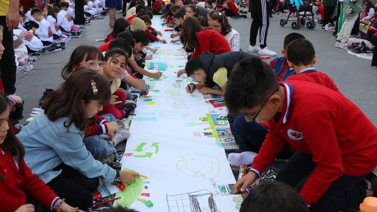 Çevre konusunda farkındalık sağlanması için bu yıl üçüncüsü gerçekleştirilen etkinlikte, okul bahçesinde toplanan 1500 öğrenci, aynı anda bir saat boyunca 10`ar metrelik kağıtlara resim yaptı.