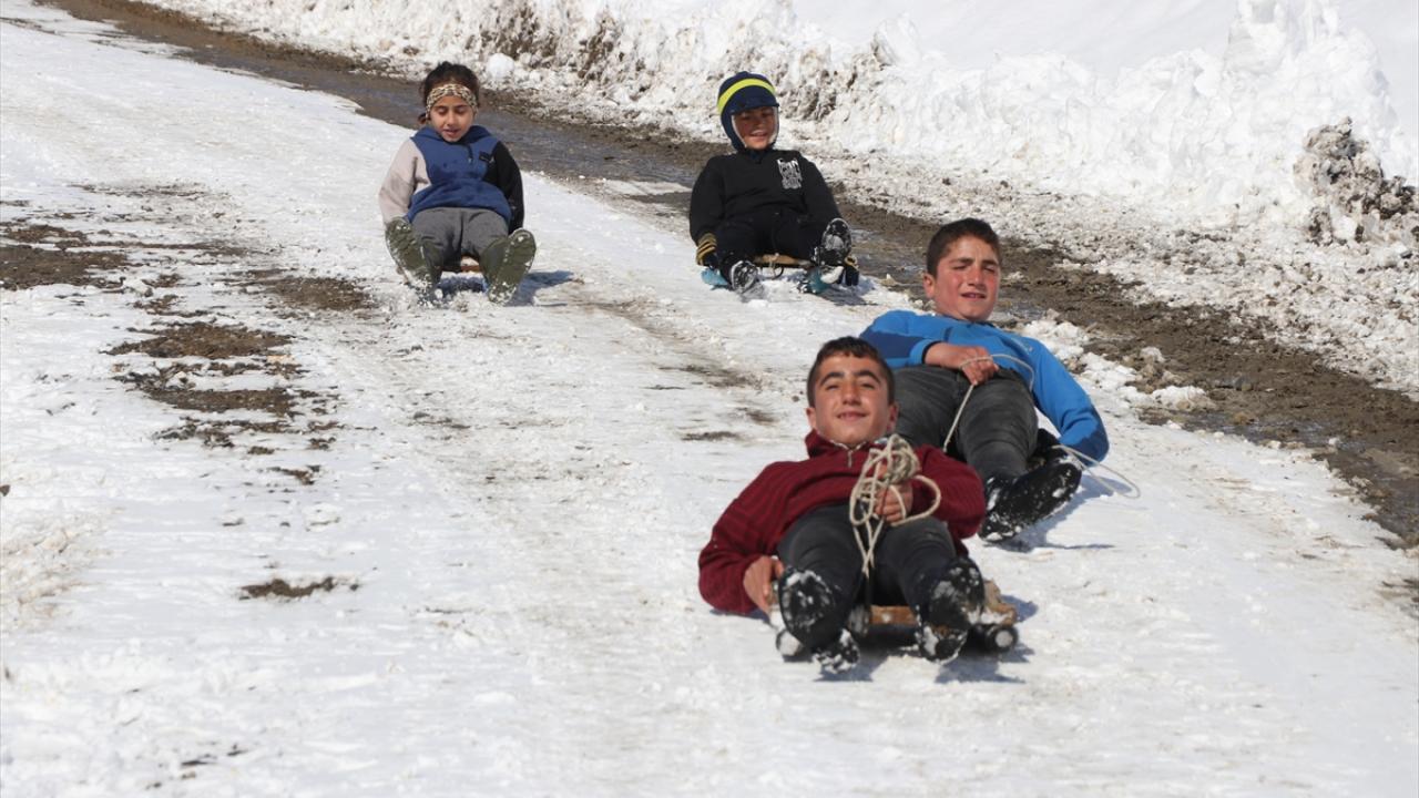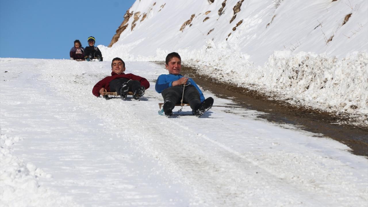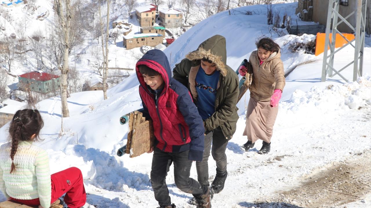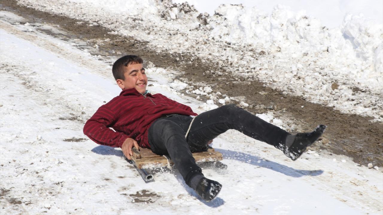 Kar yağışını fırsat bilen köylü çocuklar, tahta kızaklarıyla kayarak kar keyfi yaşadı.