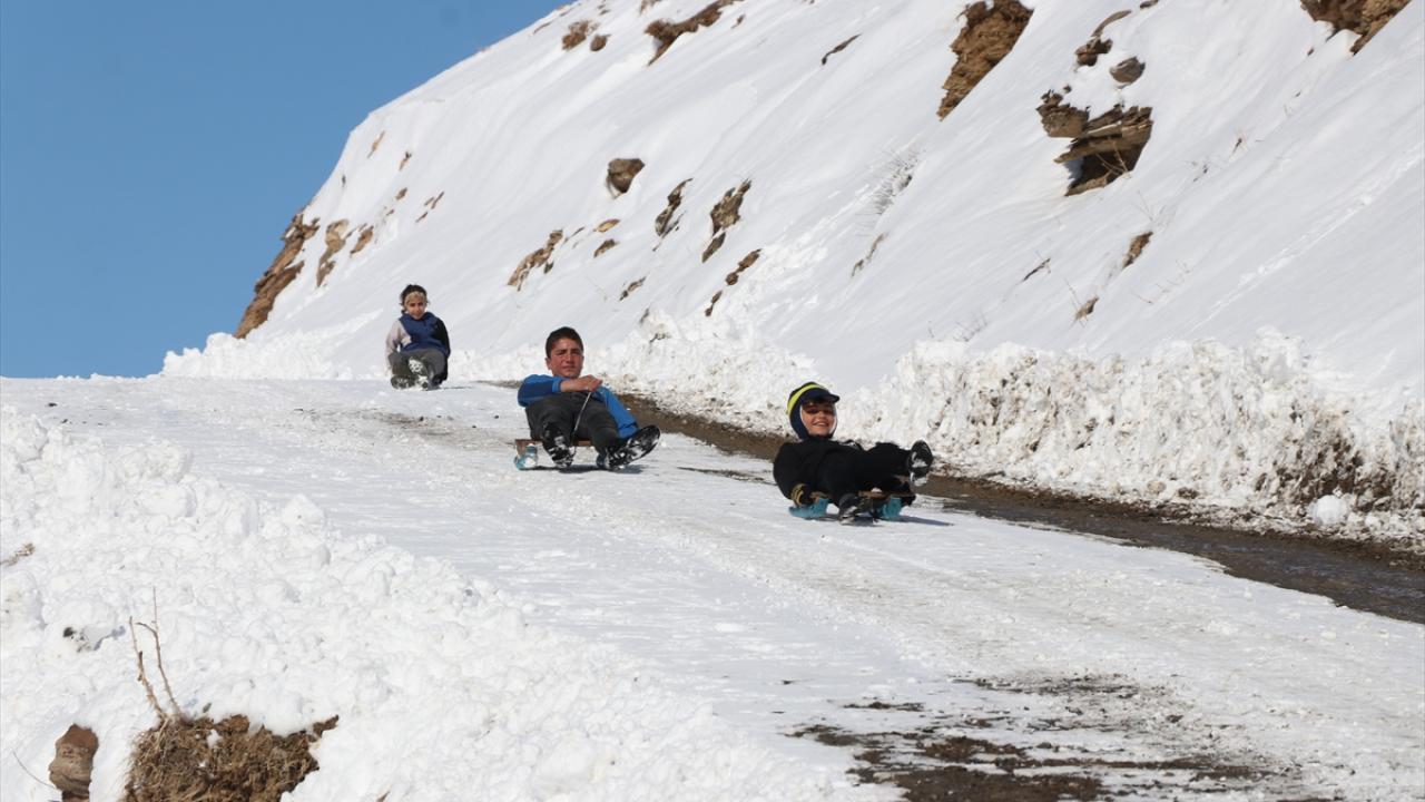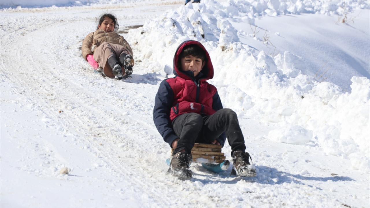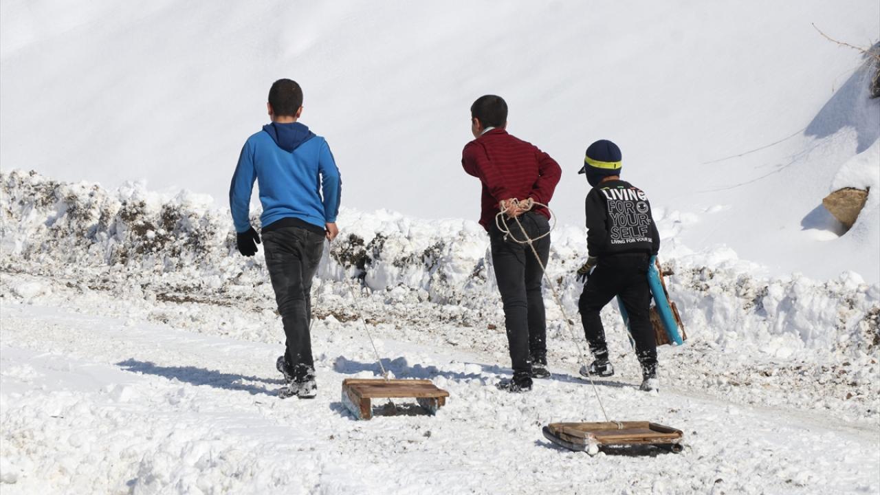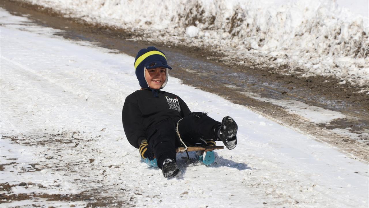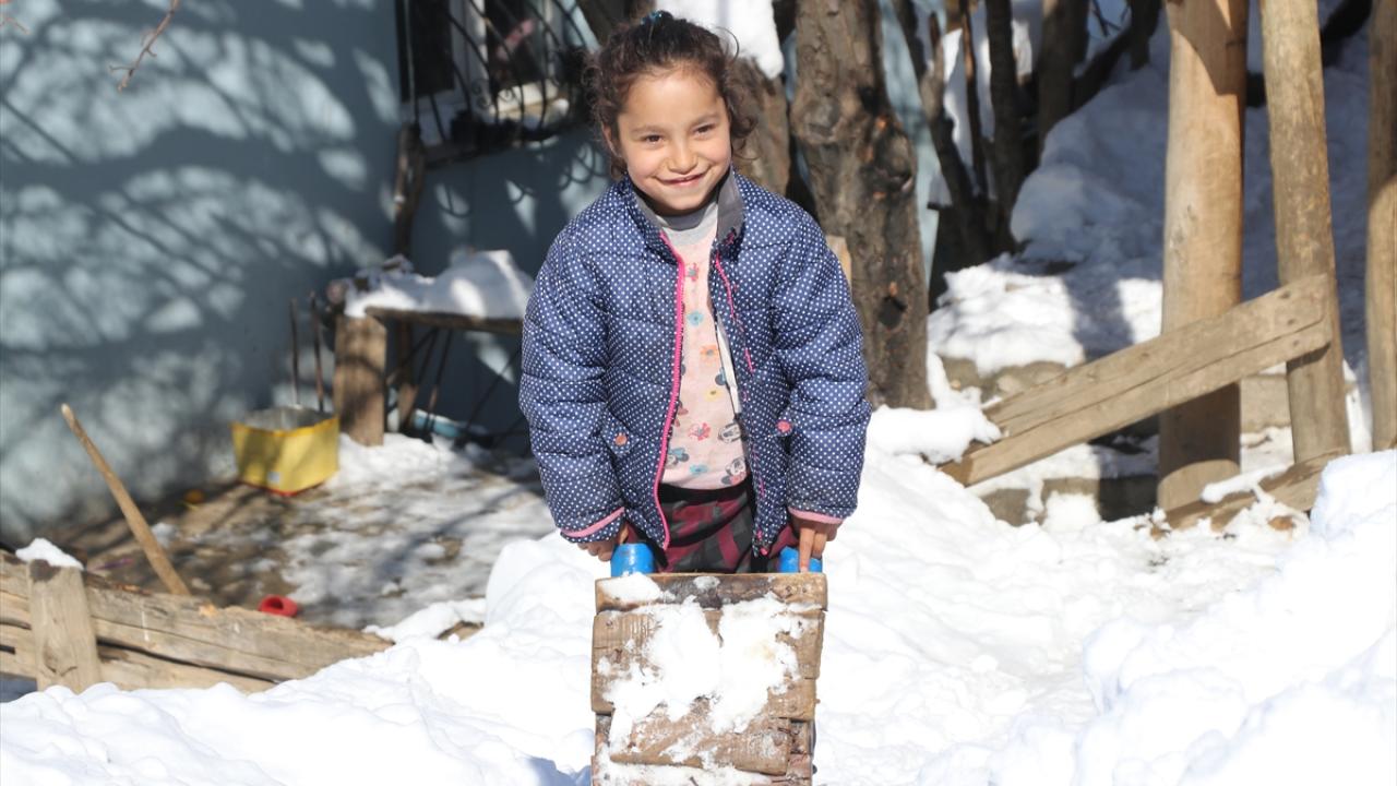 Kar yağışını fırsat bilen köylü çocuklar, tahta kızaklarıyla kayarak kar keyfi yaşadı.