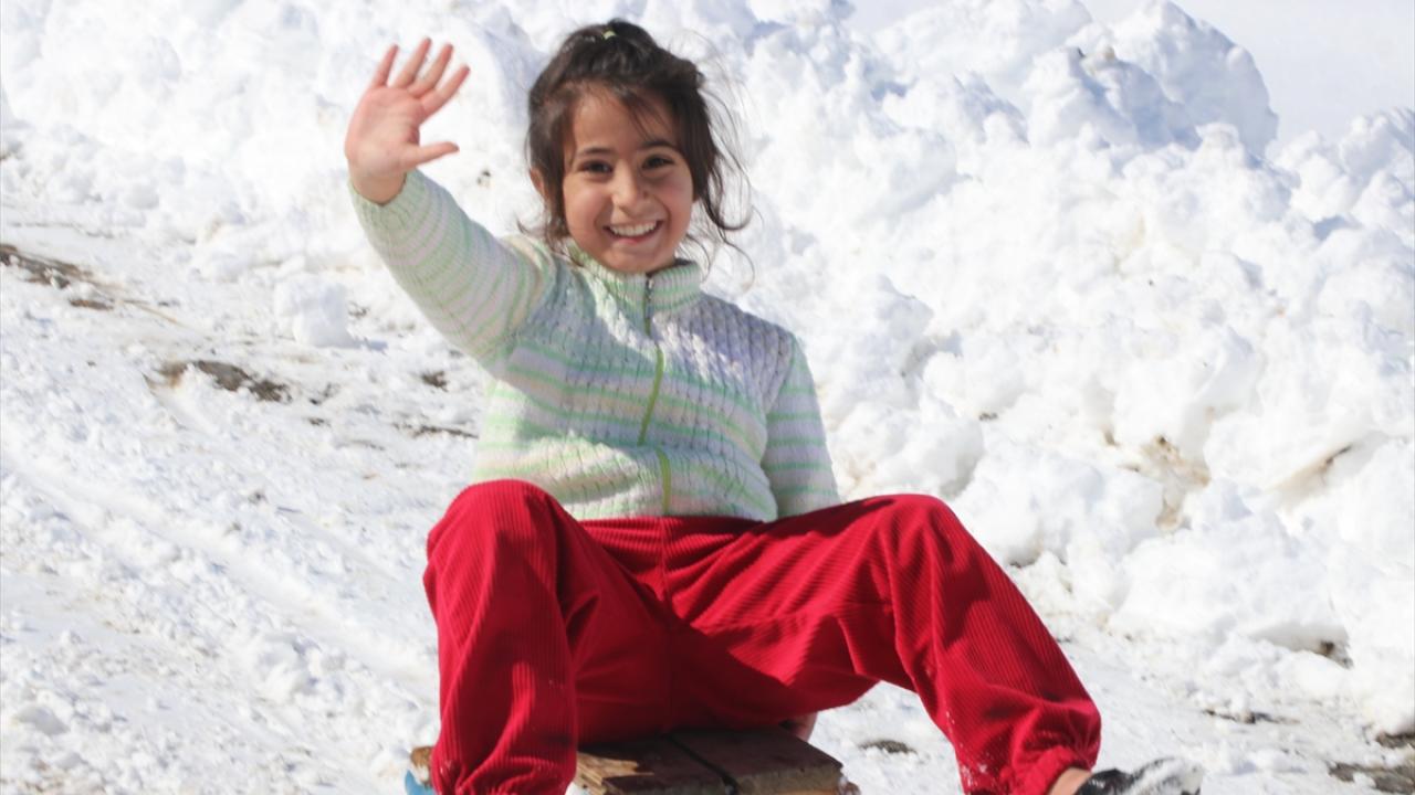 Kendi imkanlarıyla tahta kızaklar yaptıklarını dile getiren Cebe, "Çok keyifli vakit geçiriyoruz. İpleri birbirine bağlayarak oluşturduğumuz kızaklarla tepeden iniyoruz. Karı özlemiştik." dedi.