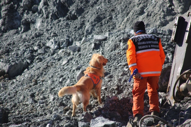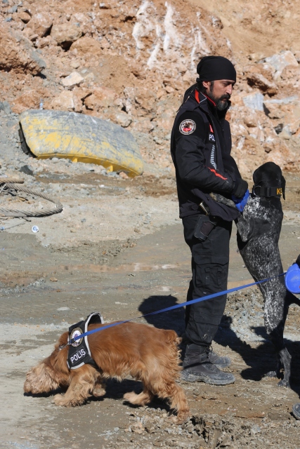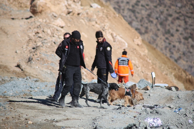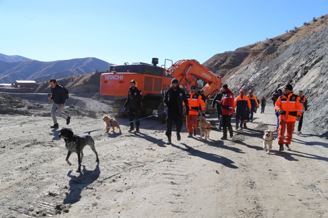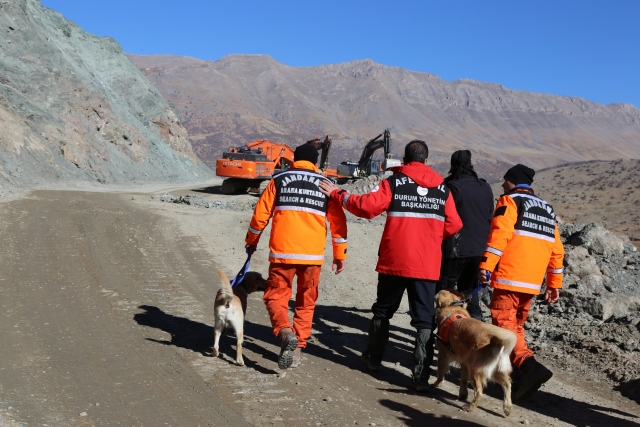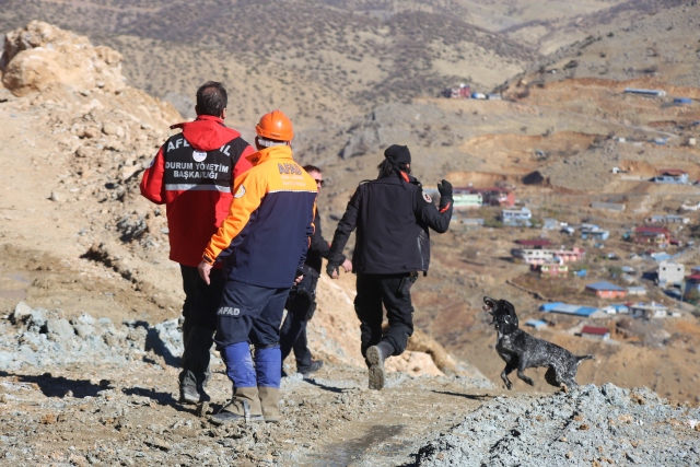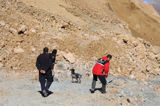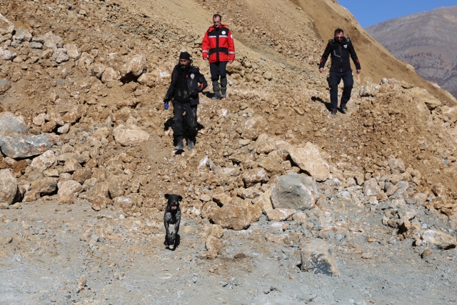 Siirt'in Şirvan ilçesinde özel maden ocağında meydana gelen heyelanda toprak altında kalan işçiler için yürütülen çalışmalar kapsamında İş makineleri ile yürütülen çalışmaya yaklaşık bir saat ara verilerek, Emniyet Genel Müdürlüğü Uyuşturucu ile Mücadele Daire Başkanlığı, Jandarma Genel Komutanlığı Doğal Afetler Arama Kurtarma Tabur Komutanlığı ile AFAD'a ait 15 eğitimli köpek yardımıyla enkazın bulunduğu bölgede arama yapıldı.