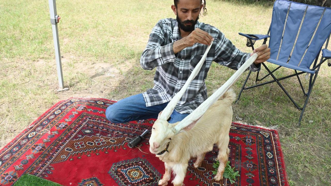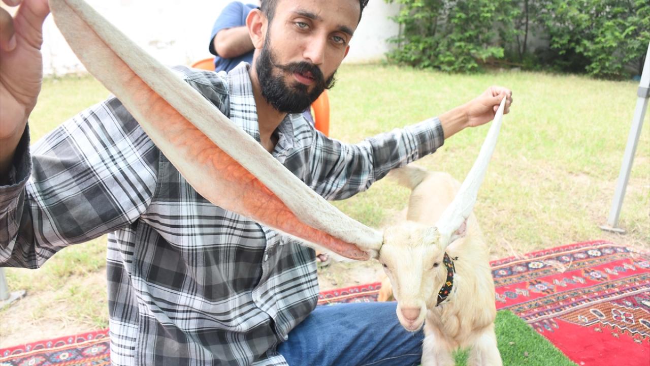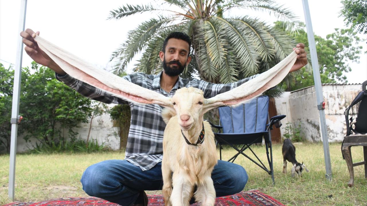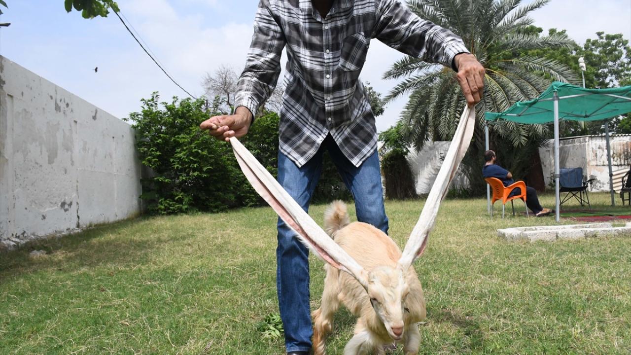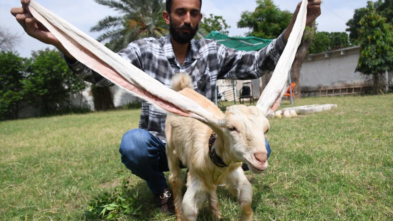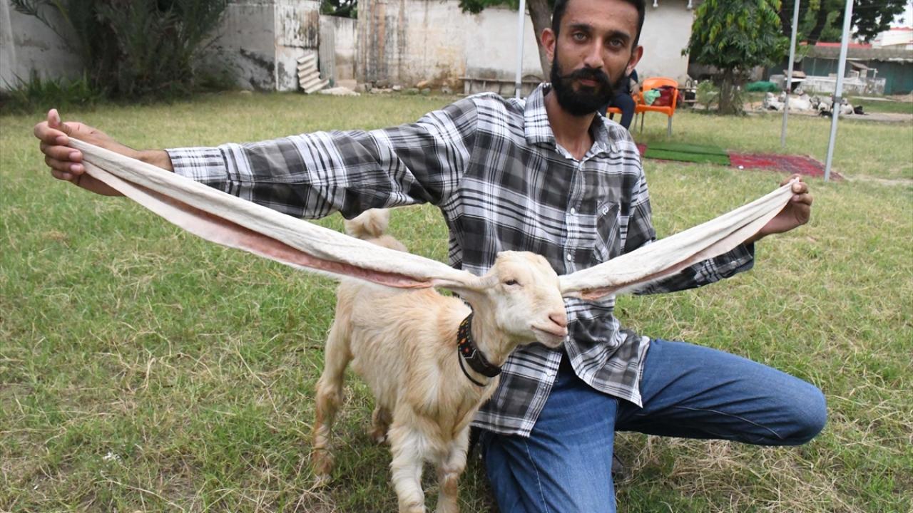 Pakistan'ın Karaçi şehrinde 64 cm uzunluğunda kulaklarıyla doğan Simba isimli yavru keçi, Guinness Rekorlar Kitabına girmeyi bekliyor.