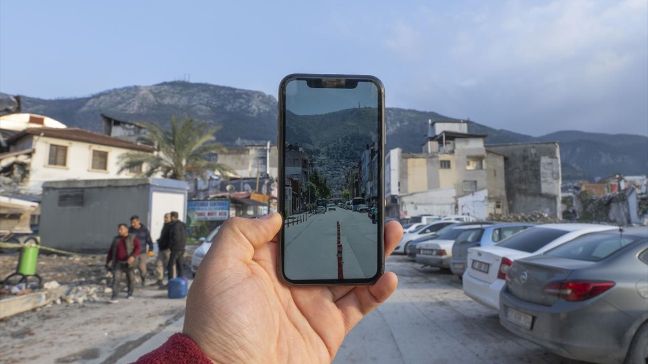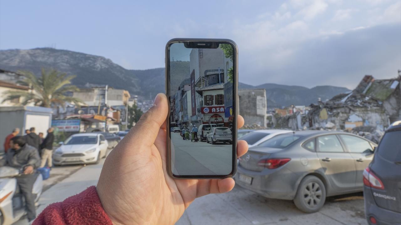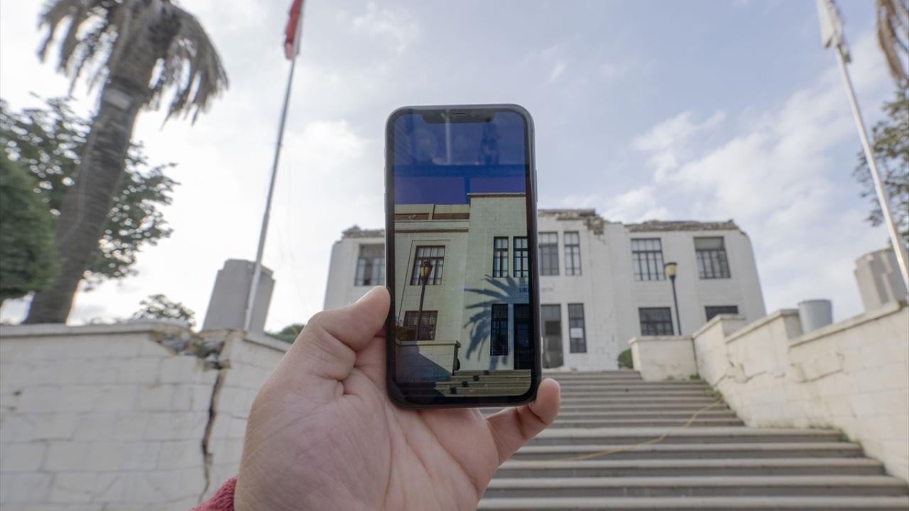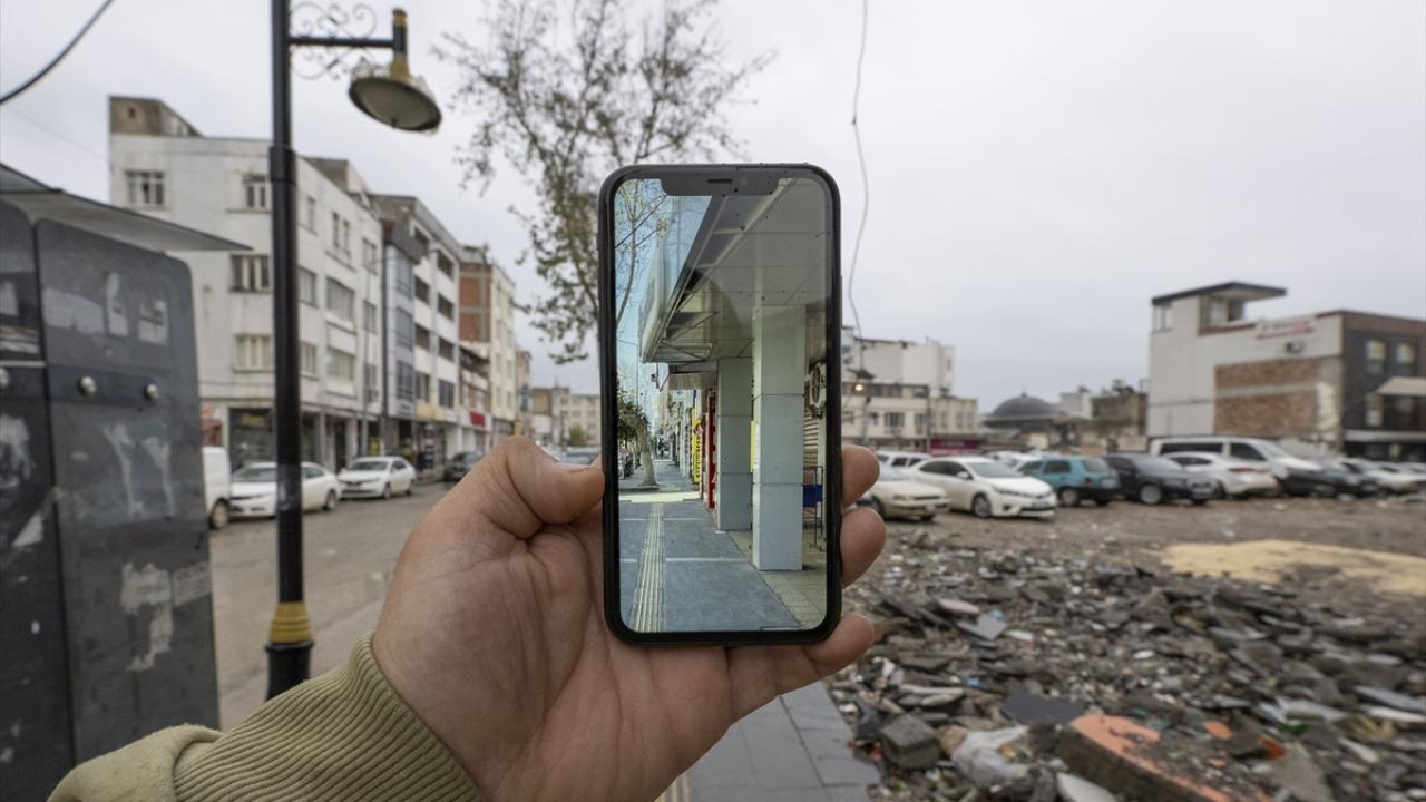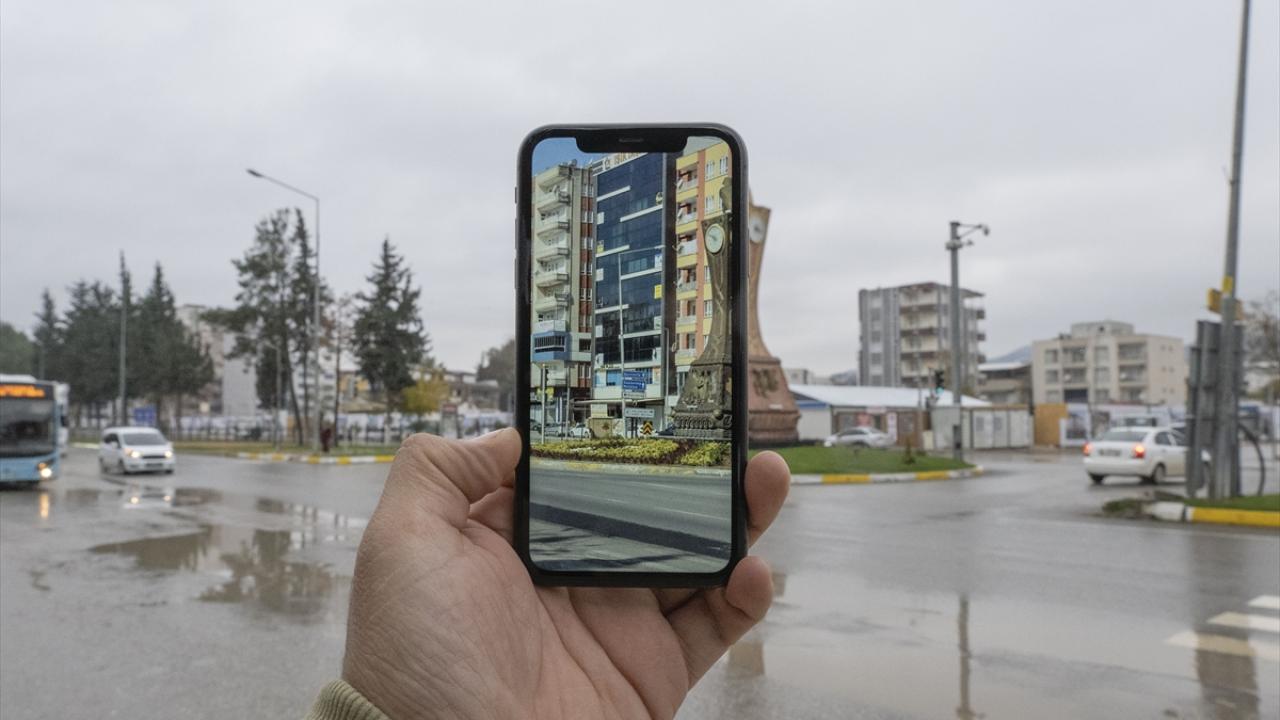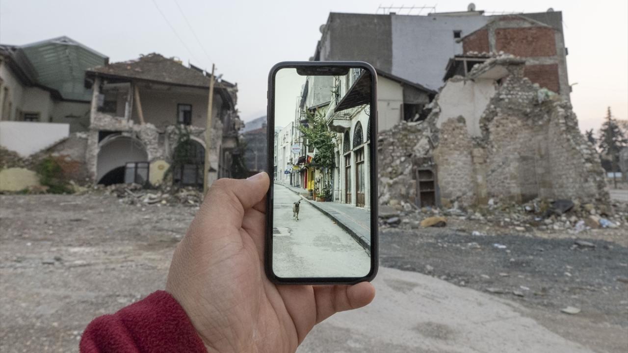 Cep telefonu ekranına bir bölümü yansıtılan depremden önceki fotoğrafların, aynı açıdan geniş bir kadraj içerisinde yeniden çekilmesiyle oluşturulan çalışmada, tarihi yapı ve simgelerin hasar almadan önceki ve güncel durumları aynı karede yer aldı.