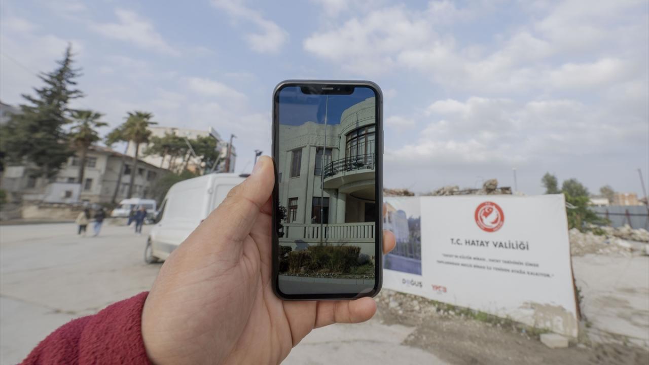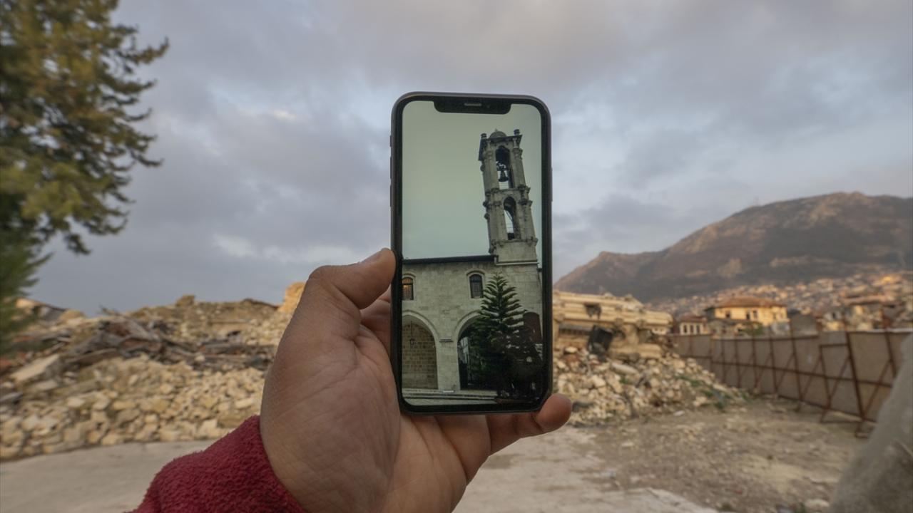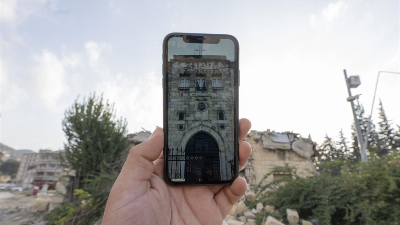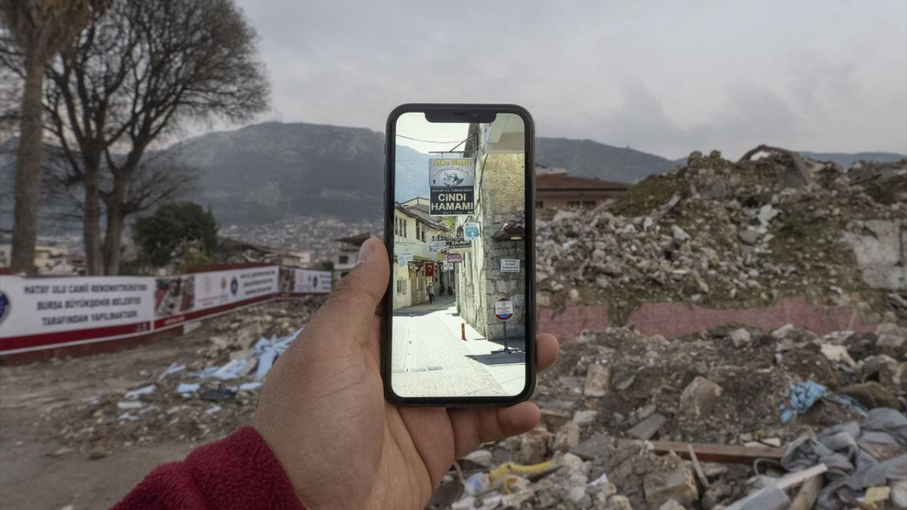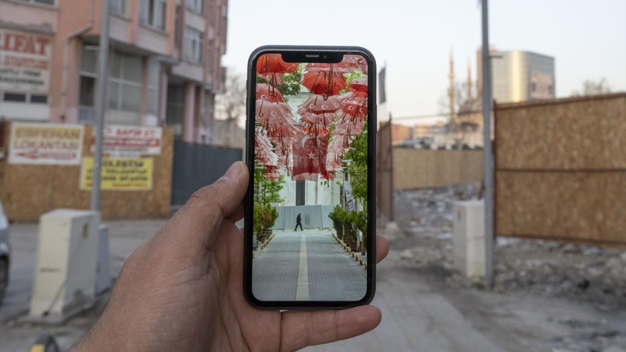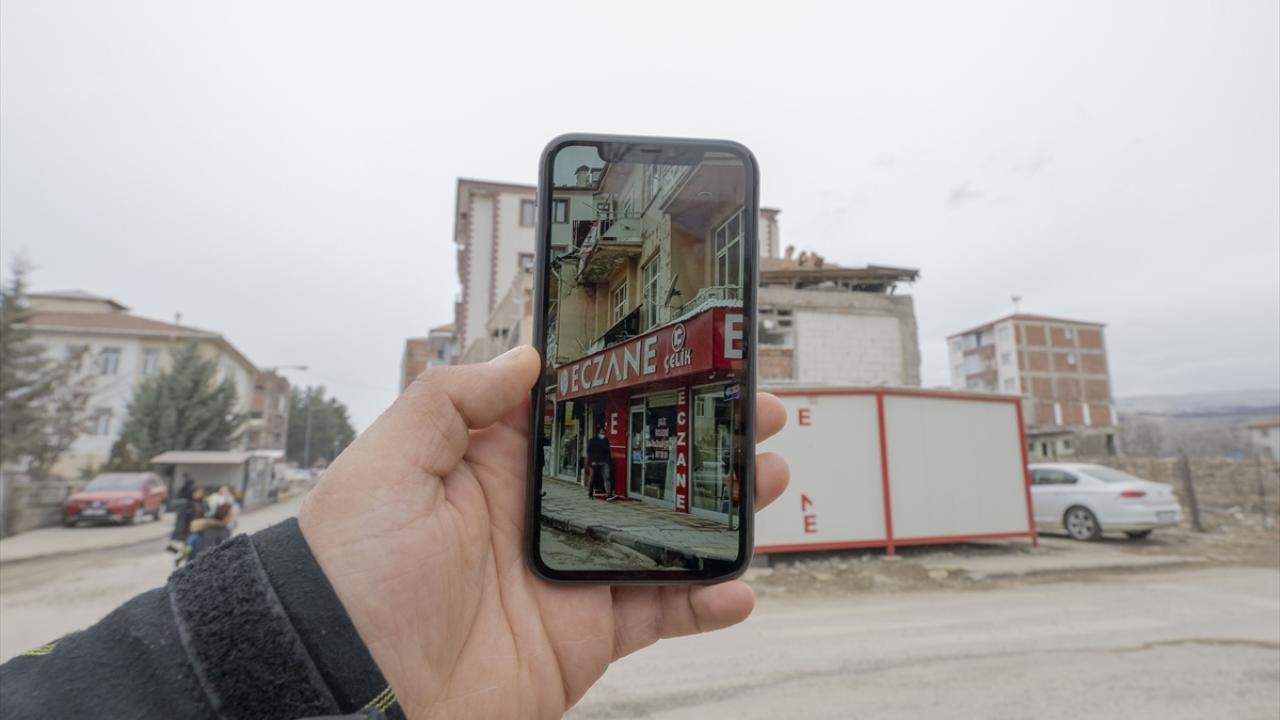 Cep telefonu ekranına bir bölümü yansıtılan depremden önceki fotoğrafların, aynı açıdan geniş bir kadraj içerisinde yeniden çekilmesiyle oluşturulan çalışmada, tarihi yapı ve simgelerin hasar almadan önceki ve güncel durumları aynı karede yer aldı.