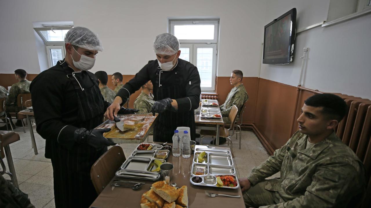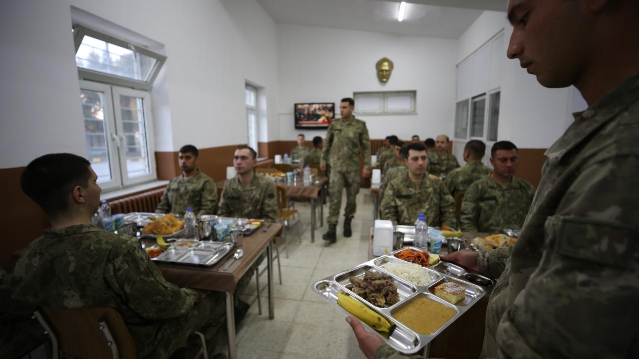 Karakolun yemekhanesinde komutanlarıyla iftar sofrasında buluşan Mehmetçik, ramazanın ilk akşam ezanının okunmasıyla dua etti, orucunu açtı.