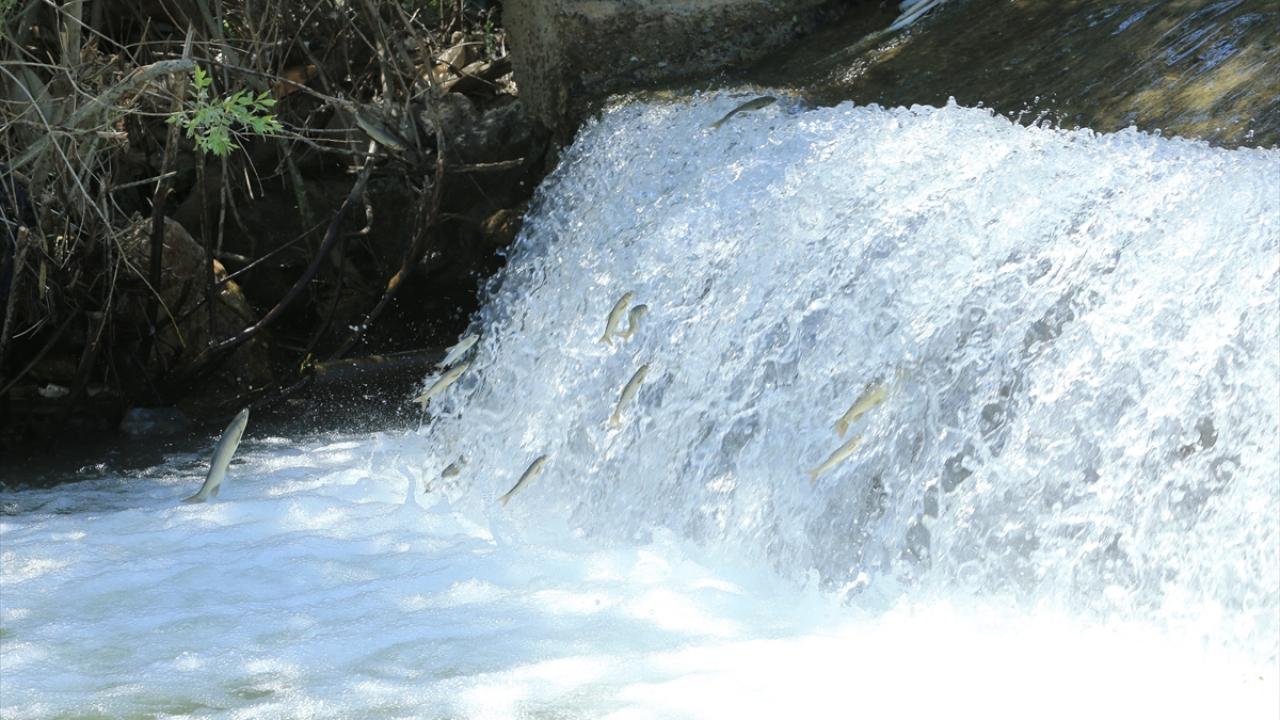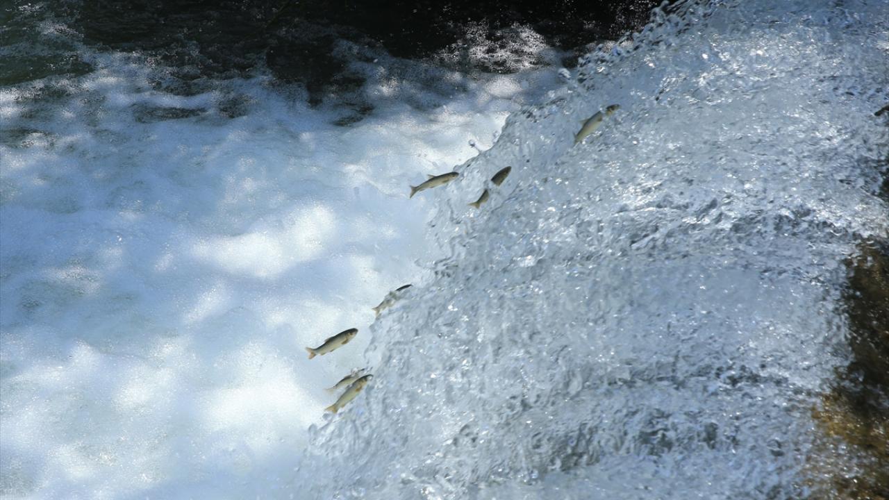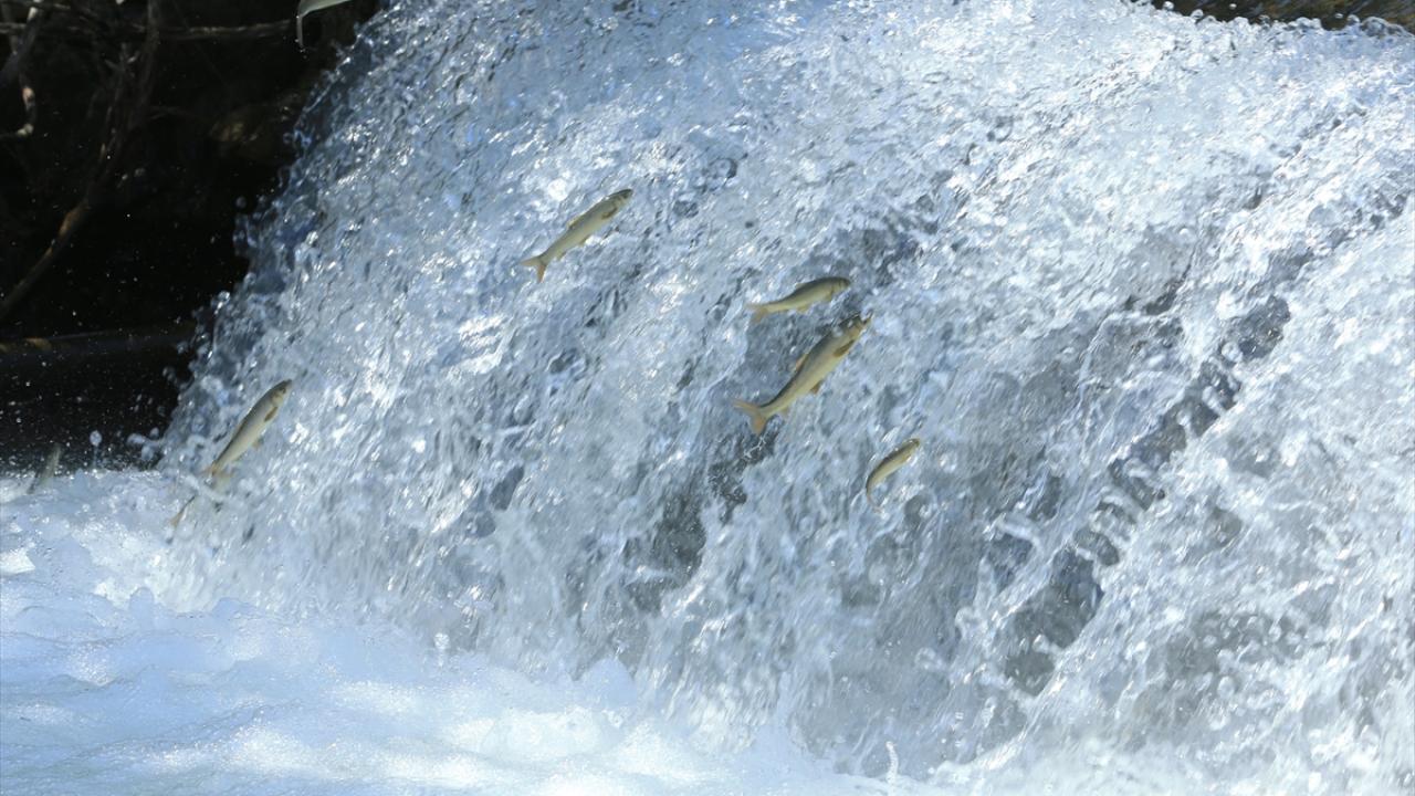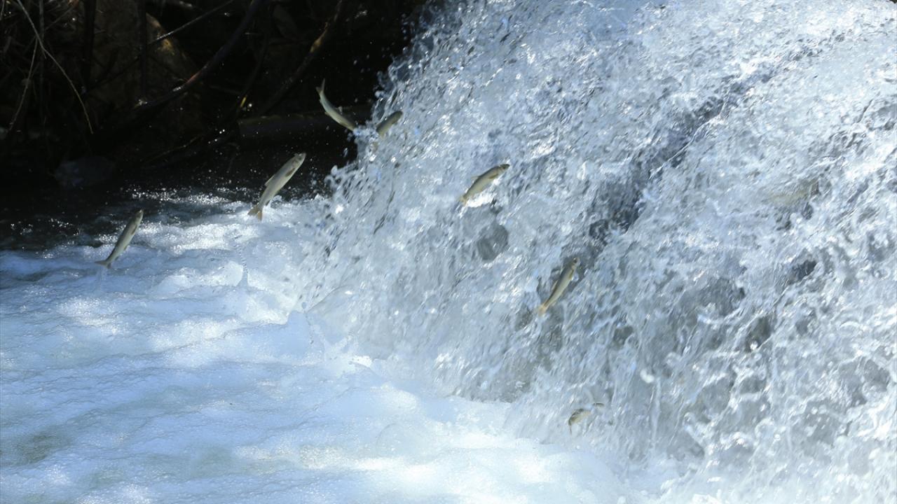 Yumurta bırakmak için Kürk Deresi başta olmak üzere bölgedeki derelere yüzen çok sayıda siraz balığı, önüne çıkan engelleri zıplayarak aşıyor.