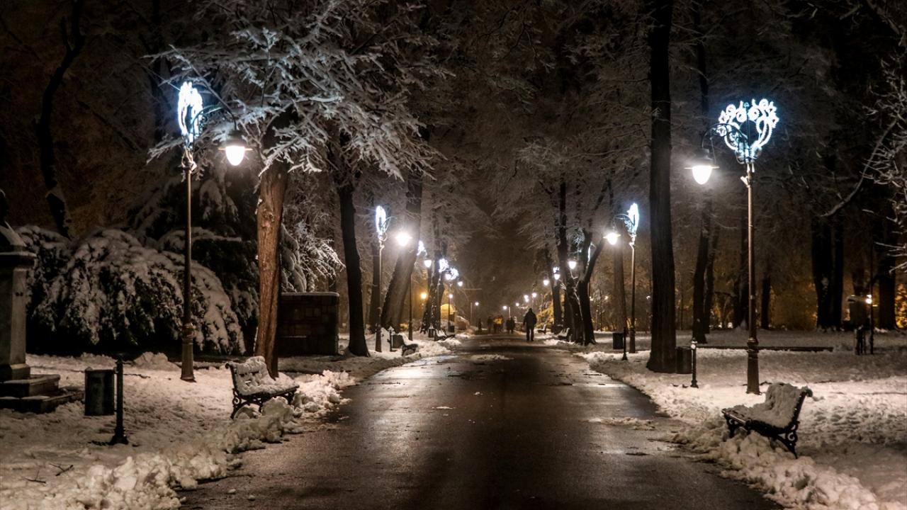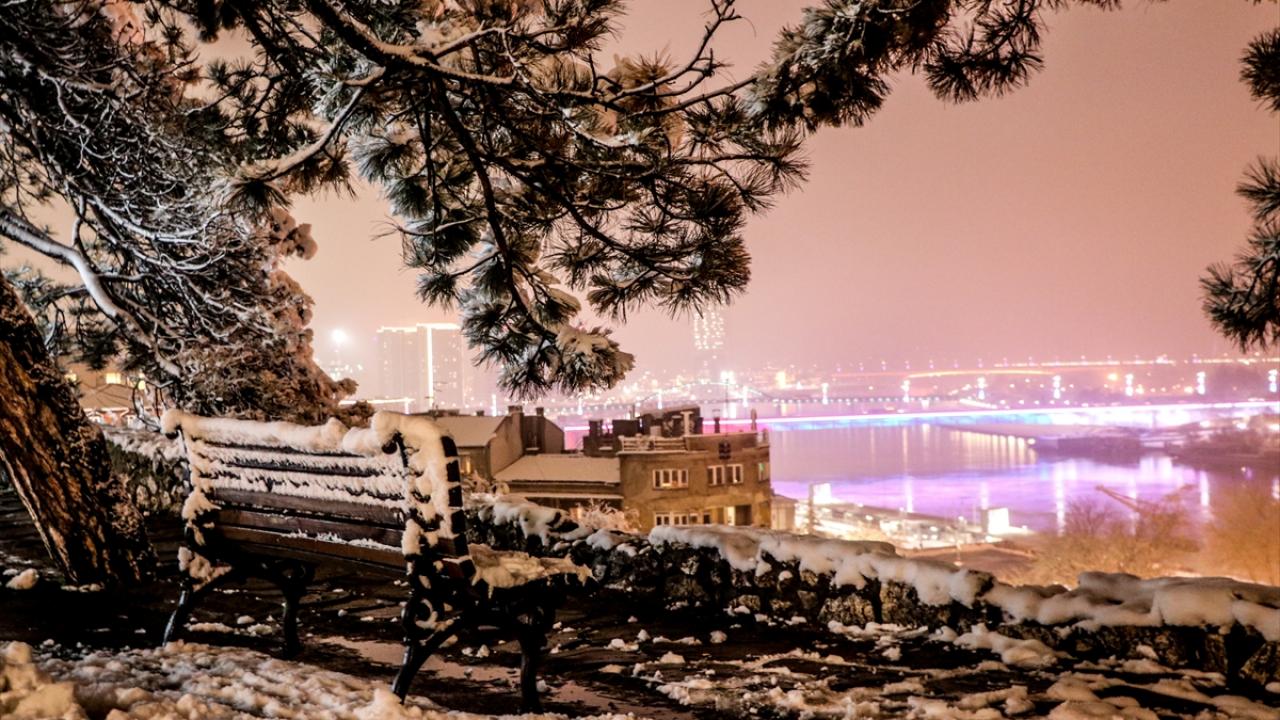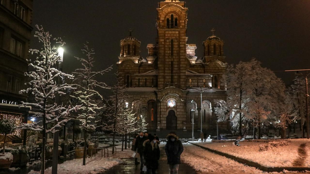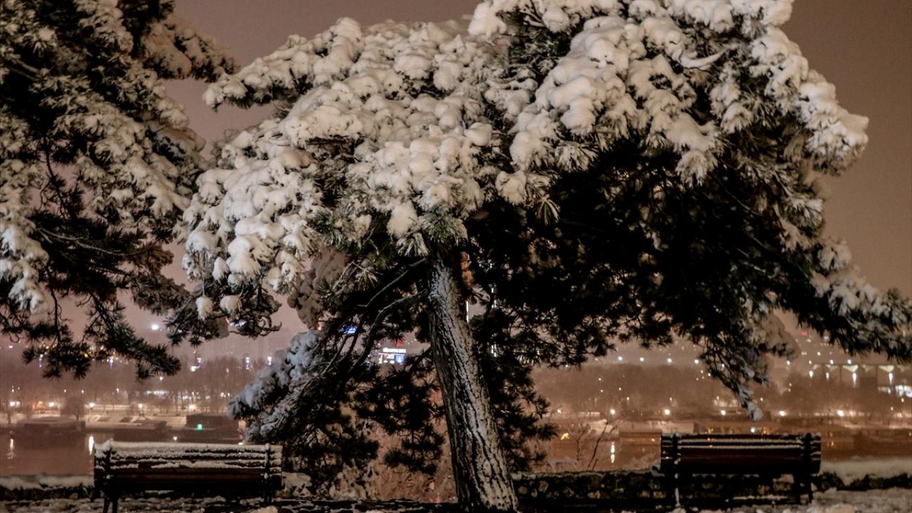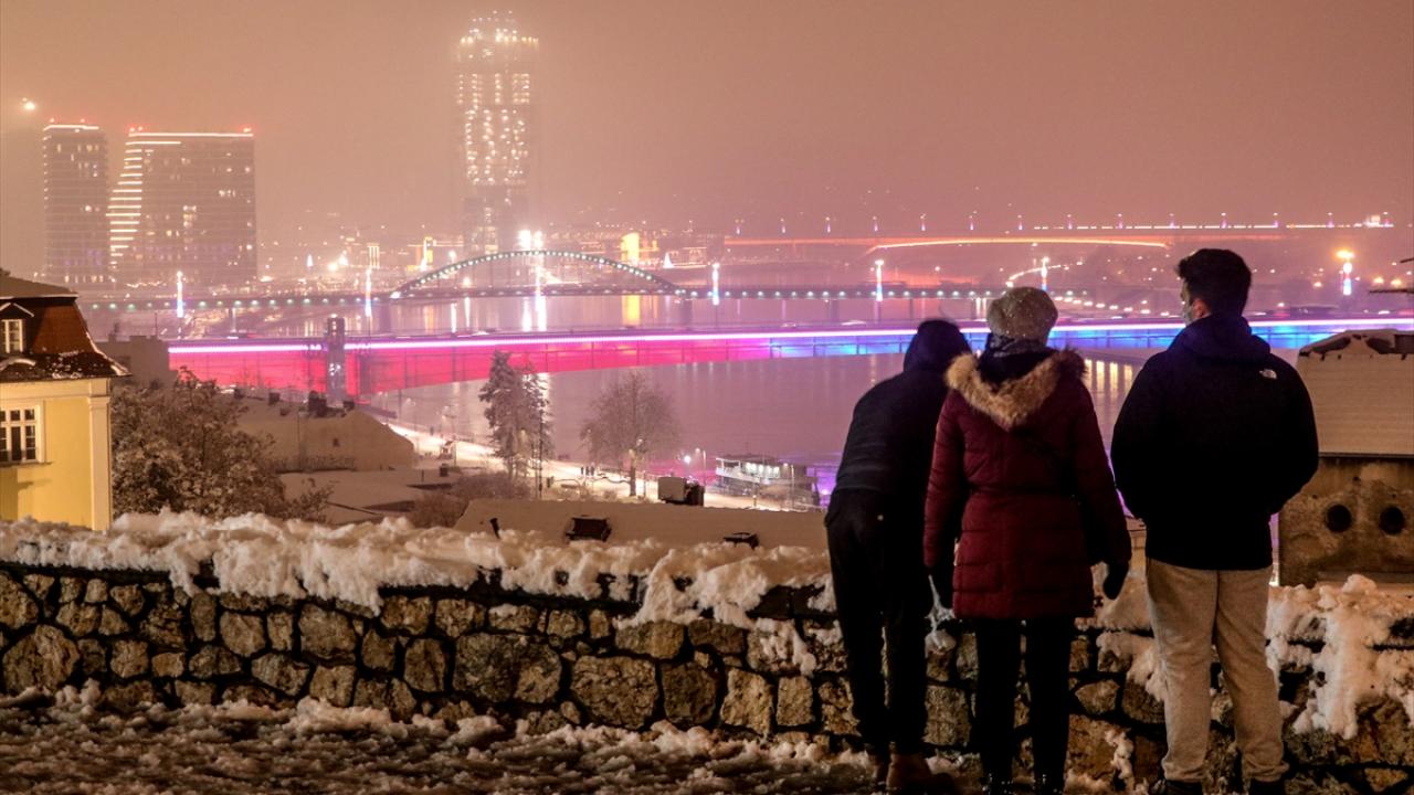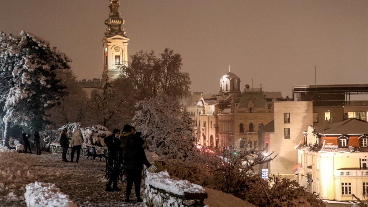 Sırbistan'ın başkenti Belgrad'da etkili olan kar yağışıyla şehir beyaza büründü. Yağan kar, akşam ışıklarıyla Belgrad'da görsel bir şölen oluşturdu.