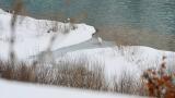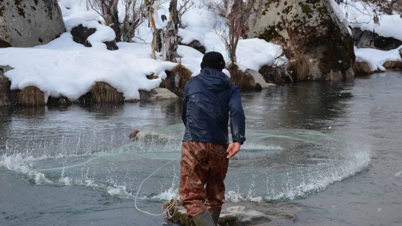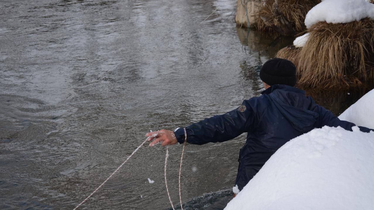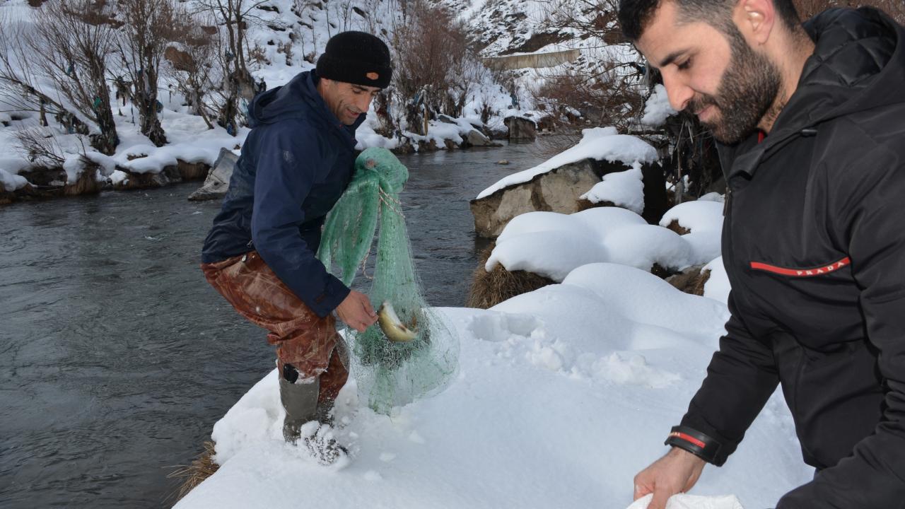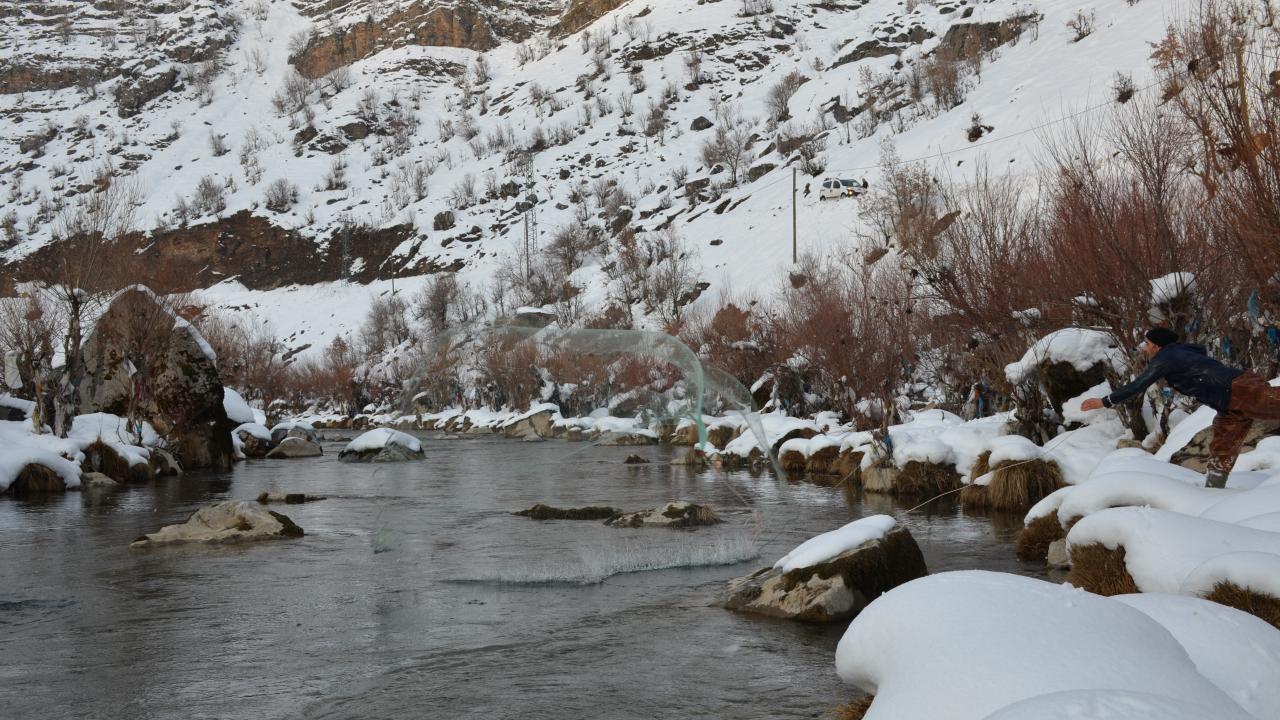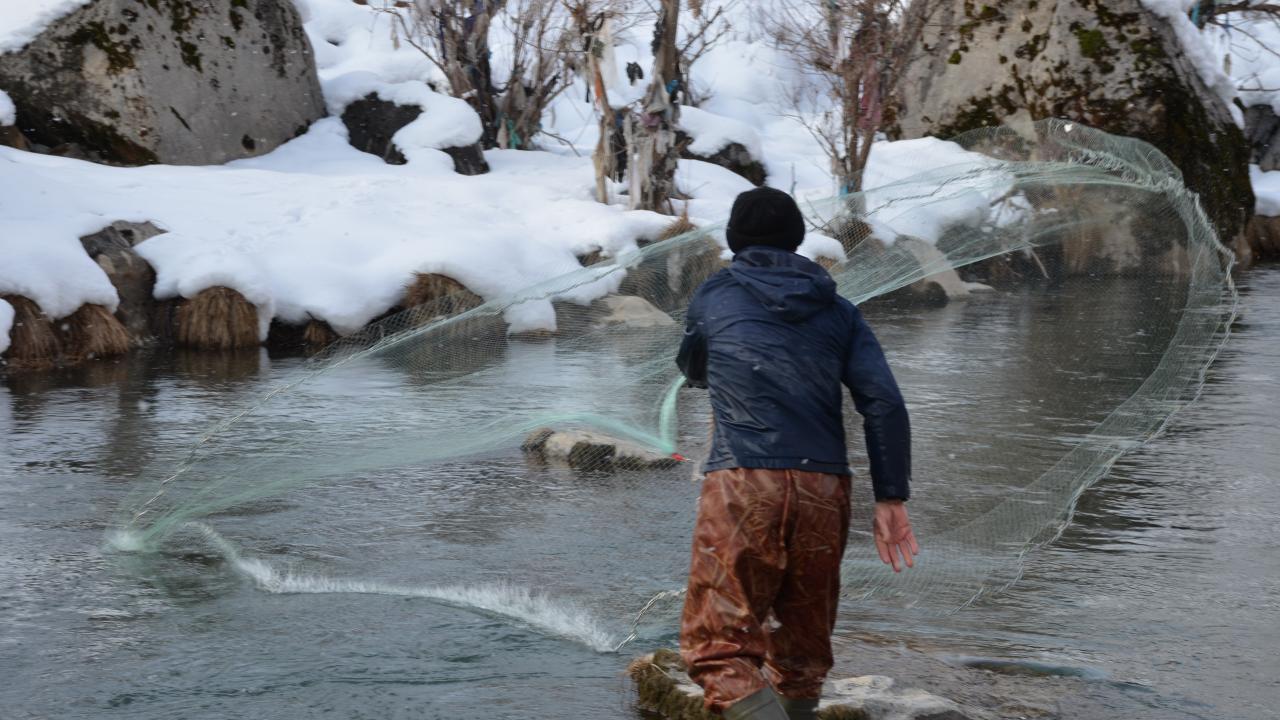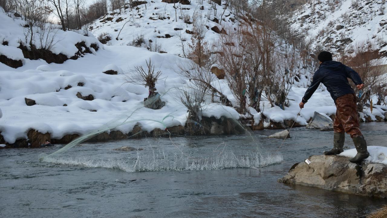 Kilosunu 25 liradan satarak geçimini sağlayan yöre halkı, soğuk havalara aldırış etmeden giydikleri tulumlar sayesinde 2 metreyi bulan derinliklerde alabalık avlamaya çalışıyor.
