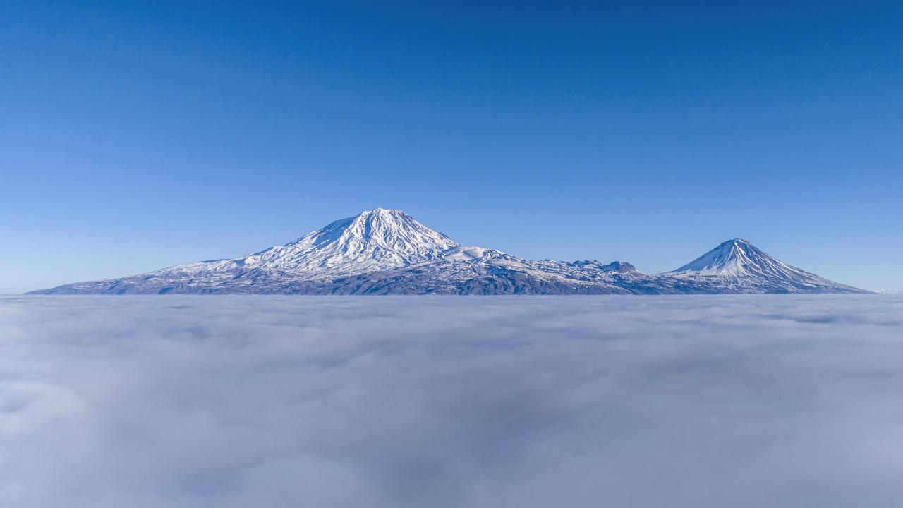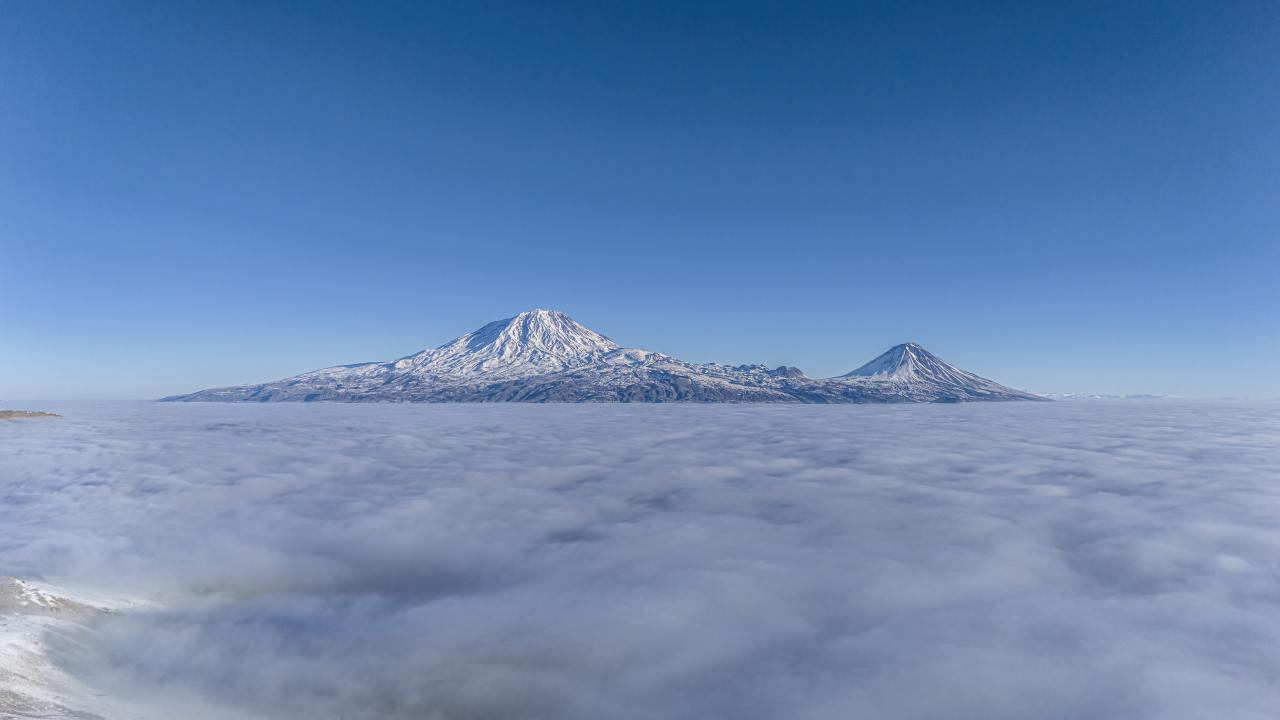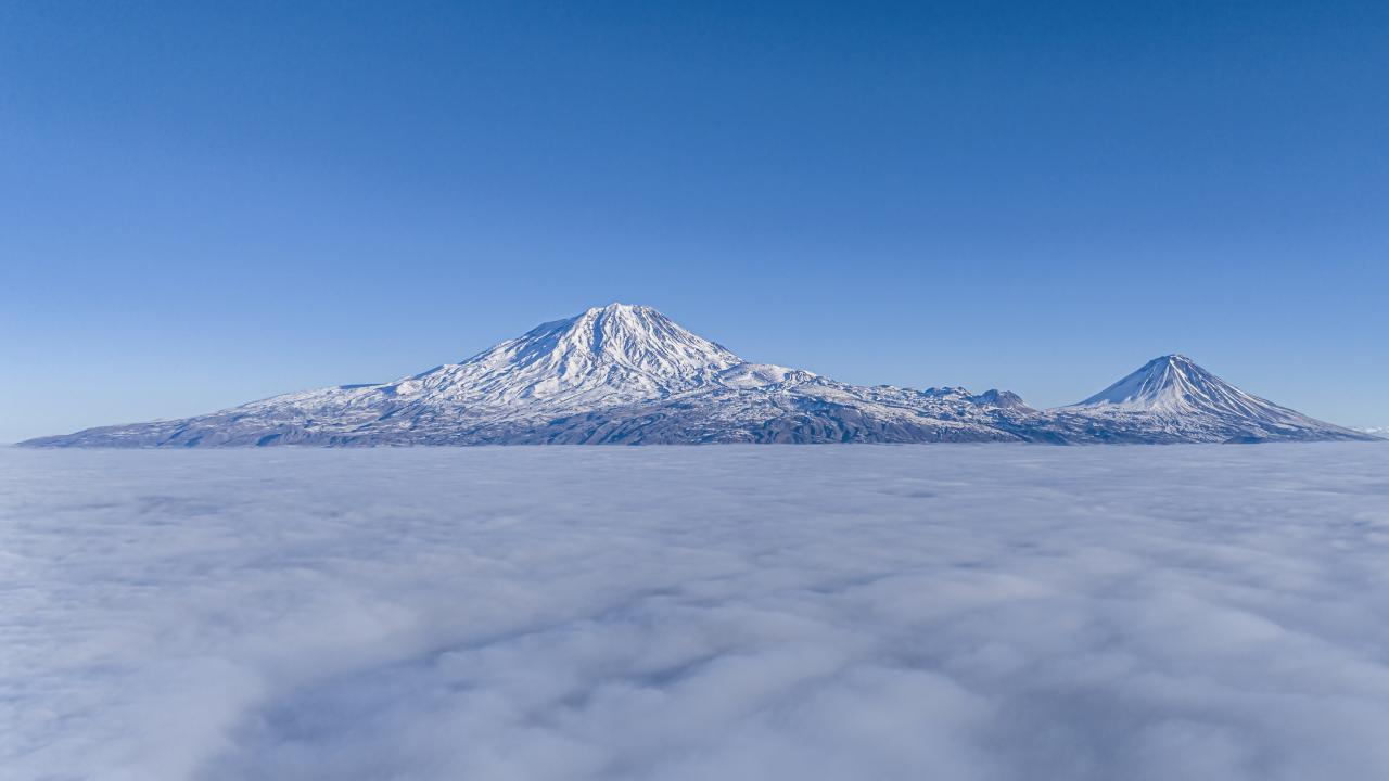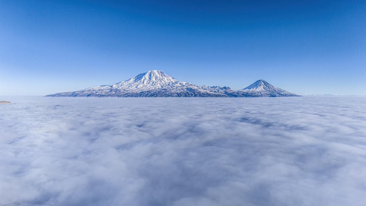 Sis bulutu üstünden Büyük ve Küçük Ağrı Dağı