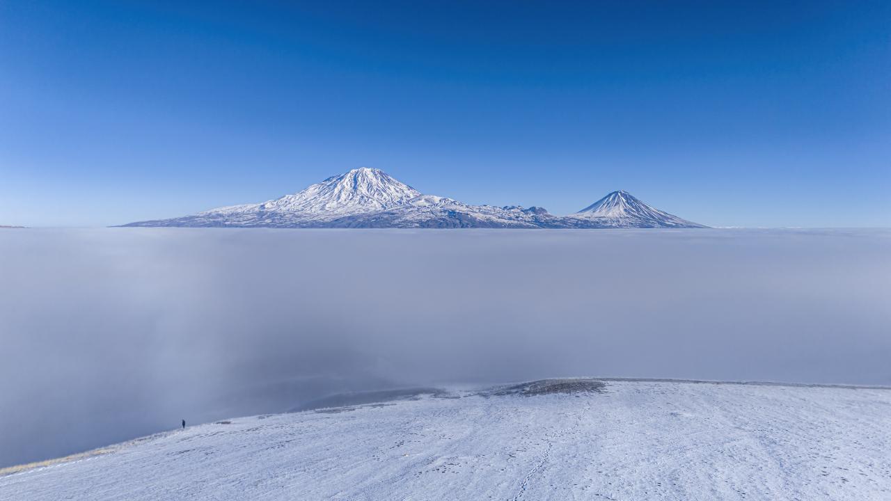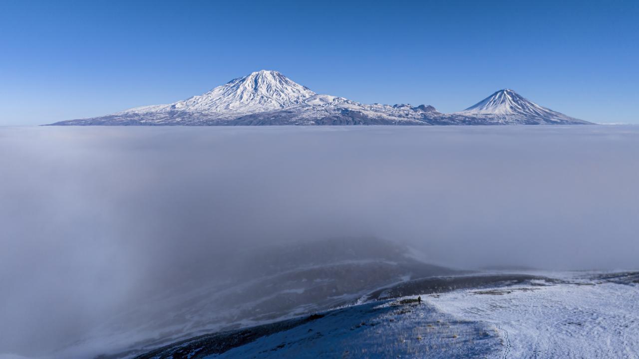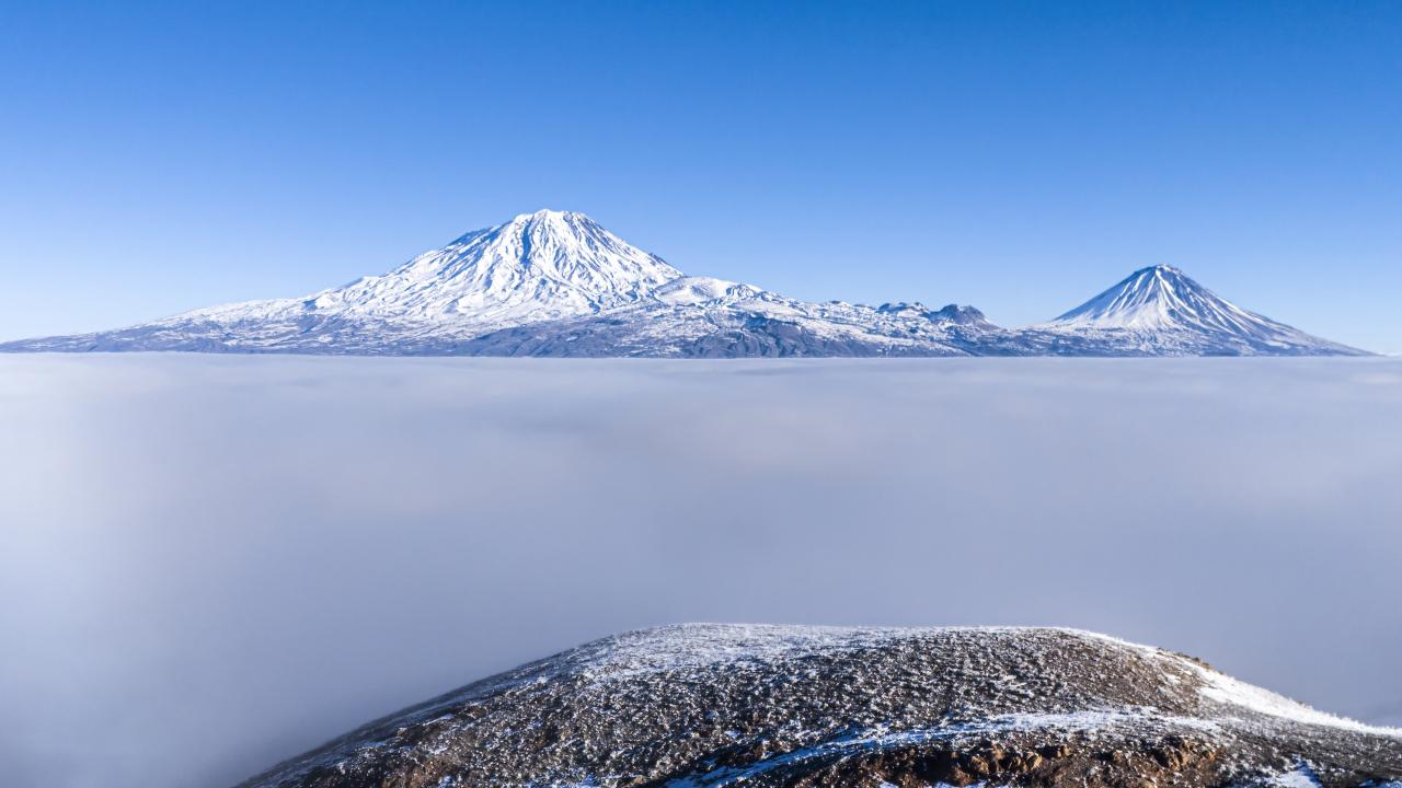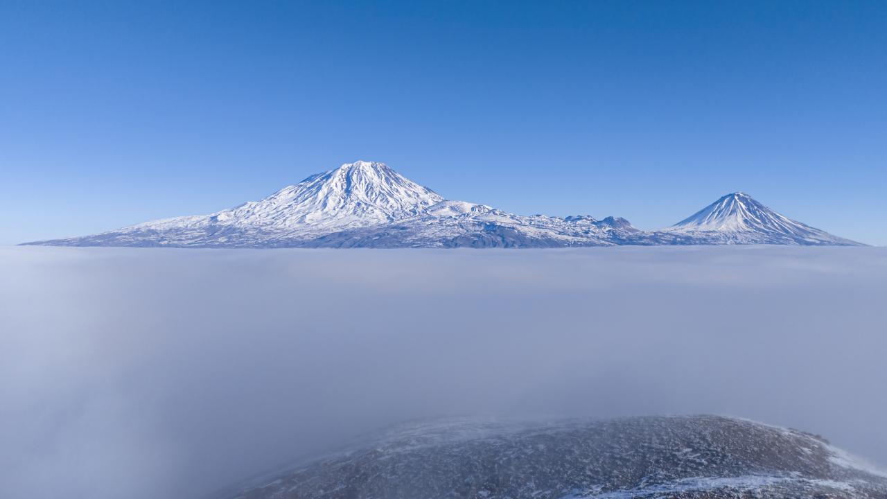 Sis bulutu üstünden Büyük ve Küçük Ağrı Dağı