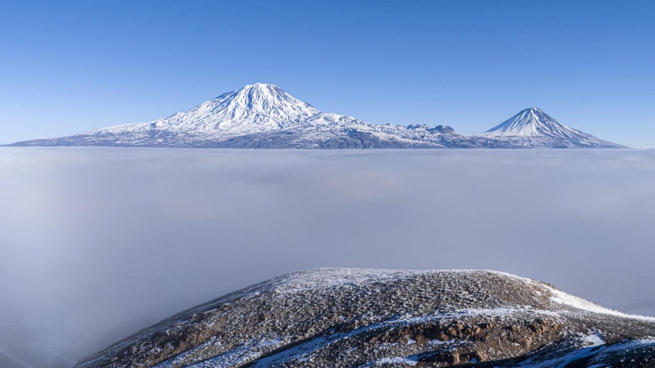 Adeta siste denizin oluştuğu bölgede sis bulutu üzerinden Büyük ve Küçük Ağrı aynı anda görüntülendi.