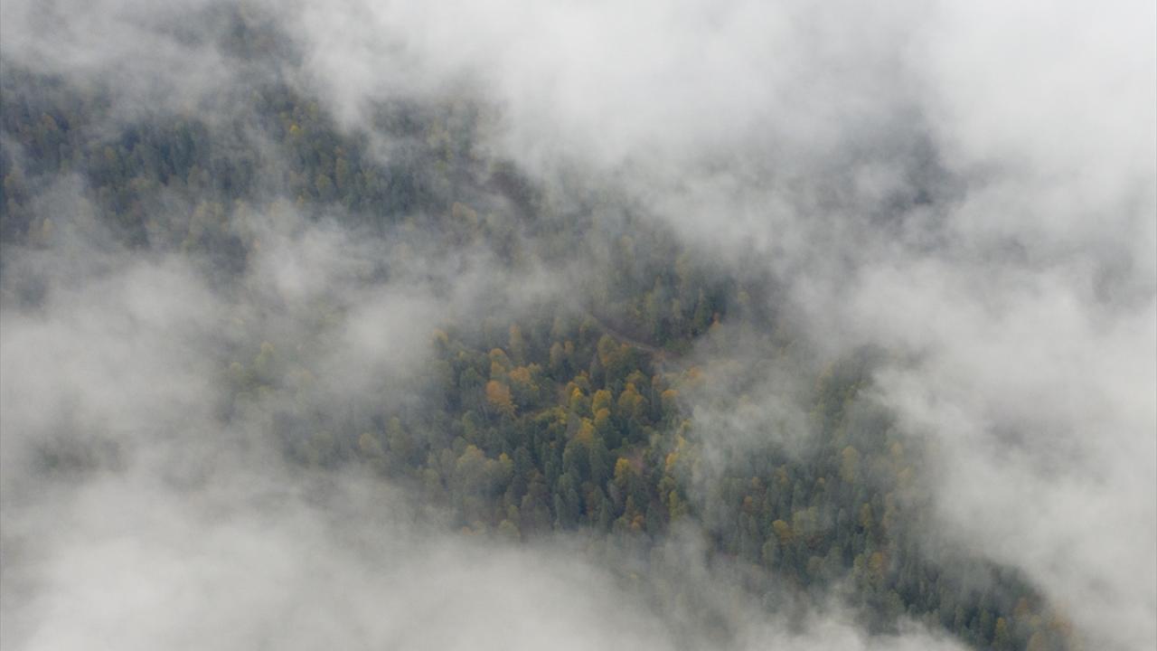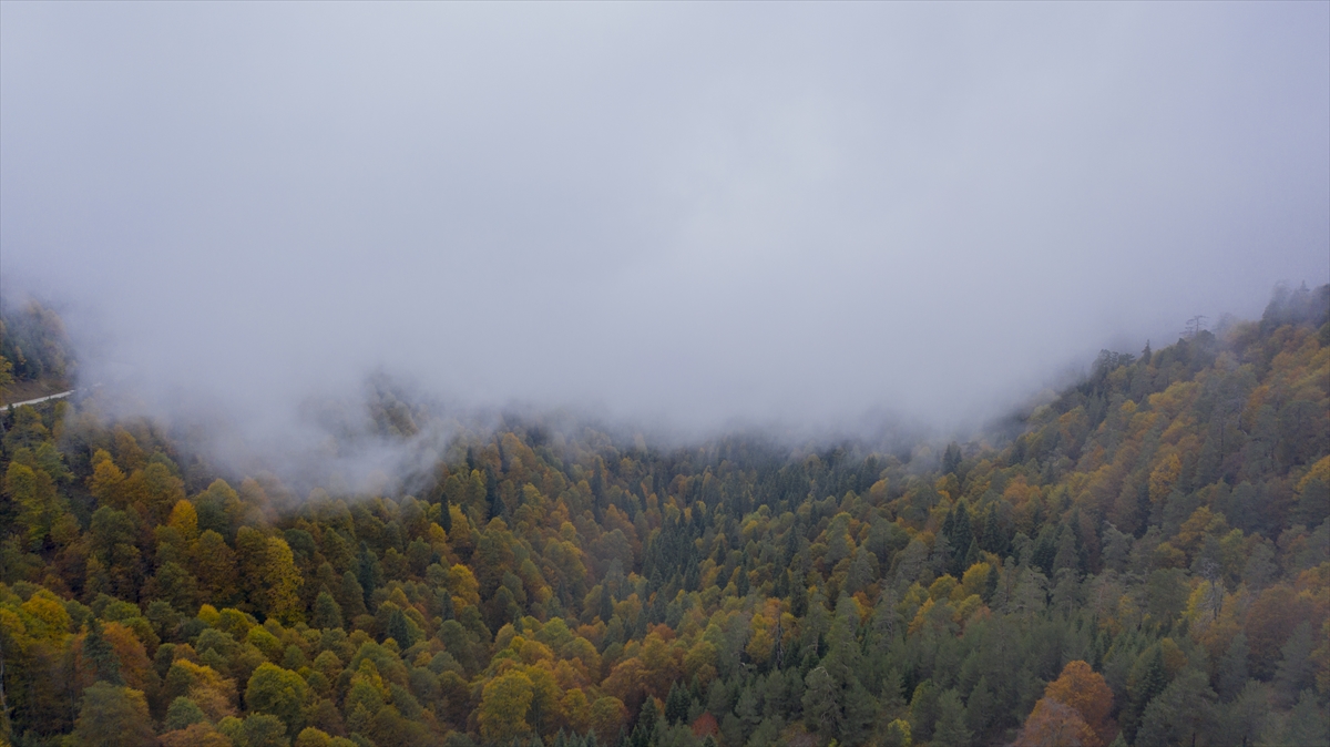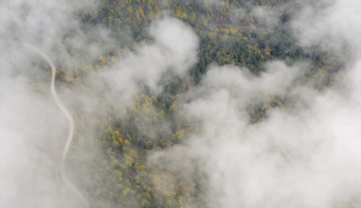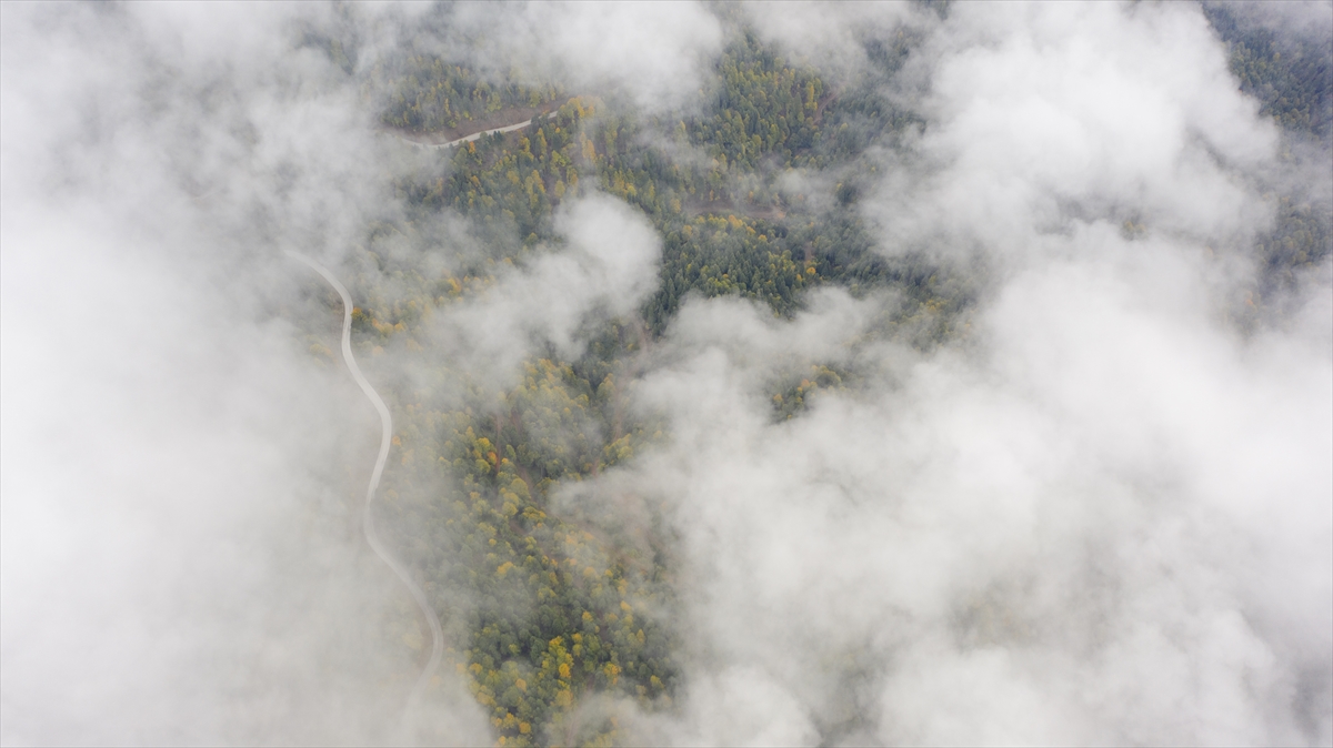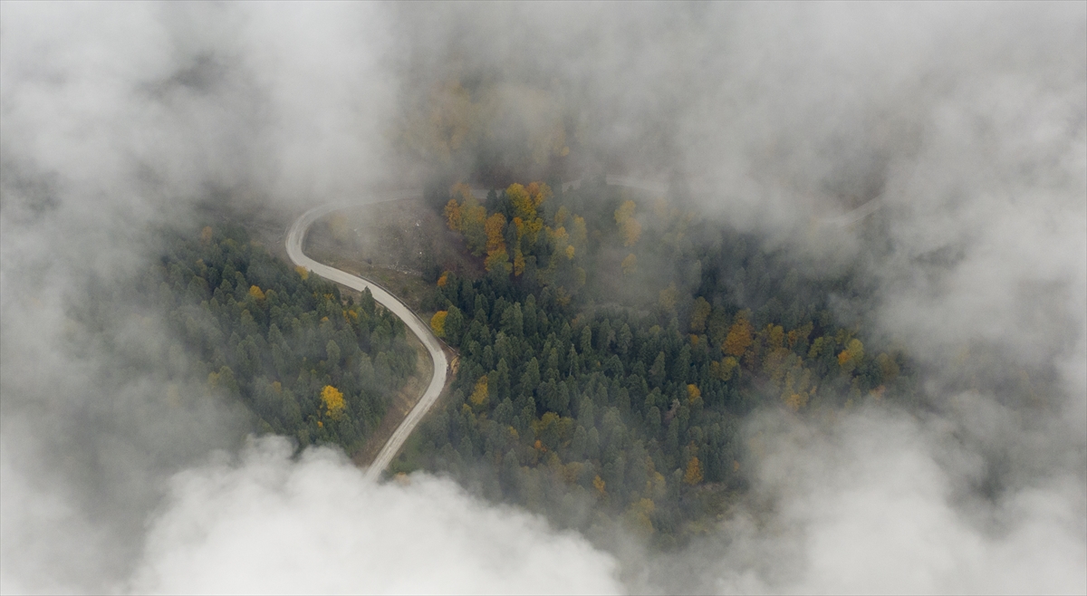 Yedigöller Milli Parkı yolu üzerinde bulunan Ayıkayası mevkisinde etkili olan sis dronla görüntülendi.