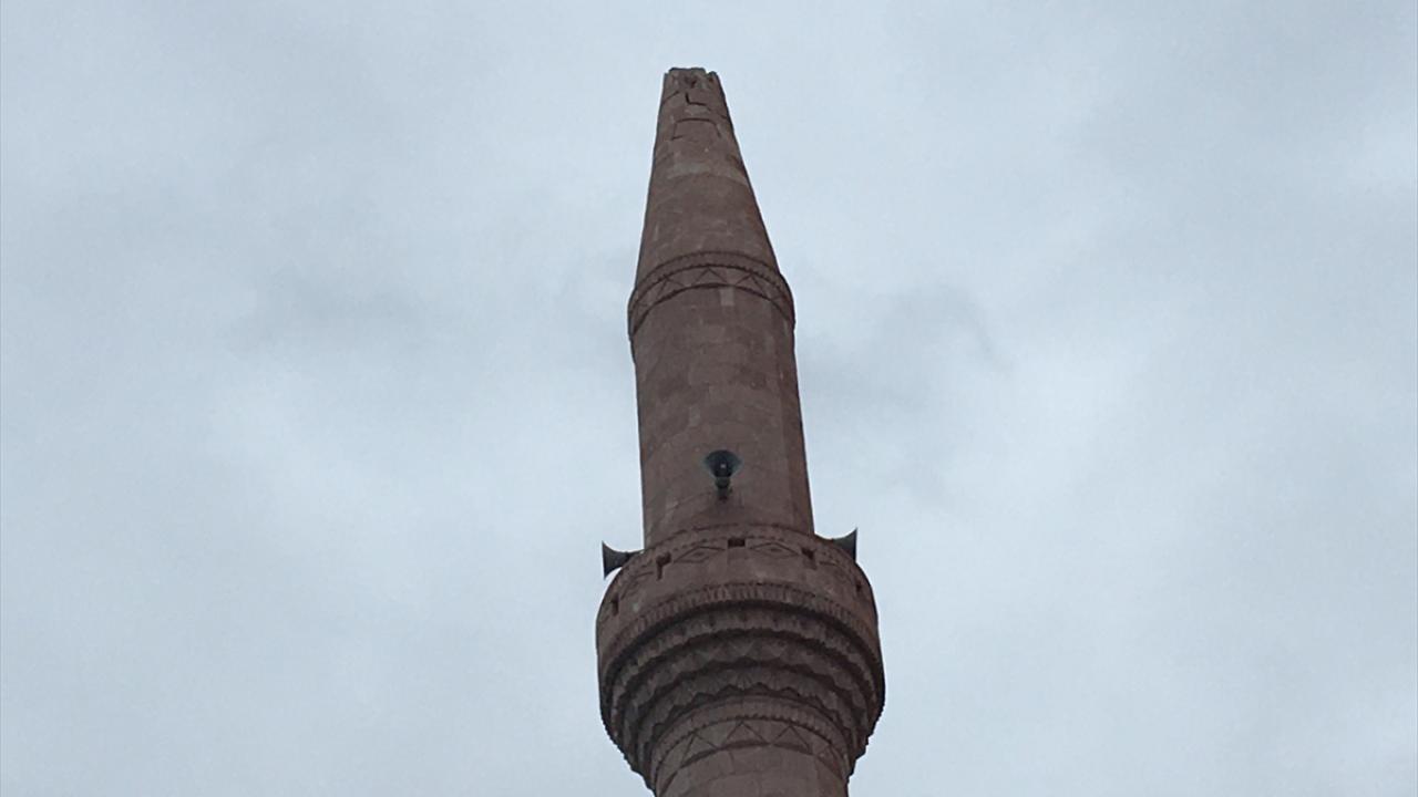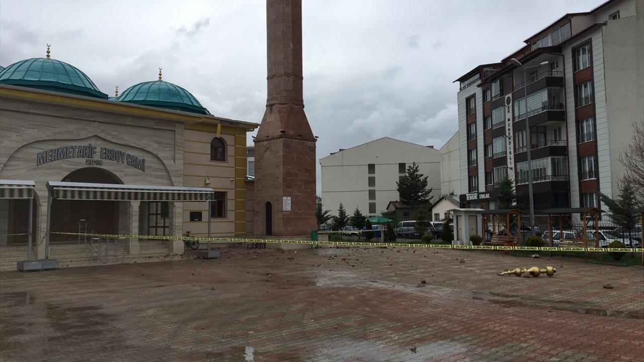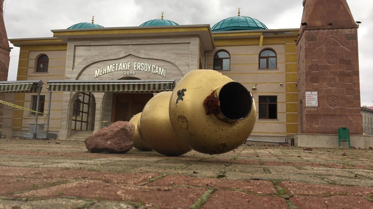 Kızılırmak Mahallesi`ndeki Mehmet Akif Ersoy Camisinin minarelerinden birine isabet eden yıldırım nedeniyle minarenin külah ve alem kısmı cami avlusuna düştü.