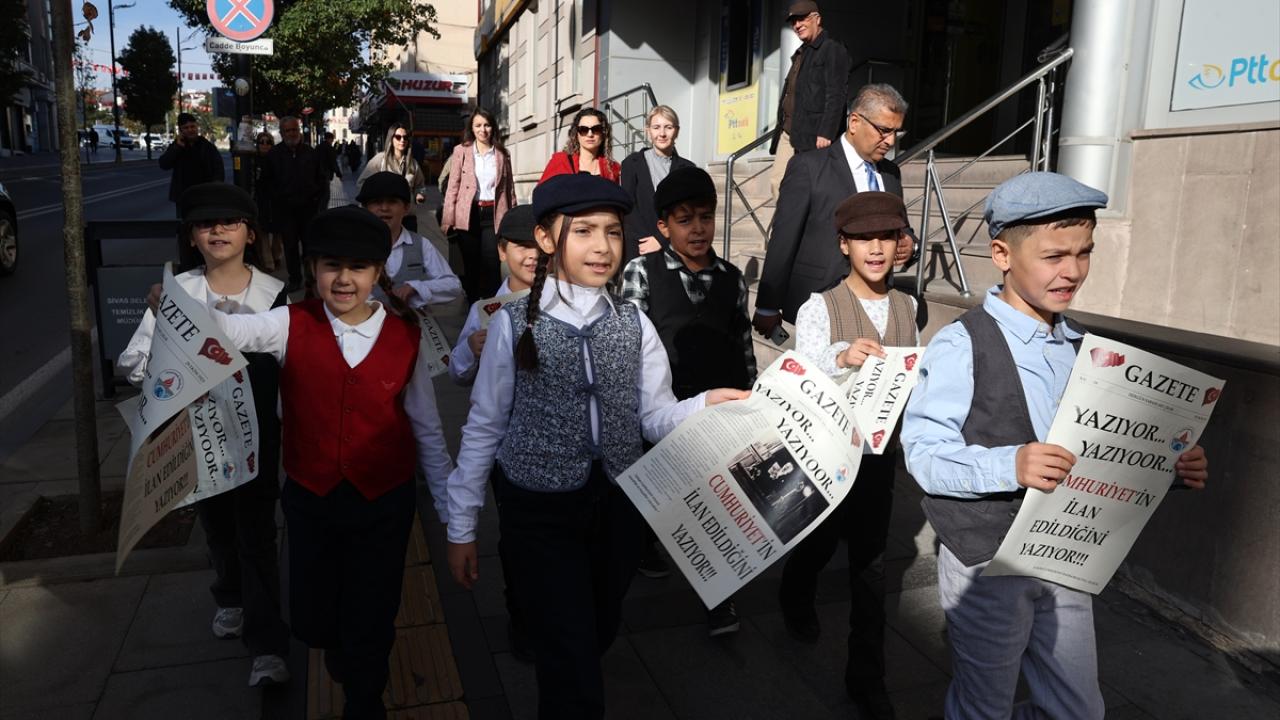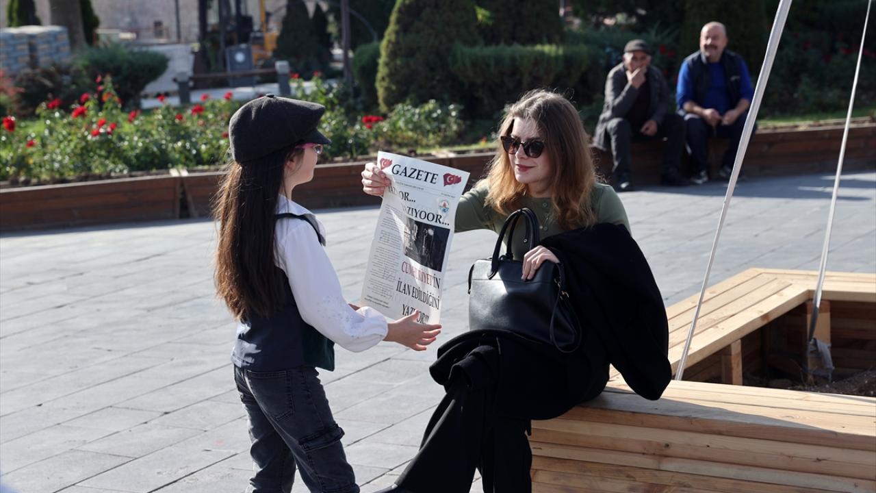 Dönemin kıyafetlerini giyen öğrenciler, Cumhuriyet Meydanı`nda "yazıyor, yazıyor" şeklinde seslenerek gazeteyi dağıttı.