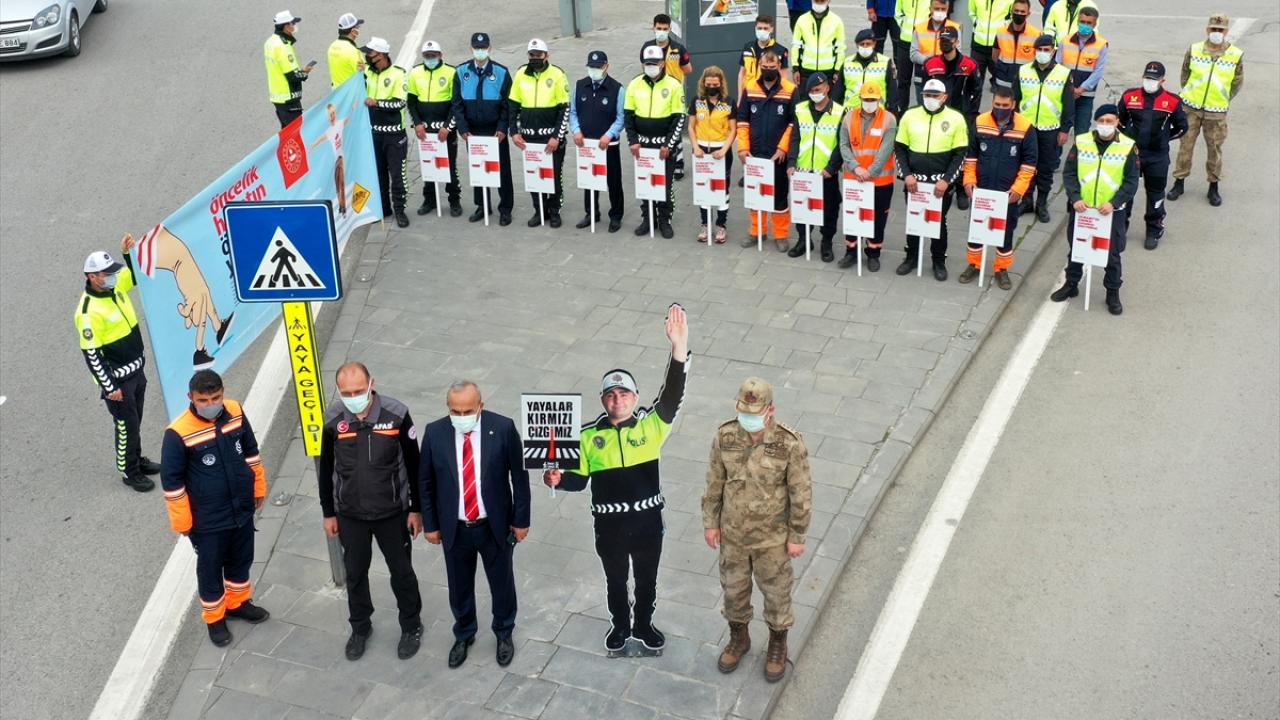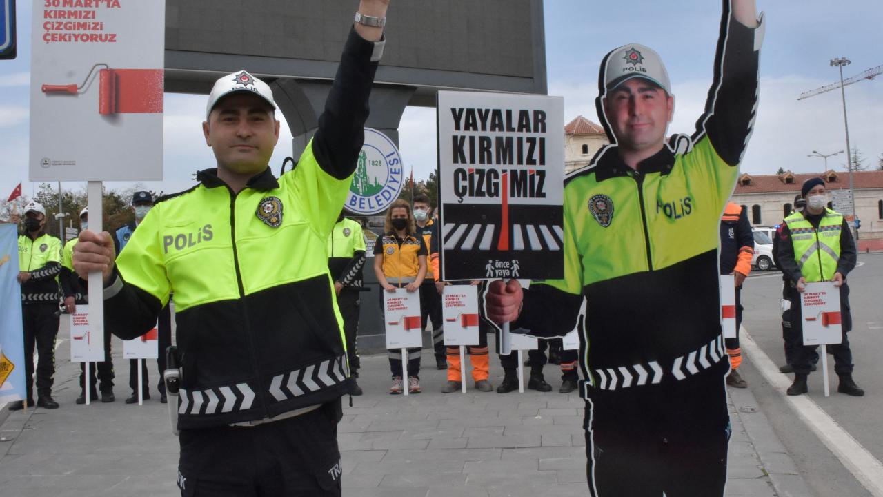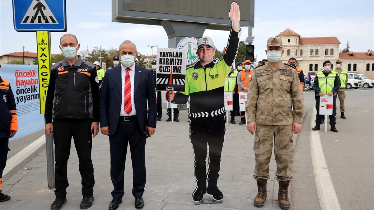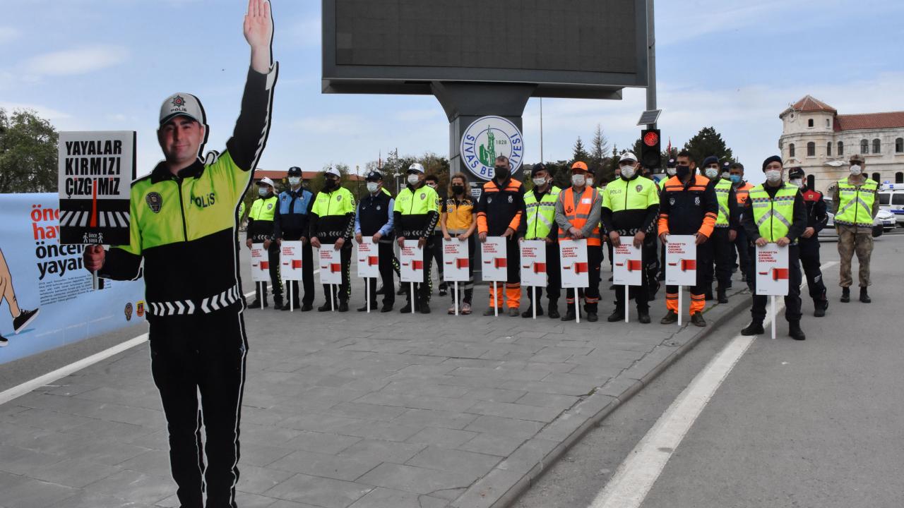 Programda, yaya güvenliğinin sağlanması ve sürücülerde yol verme bilincinin artması için yaya geçitlerine 9 adet trafik polisi maketi yerleştirildi.