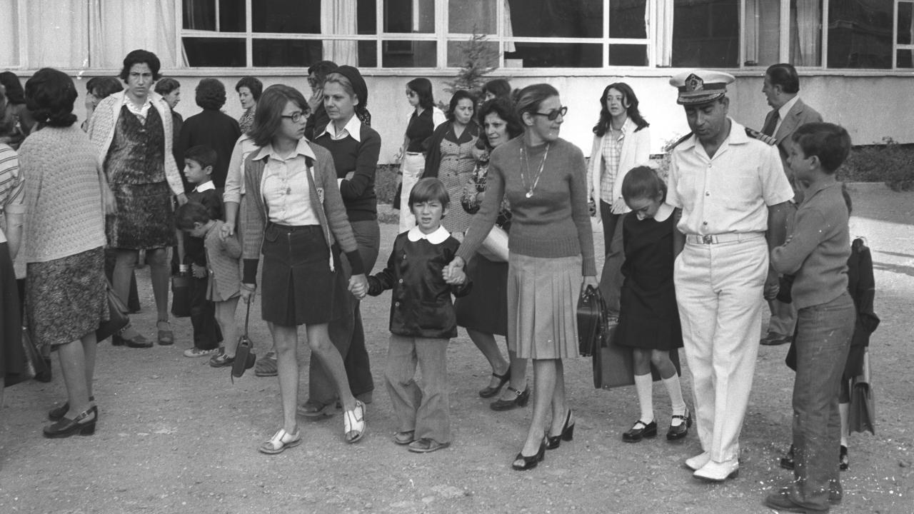 15 Eylül 1975`te yeni öğretim yılının ilk günü okula gelen öğrenci ve veliler. (Arşiv)