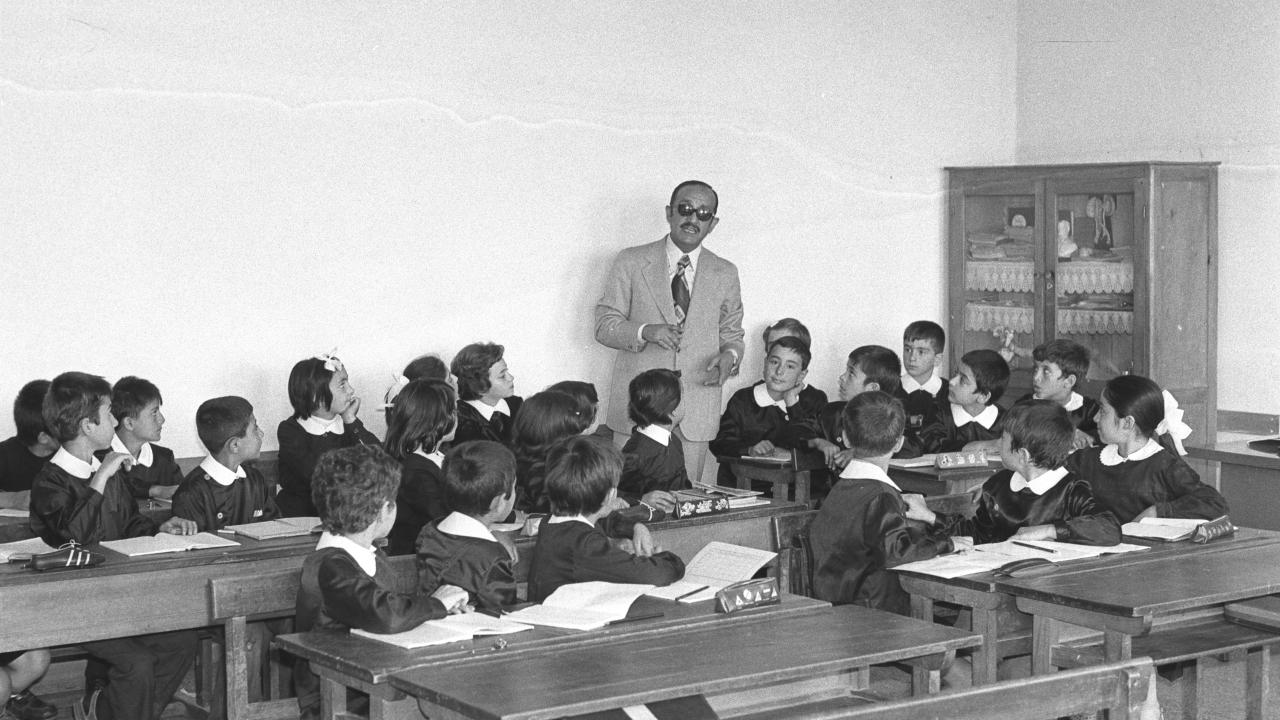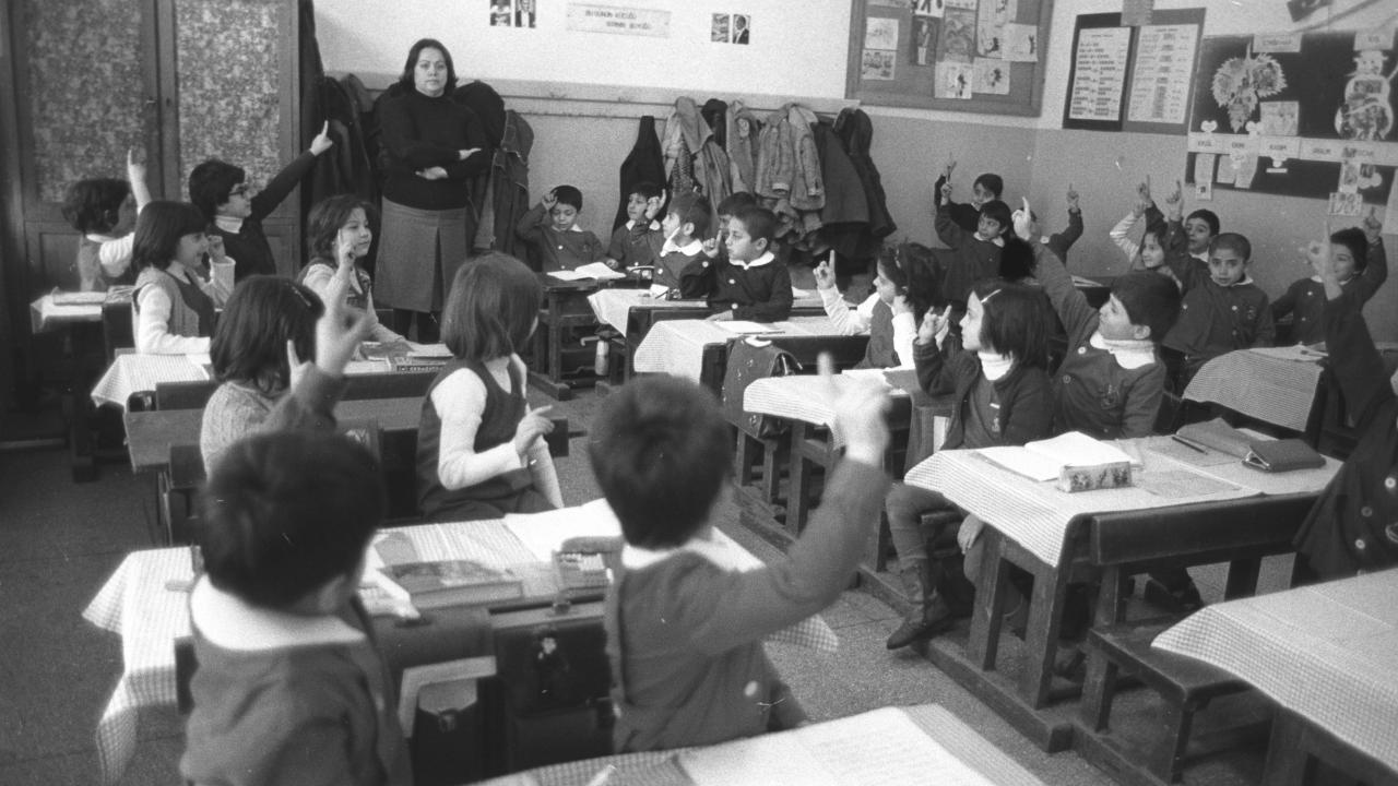15 Eylül 1975`te yeni eğitim öğretim yılının ilk günü öğretmeni dinleyen çocuklar. (Arşiv)