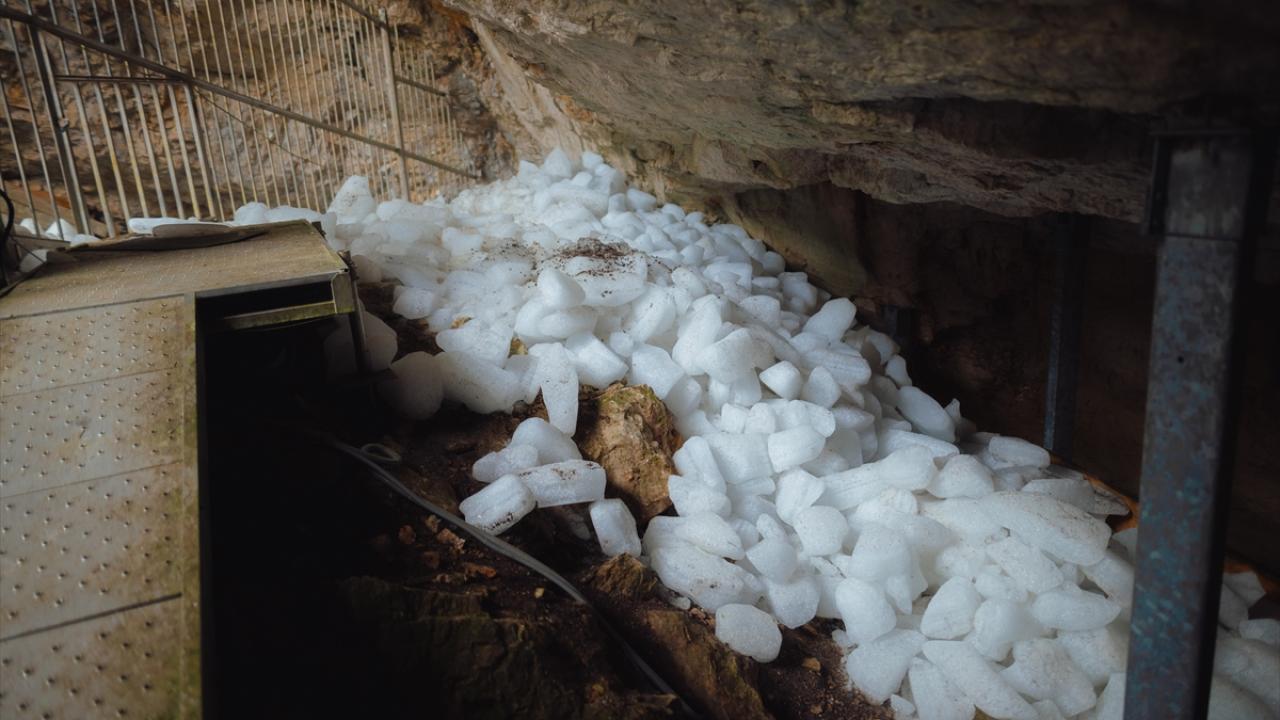 Hendekler için kırılan buzlar mağaranın girişine konularak içeriye giren sıcak havanın etkisi azaltılmaya çalışılıyor