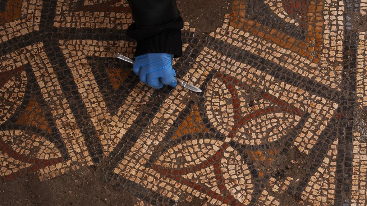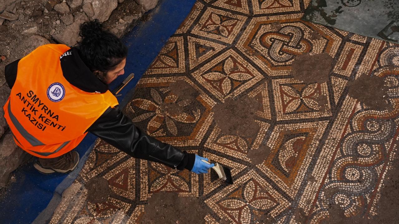 İzmir kent merkezindeki Smyrna Antik Kenti'nde yürütülen kazı çalışmalarında ortaya çıkarılan mozaikli odada yer alan "Süleyman düğümü" motifi, kazı ekibinin ilgisini çekti.